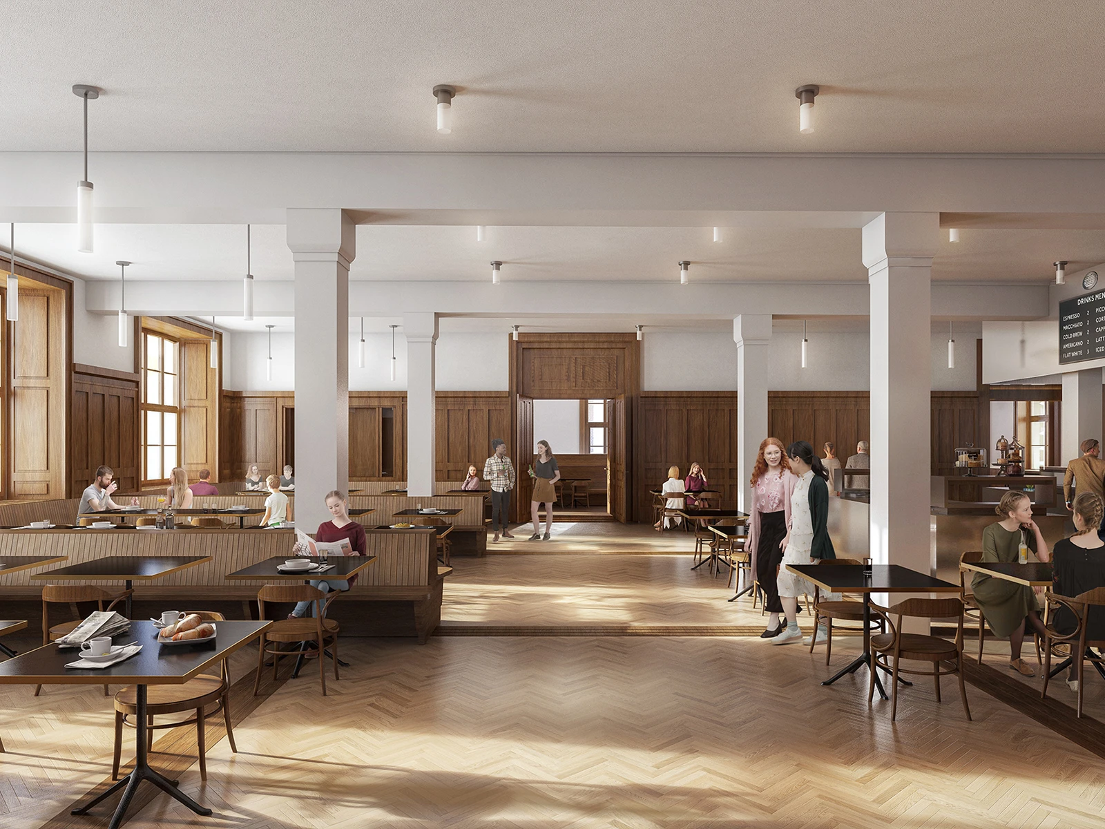 The proposal converts the old Zurich military barracks into an education centre, open to public use on the ground level and developing around a new atrium space.