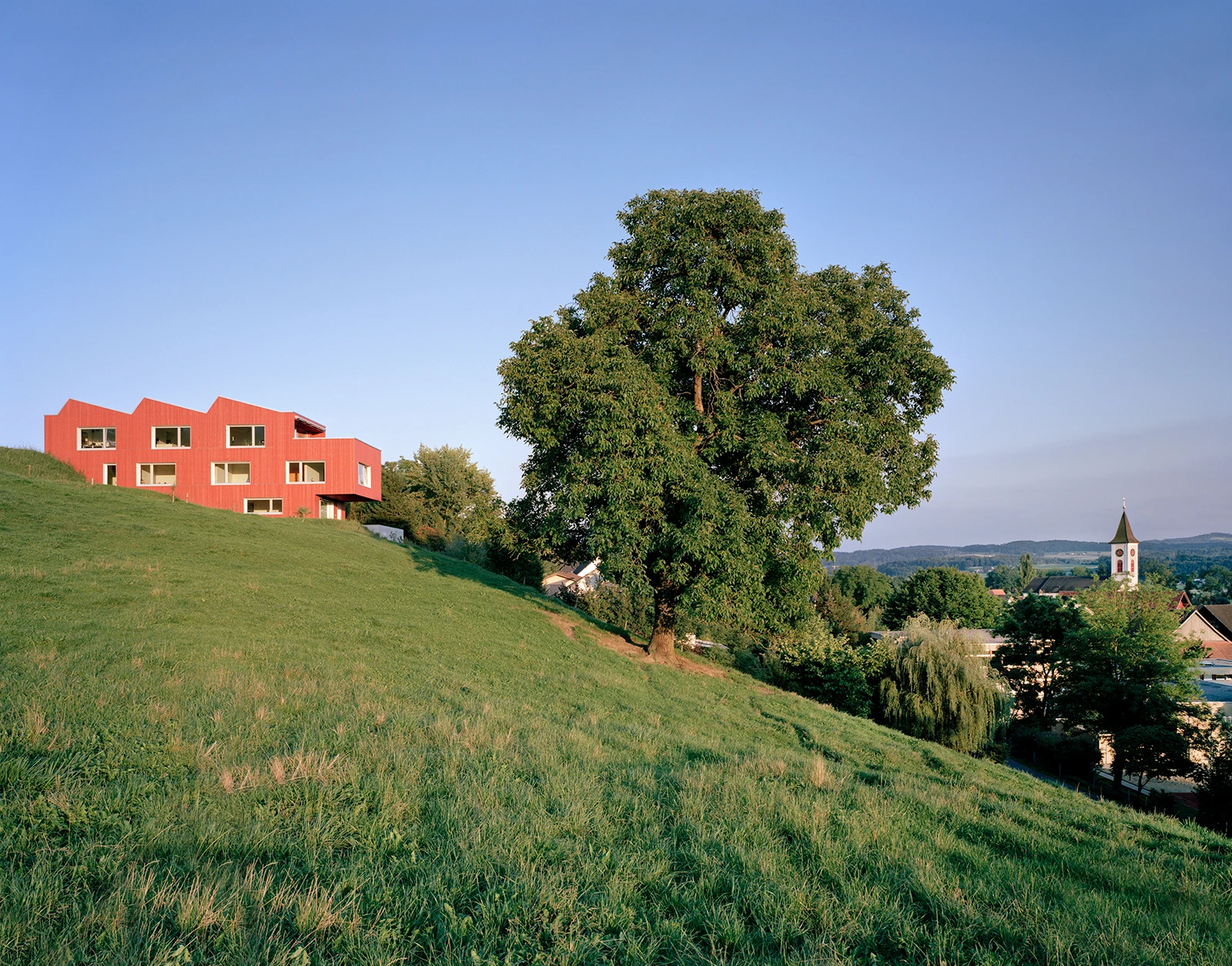 A house sits on an incline at the periphery of Üsslingen. The home is built as a sustainable, prefabricated timber structure atop a pre-cast concrete basement.