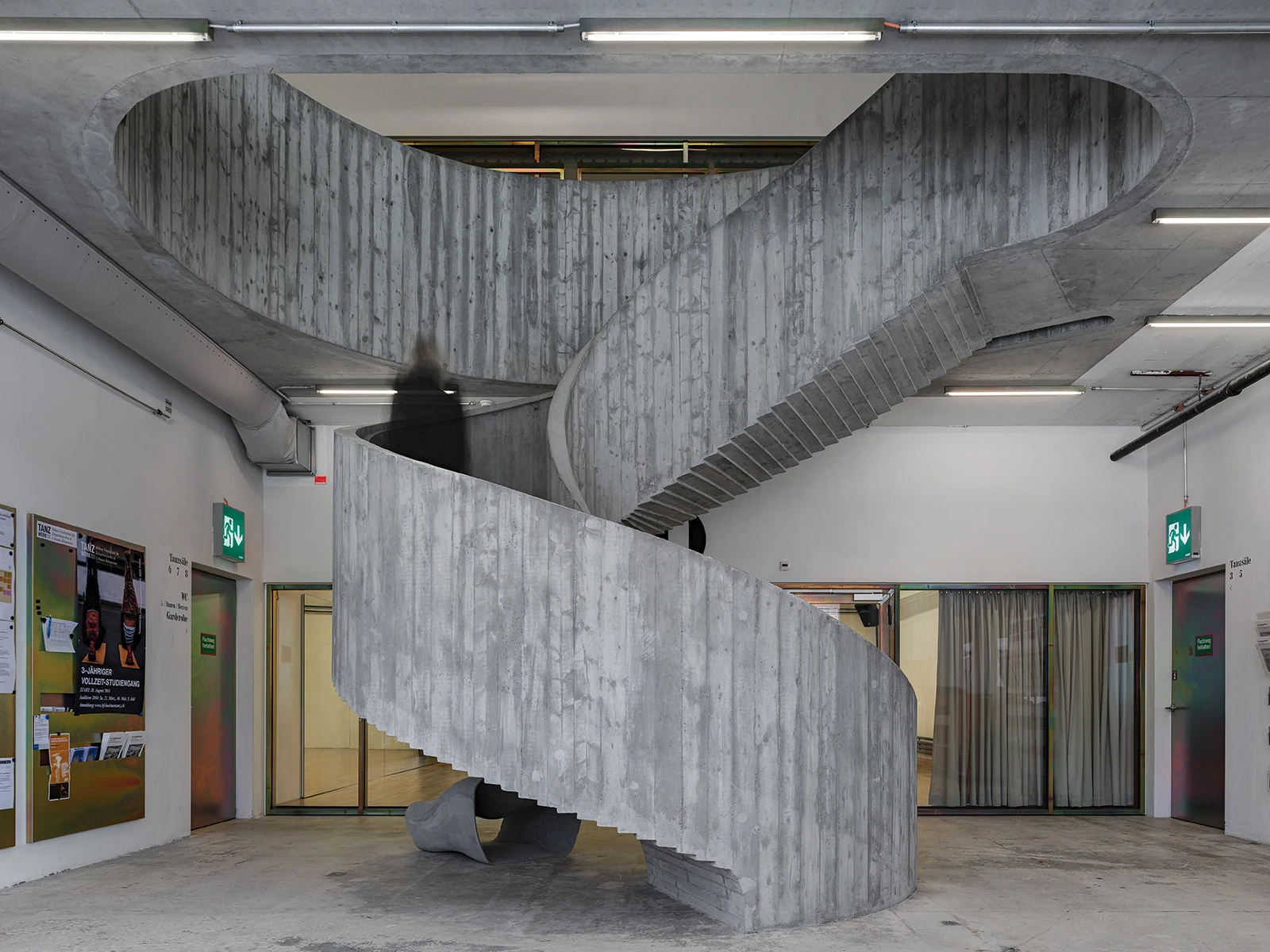 Tanzwerk houses the kinesthetic program of Switzerland’s largest dance school, dividing the space into 12 dance studios, a large performance auditorium and workrooms with various service areas.