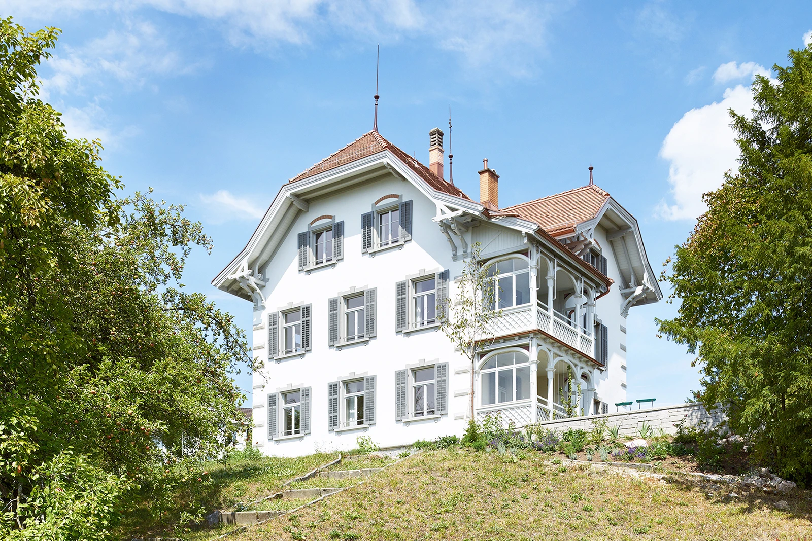 The listed Haus Zur Sommerau stands on a ridge next to school buildings, a community center, and the Uetikon church hill. The property is defined by its large garden reminiscent of grand bourgeois residences.