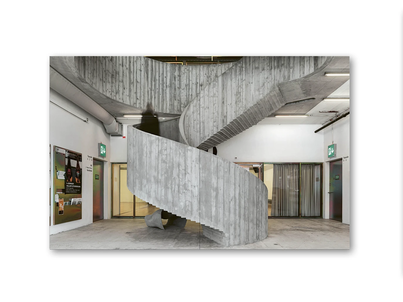 The sculptural, monolithic spiral staircase of the Zurich Tanzwerk or the residential buildings in Zurich-Oerlikon and Erlenbach – all monoliths with sculptured roofs are based on a pragmatic, poetic approach. Spillmann and Echsle’s impressive powers of observation often allow them to re-stage the given. As in the Google interior fit-out or the Noerd commercial building, they celebrate the beauty of raw concrete and openly display technical installations over the exposed structure.