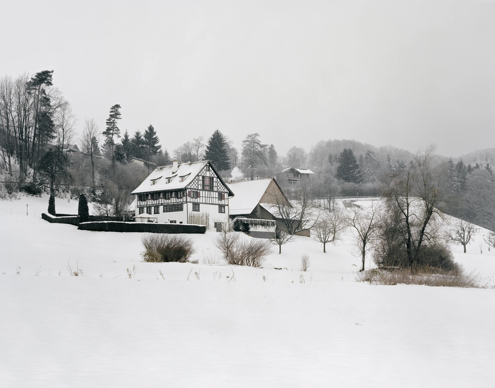 A house sits on an incline at the periphery of Üsslingen. The home is built as a sustainable, prefabricated timber structure atop a pre-cast concrete basement.