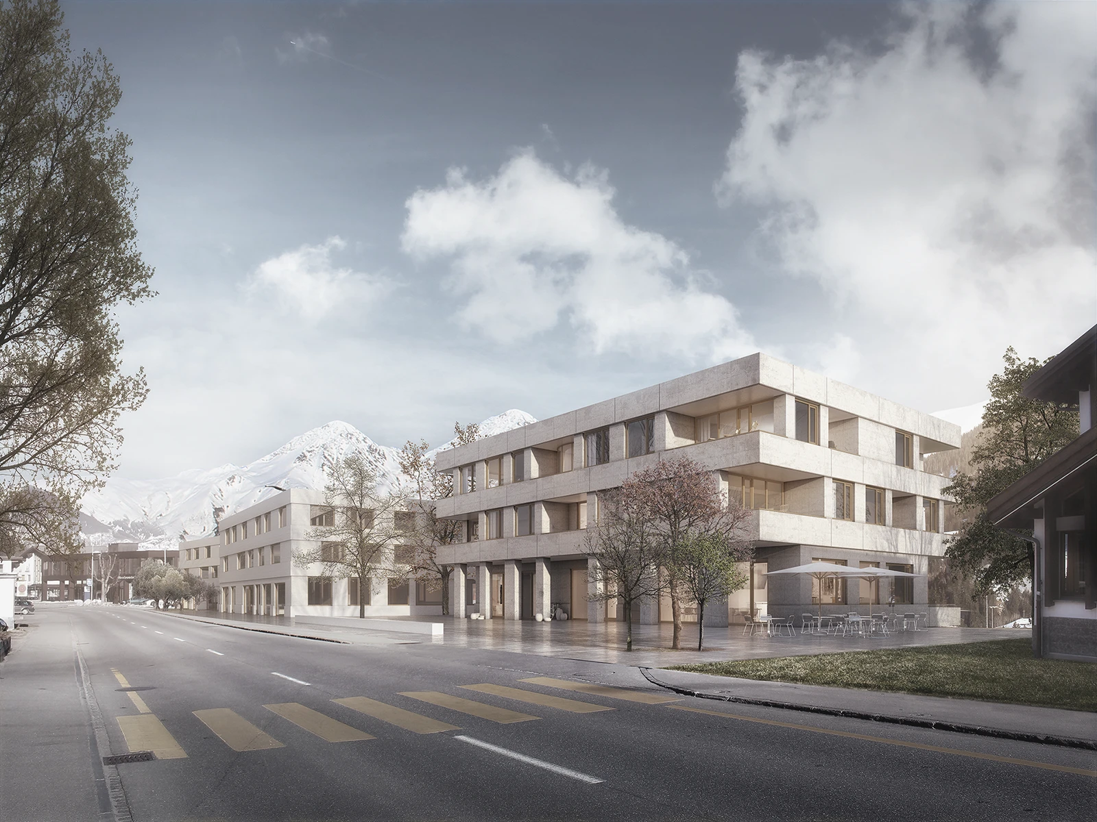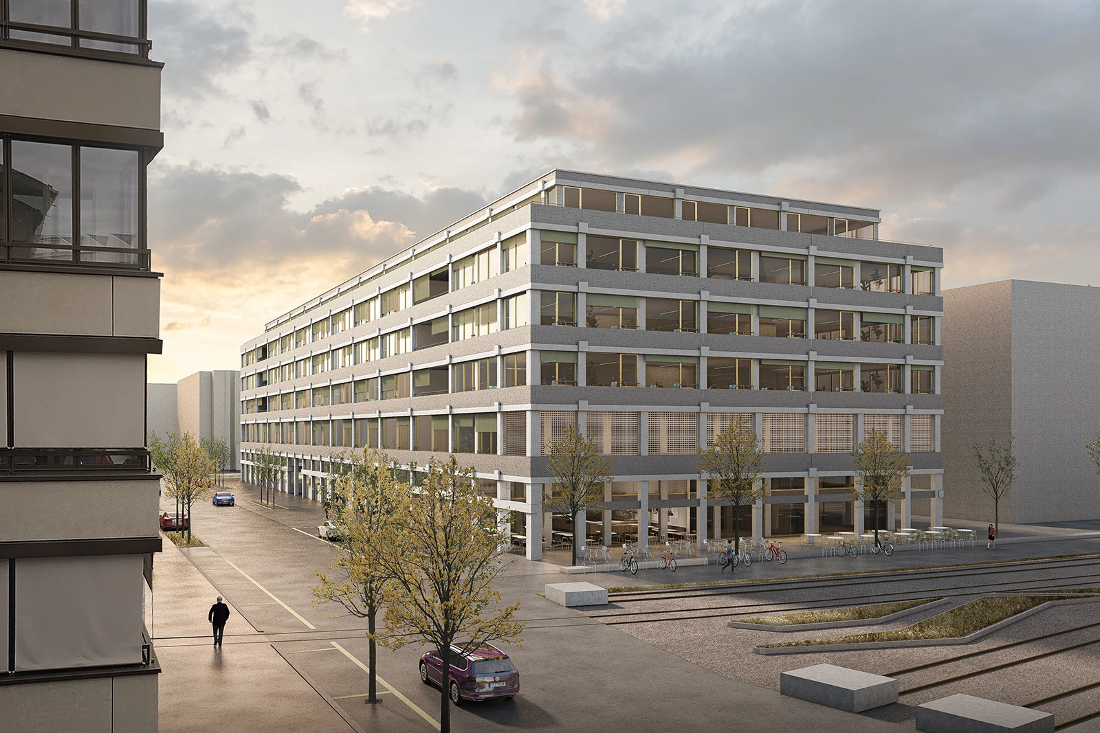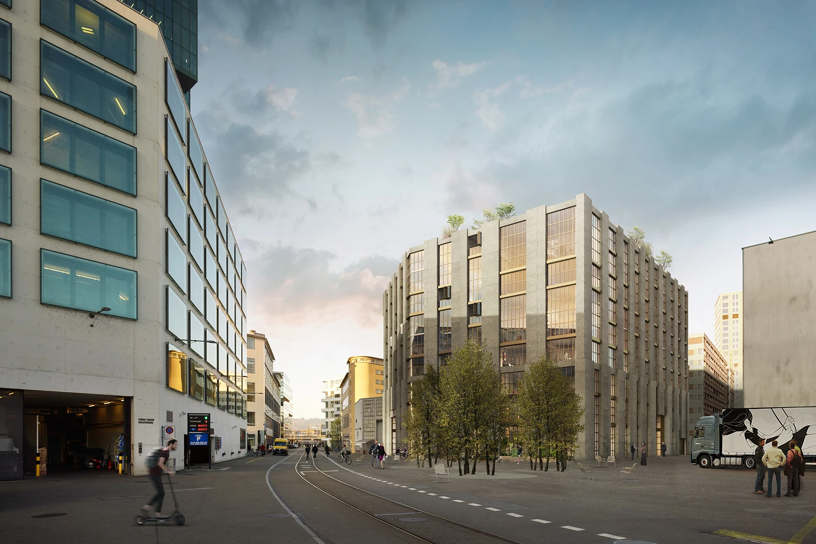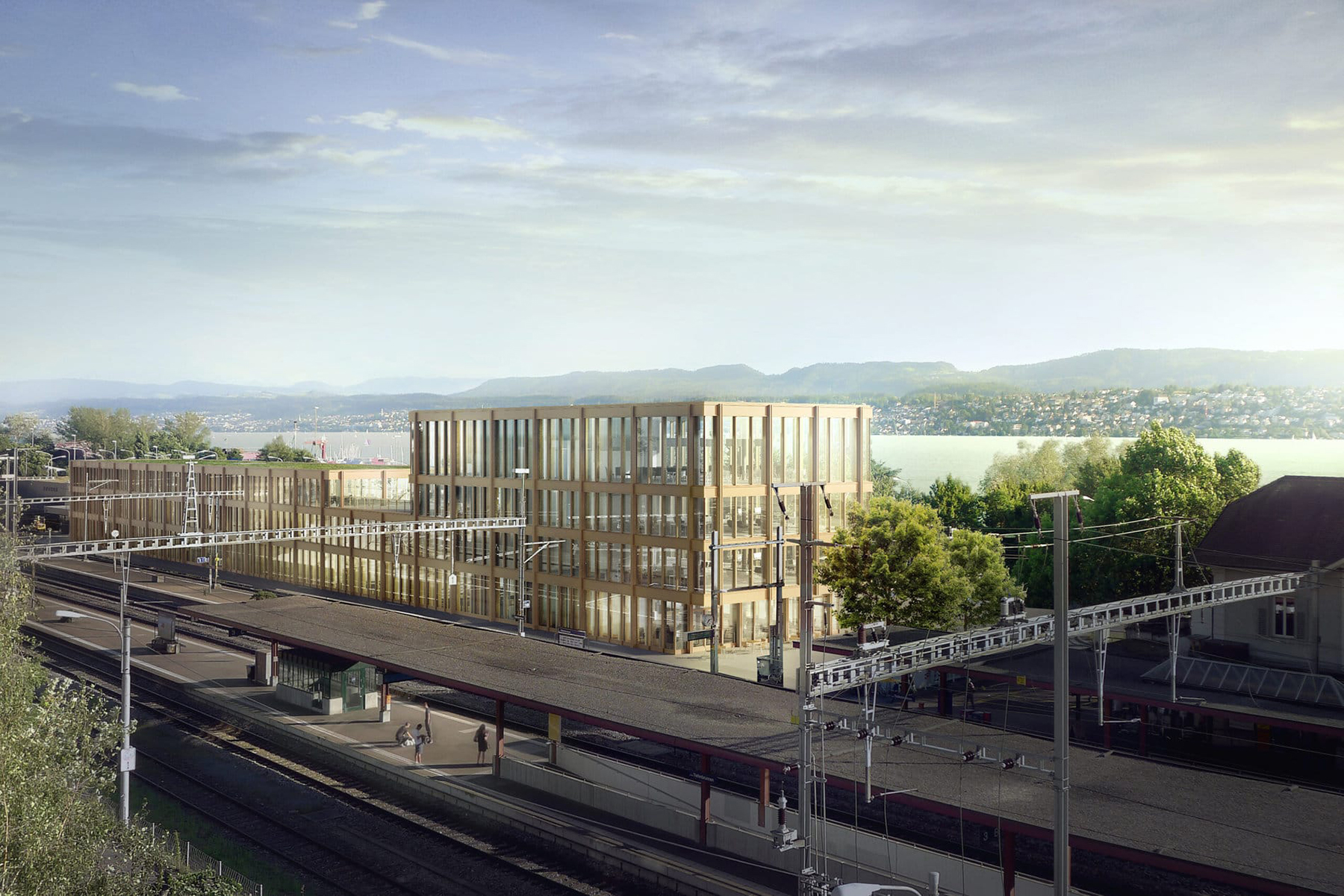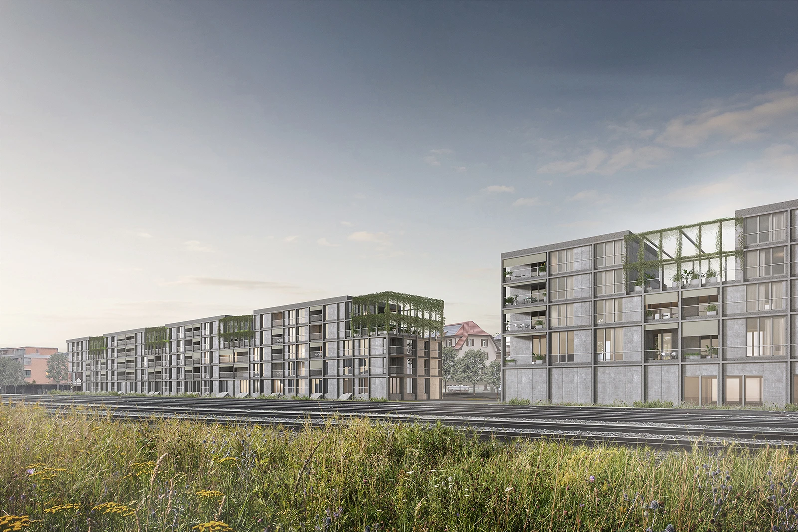 In line with the Wettingen Gestaltungsplan, the project presents an updated urban identity with rhythmically structured roofscapes that improve urban connections to the adjacent railway area.