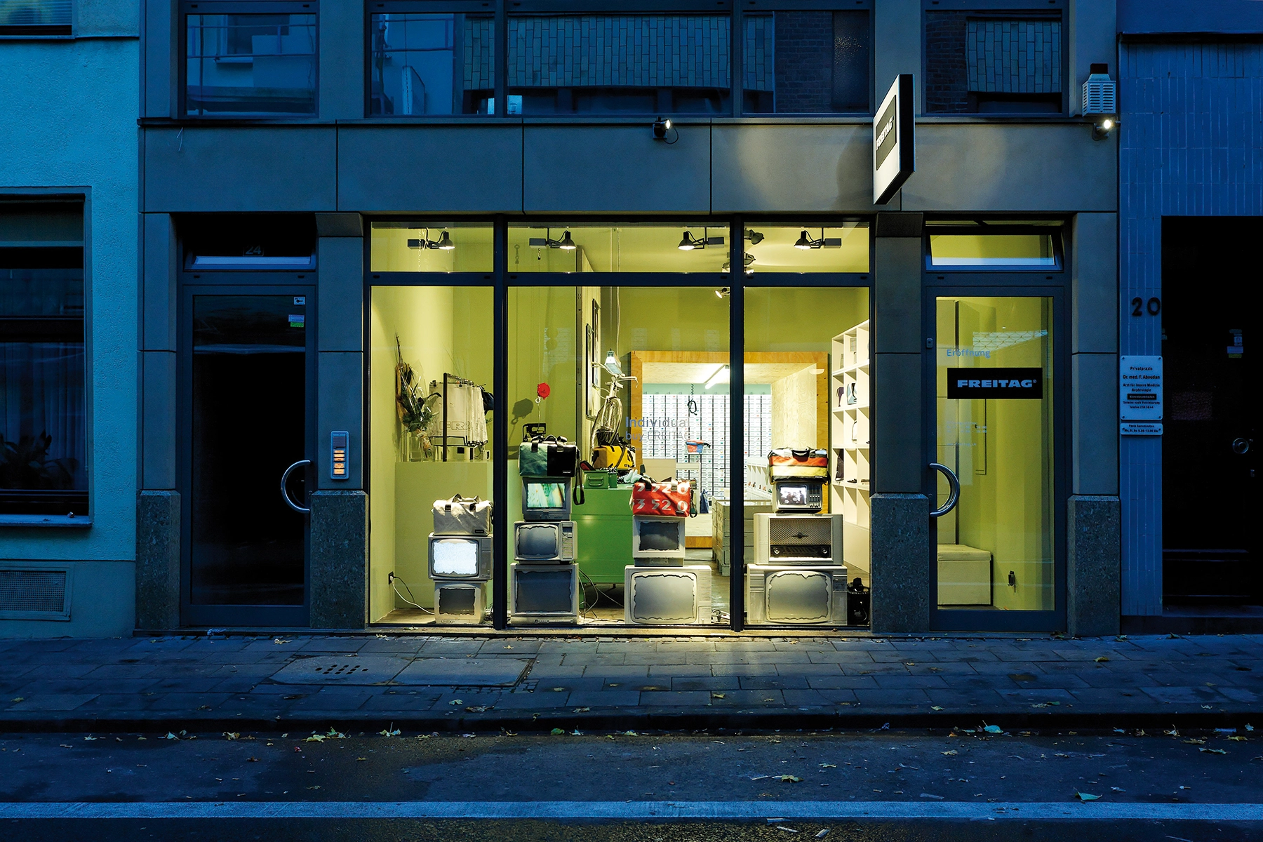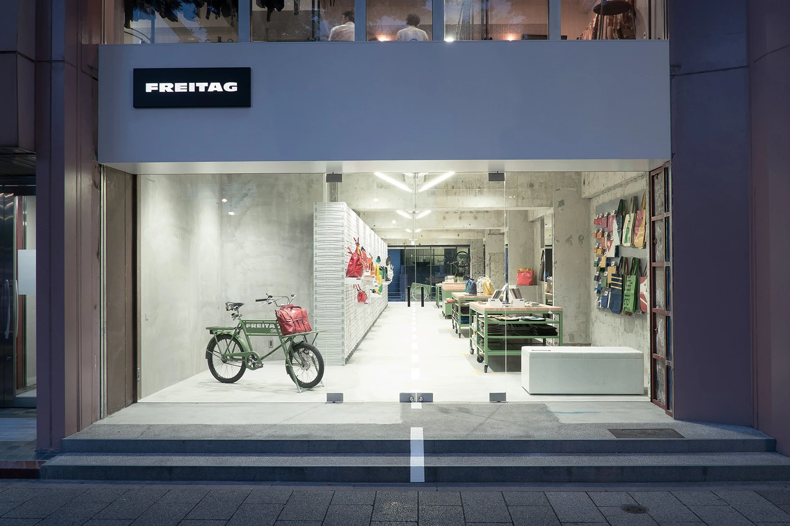 Set in Shibuya, a busy shopping and fashion district, the Freitag Store Tokyo capitalizes on a unique opportunity to connect two streets and provide shopfronts on both sides.