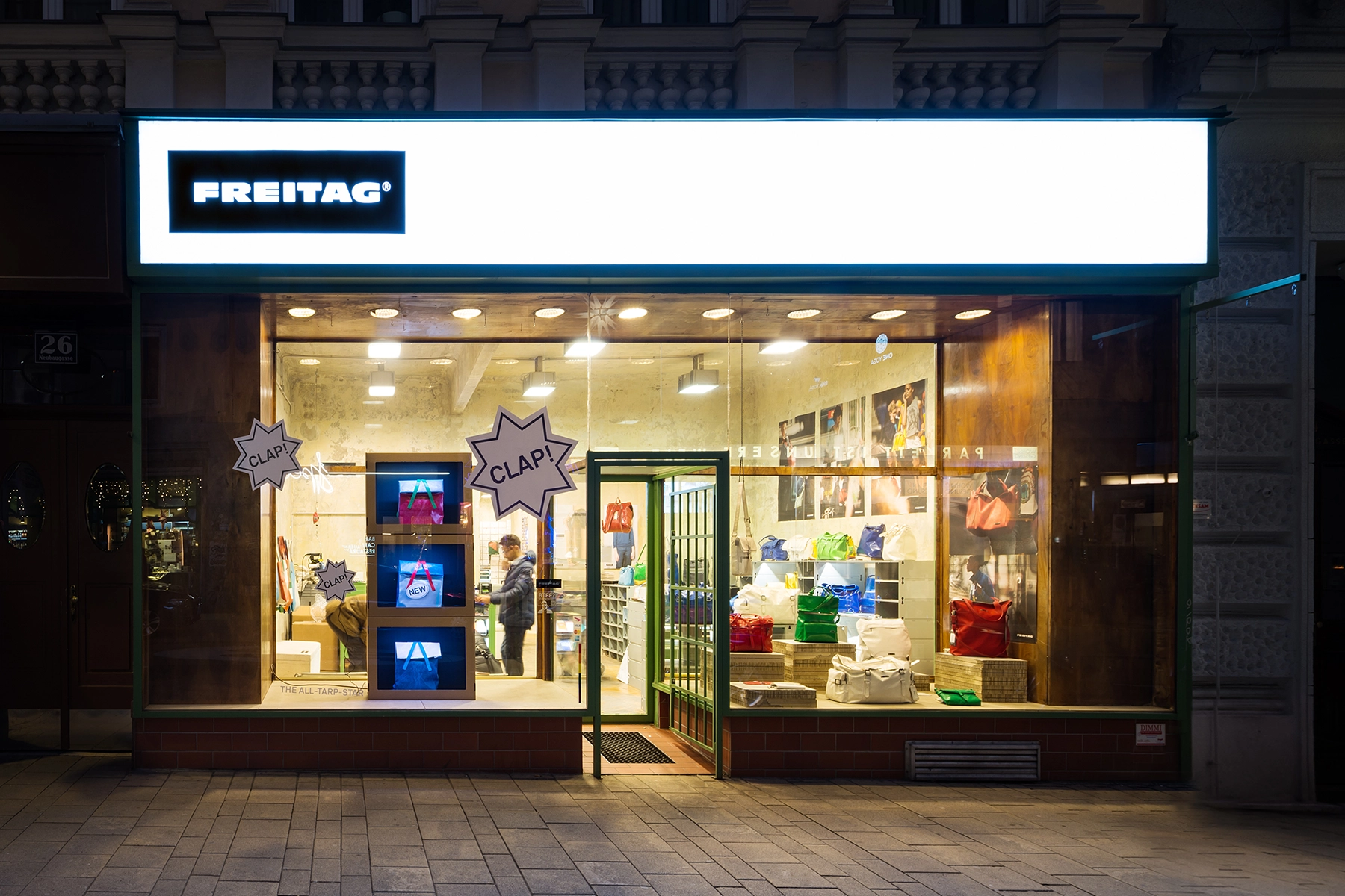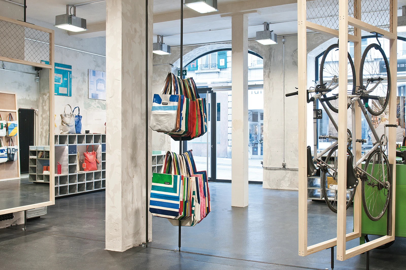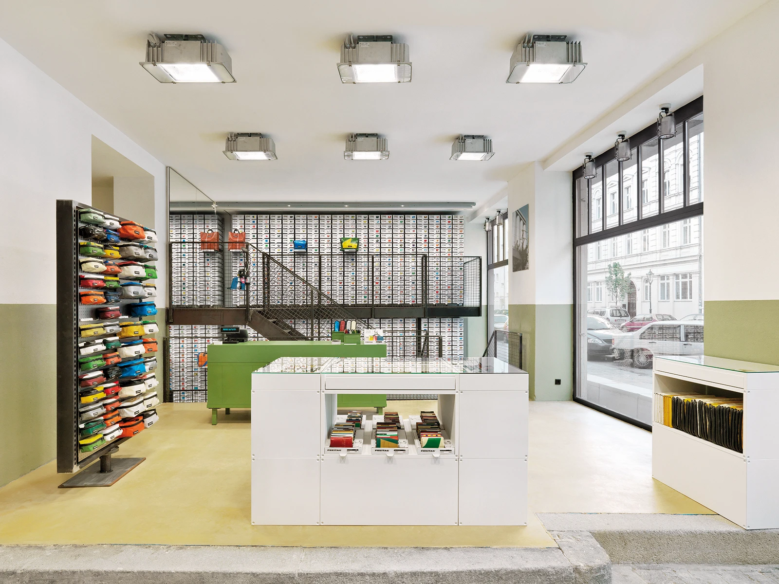Located on Rue Neuve in Lausanne, the Freitag Shop displays trademark spatial concepts designed for the brand by spillmann echsle.