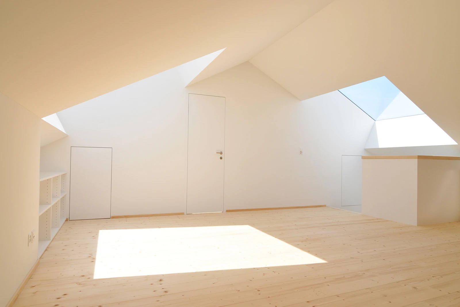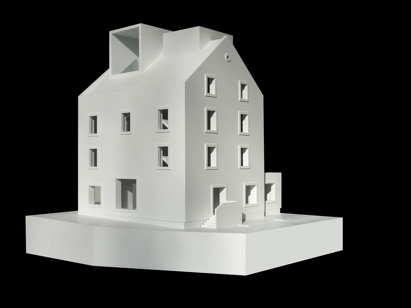 Sitting on a solid base, the compactly organized building is structured with gentle tectonic offsets and visually merges with the attic.