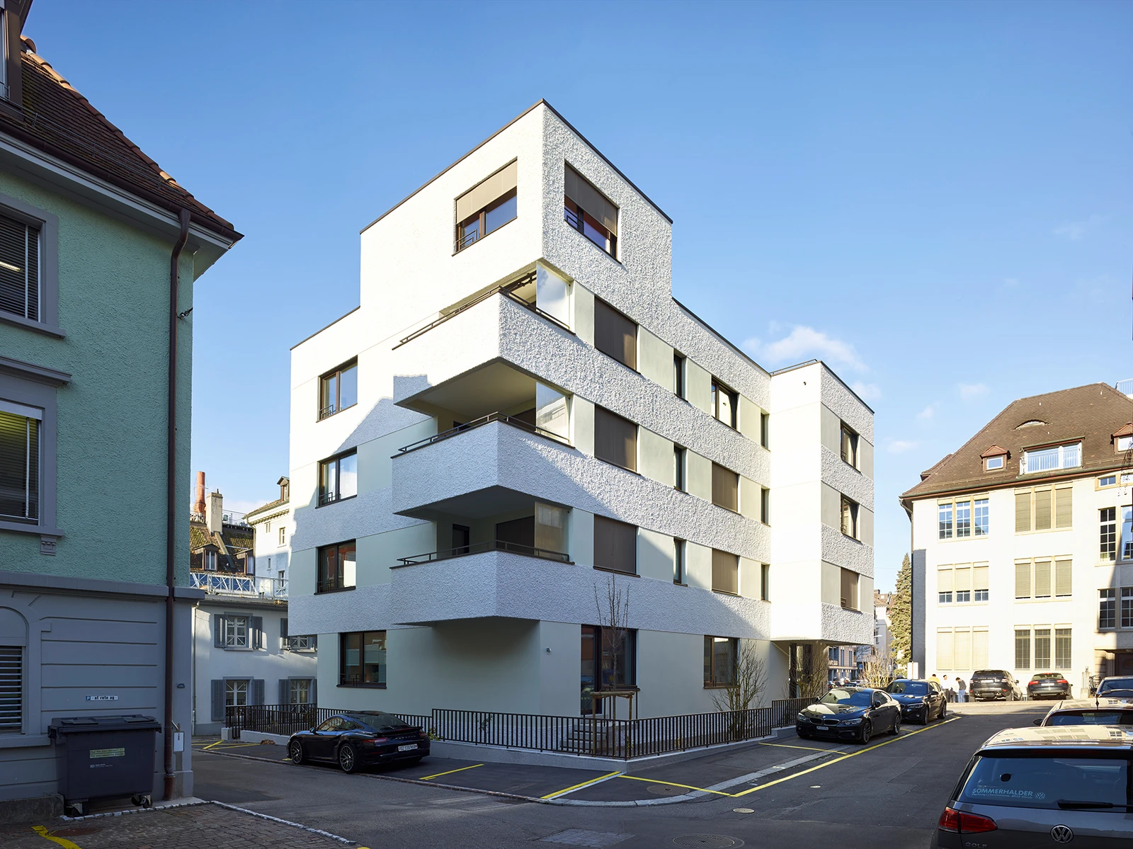 A prominent building on Falkenstrasse in Zurich near Stadelhofen Station has its form expanded onto the courtyard.