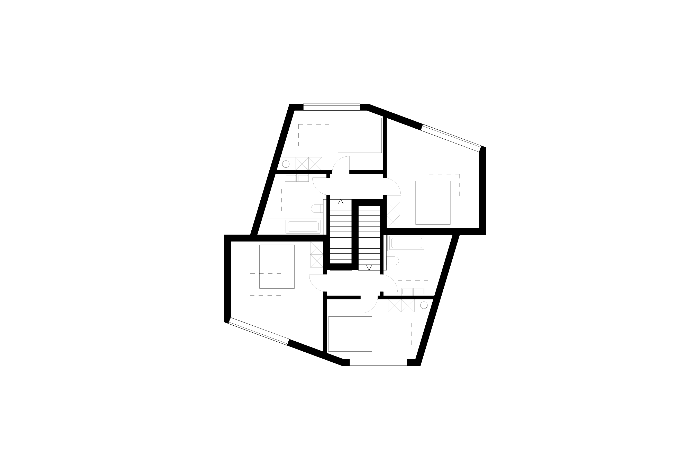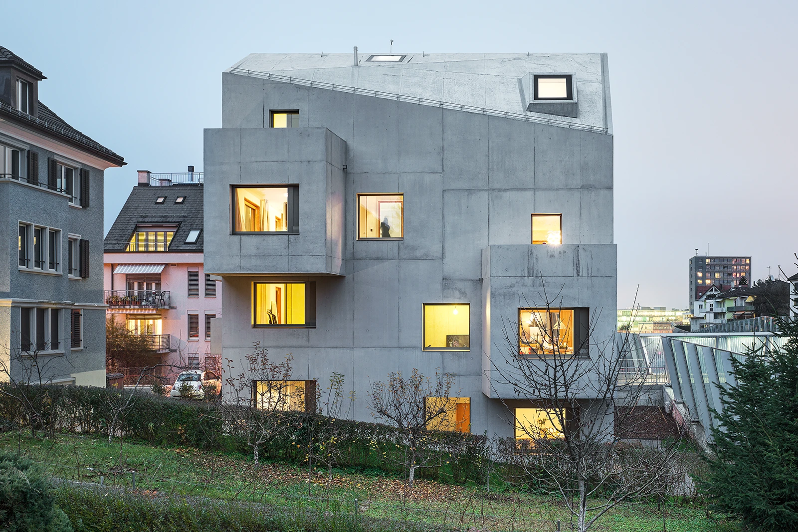 At the Zurich-Oerlikon railway bank, high-noise reduction requirements dictated the selection of a solid construction method for a new apartment building. The single-shell, exposed concrete structure houses four residential units articulated around a central core.