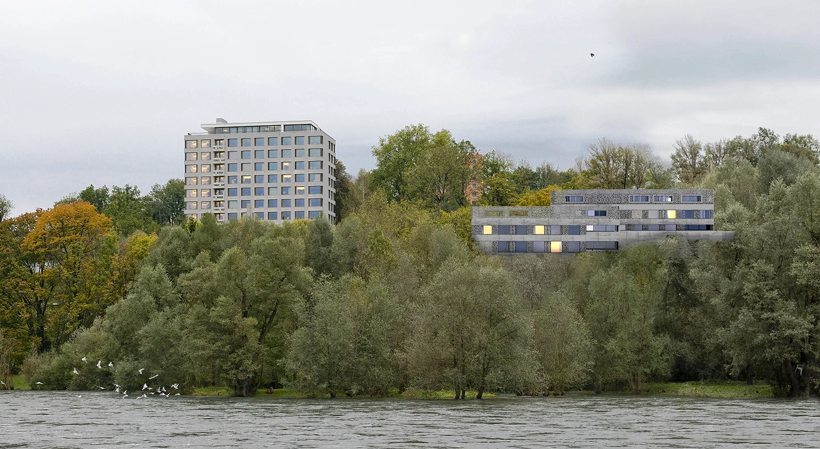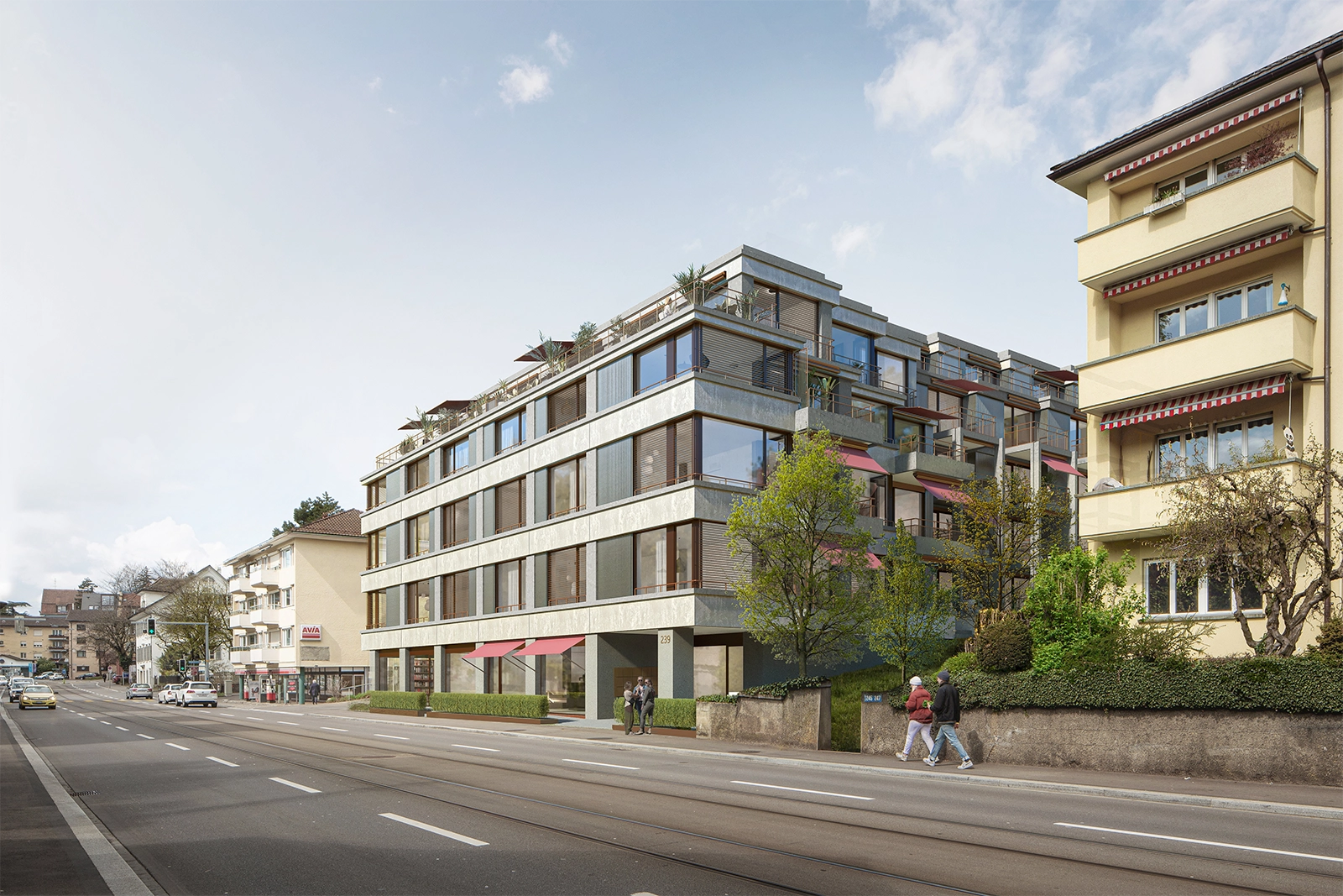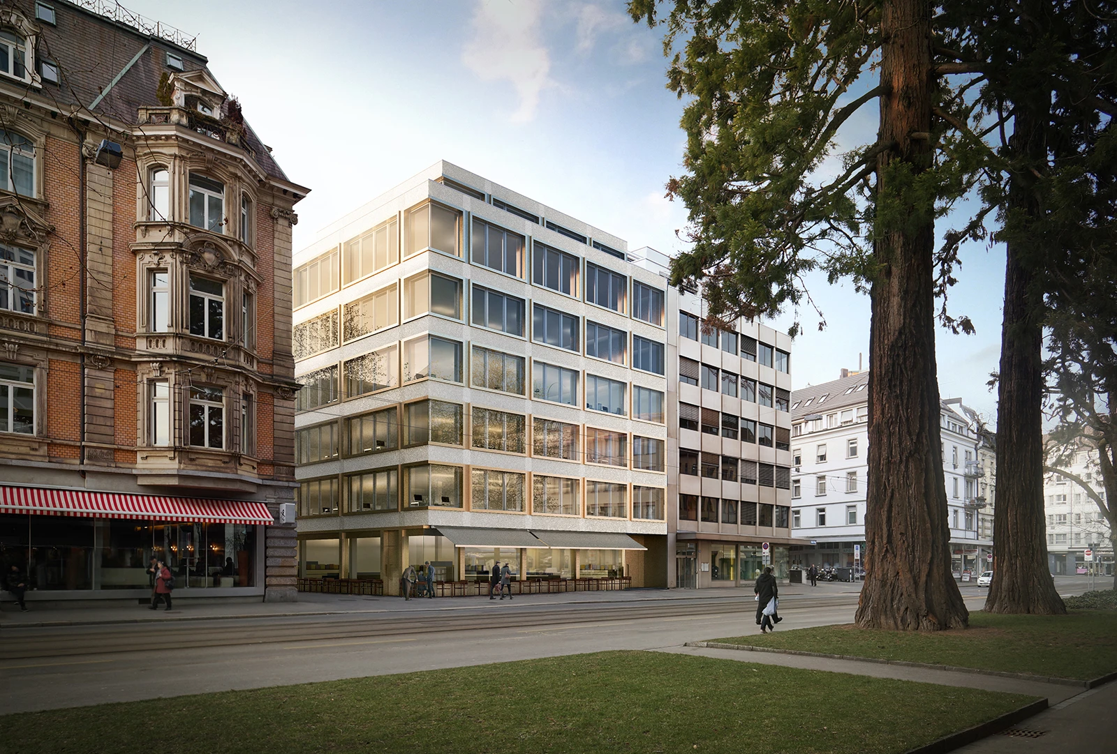 The architectural language of this commercial development, with a length of 135 meters follows the tradition of late 20th Century modernism along Bellerivestrasse.