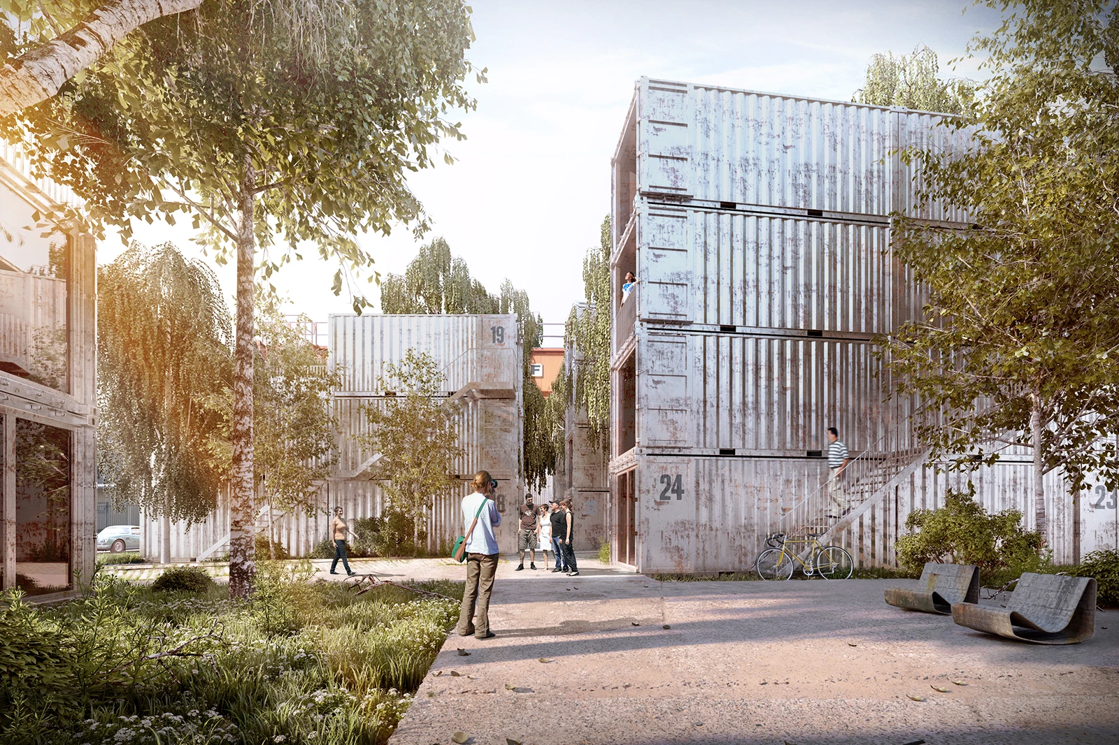 150 stacked containers give shape to the Boarding House in Dresden and interact with the former industrial site.