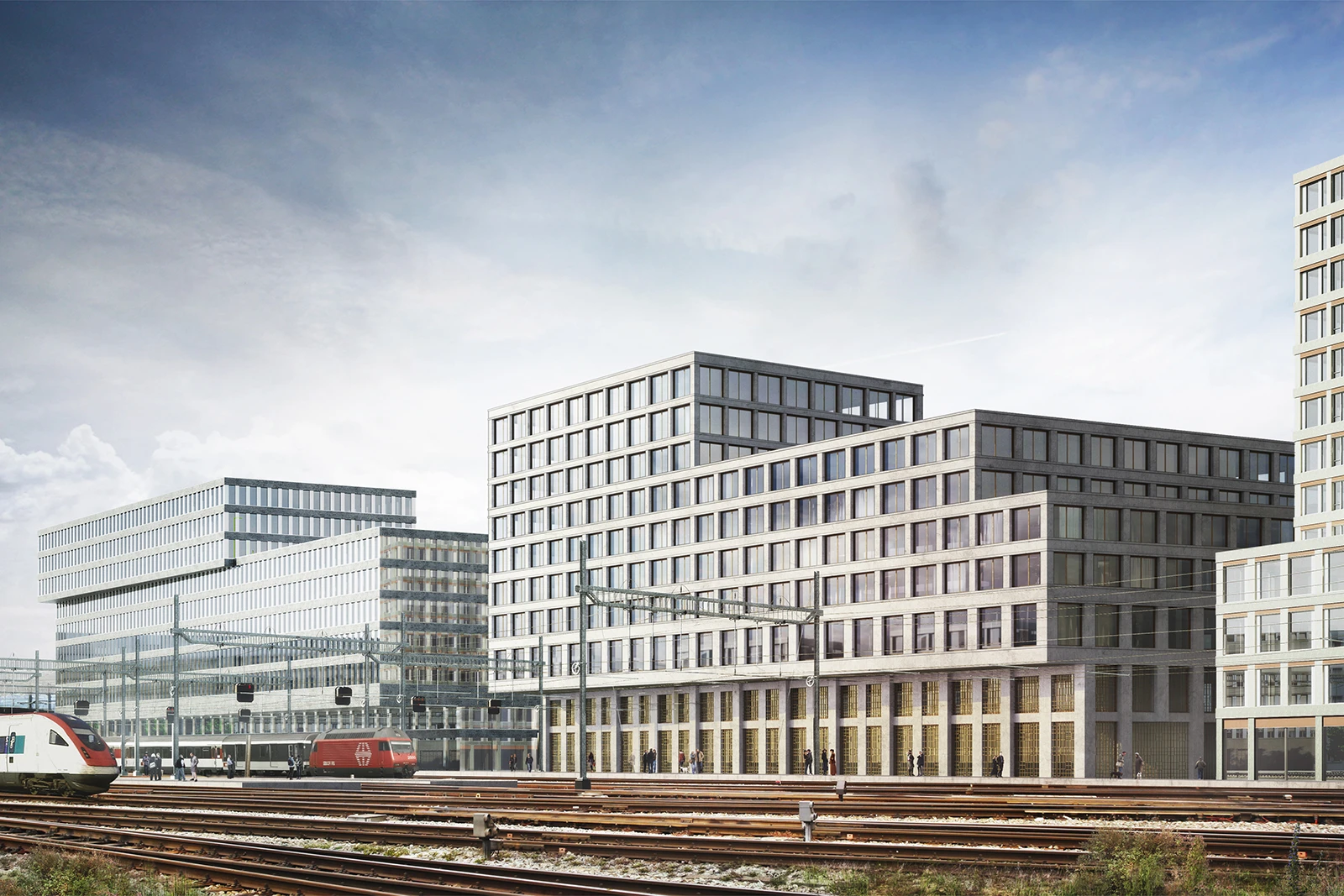 In the renovation project an office building facing Bahnhofstrasse and a one-story plinth were preserved and refurbished. This new addition incorporates the surrounding building blocks and expands upon the original structure.