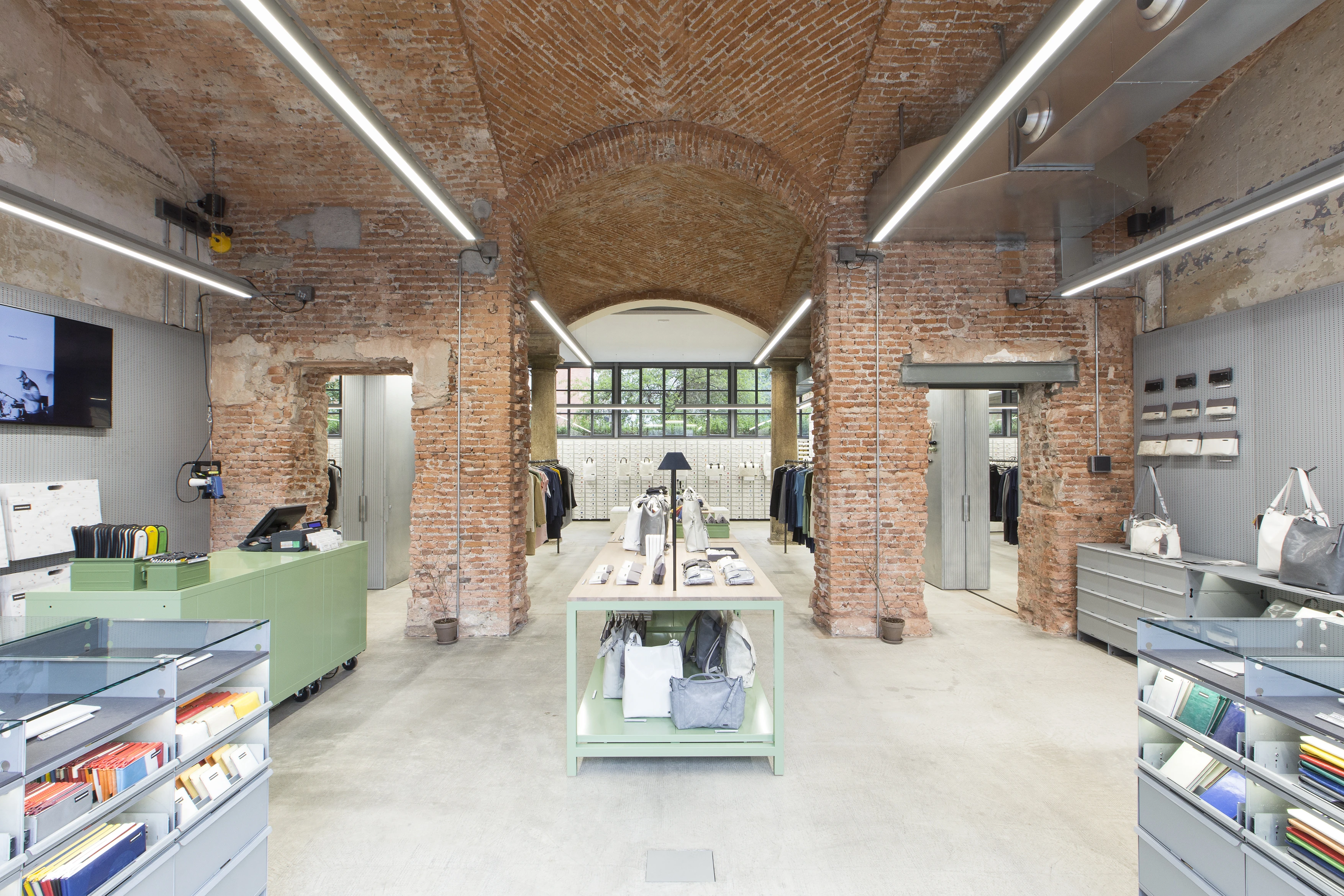 A series of interventions introduce a sense of structure and organization to FREITAG's retail space in Milano.