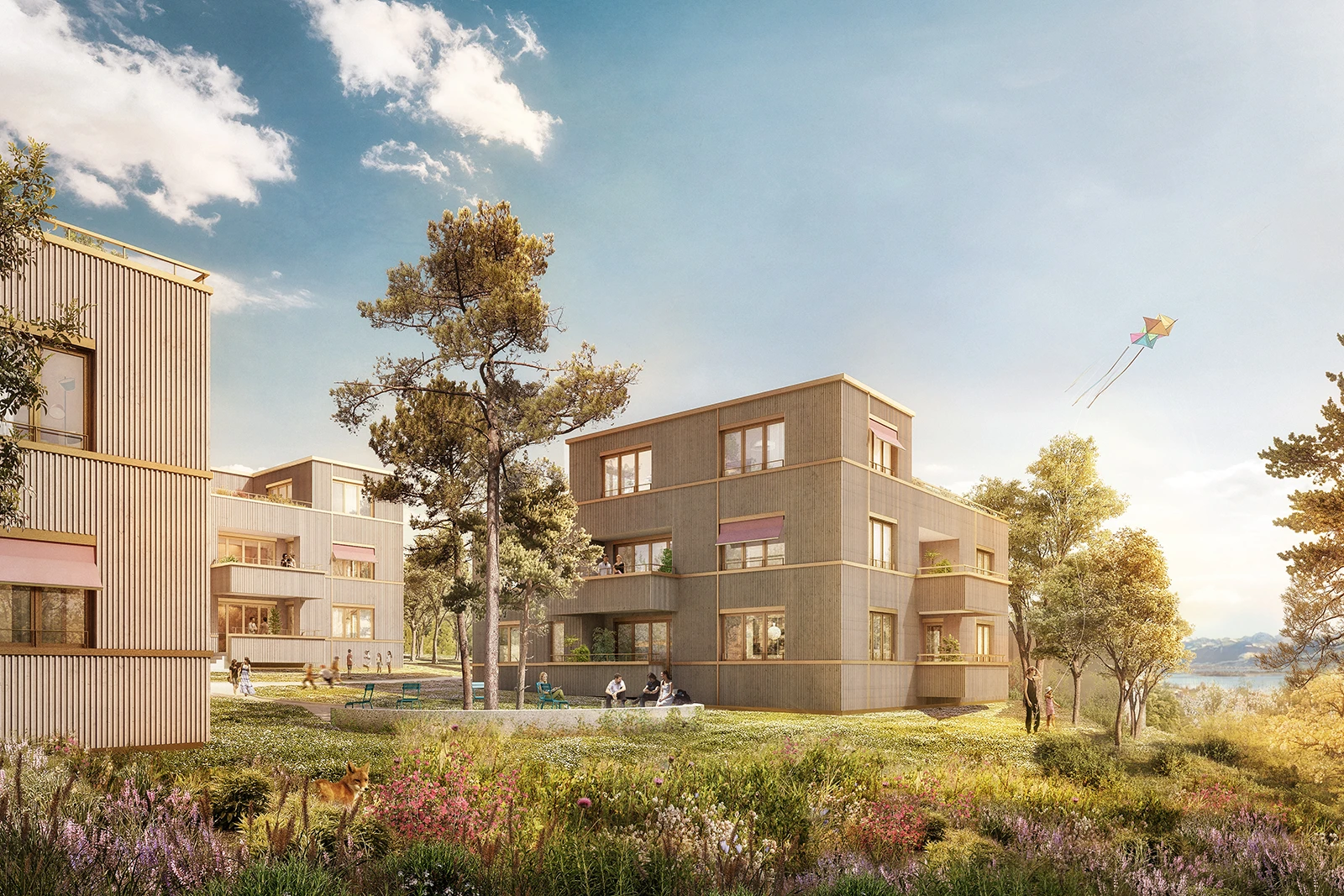Awarded the first prize in an invited competition, the proposal sets three distinct volumes between existing apartments and pastures.