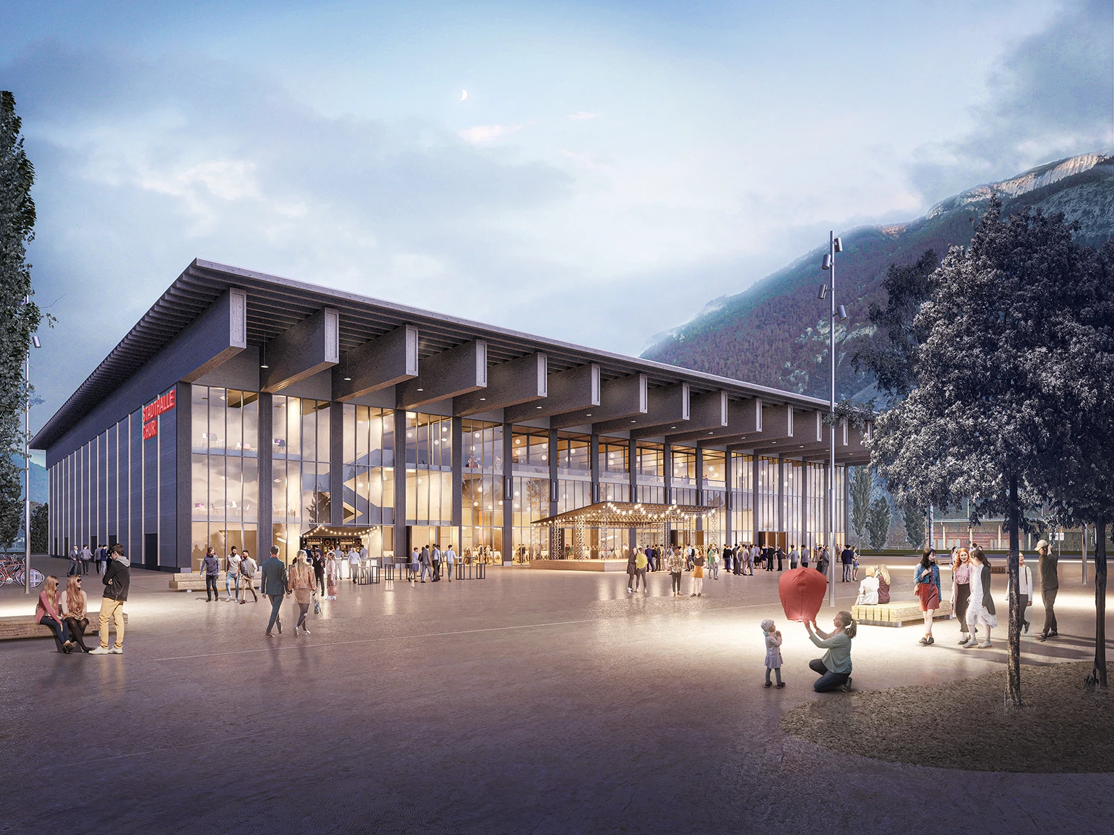 Like a stone set among a row of hills, a monolithic structure for a sports facility in Domat Ems, Switzerland, integrates with the surrounding landscape.