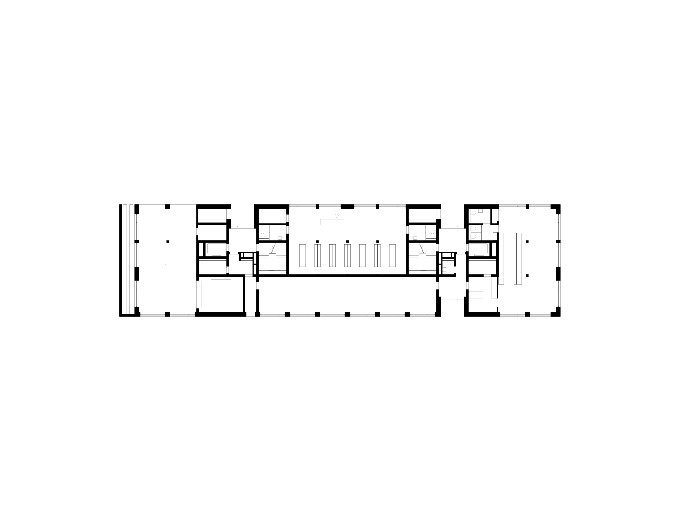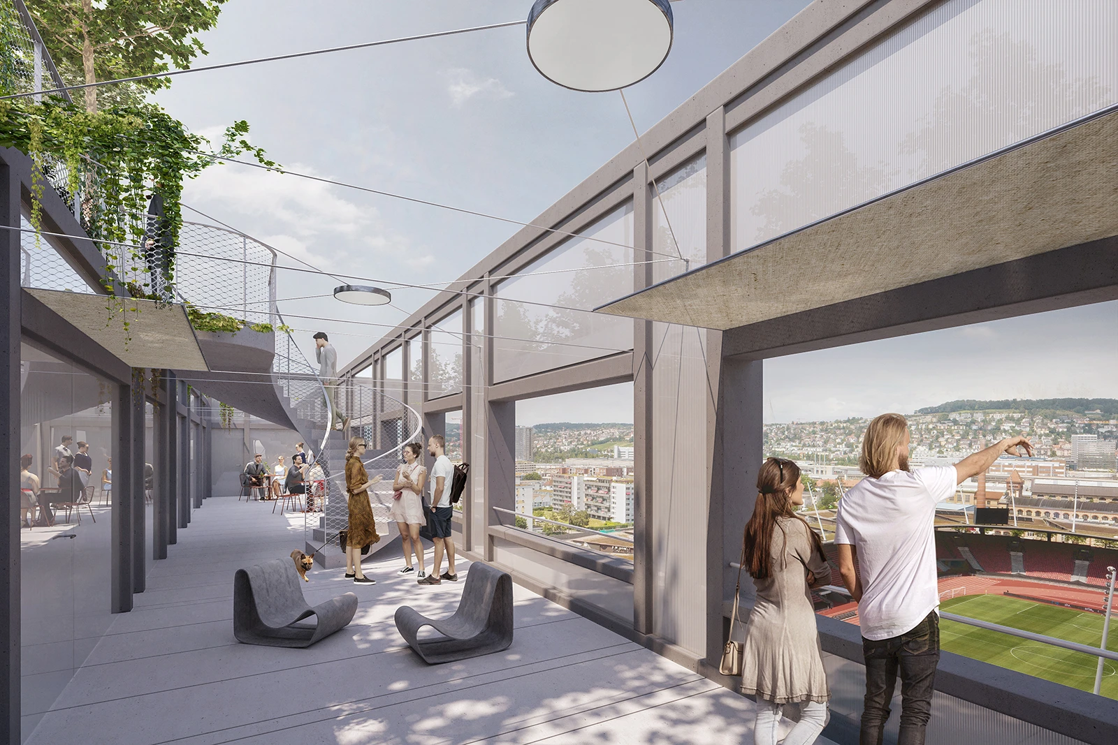 The architectural proposal amplifies the significance of this axis. At the same time, it emphasizes Badenerstrasse's primary approach by framing the tram platform and the encompassing roundabout and by grounding the urban layout. Directly contrasting the free-form Letzigrund stadium, the design is a balanced and integrated piece of architecture.