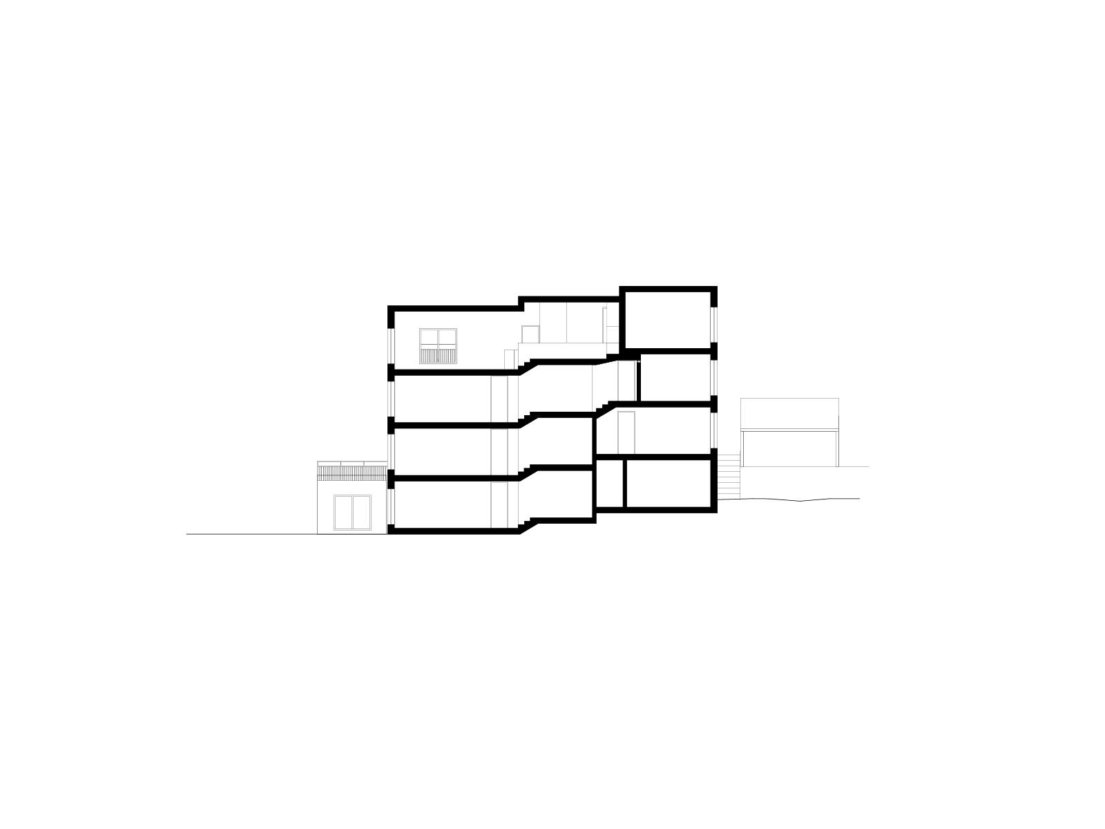 A proposed apartment building blending into the context of its neighborhood, presents a copper-concrete roof designed to accommodate five parking spaces towards the communal street, followed by a slender staircase that provides access to a expansive garden that seamlessly transitions into a forested ravine.