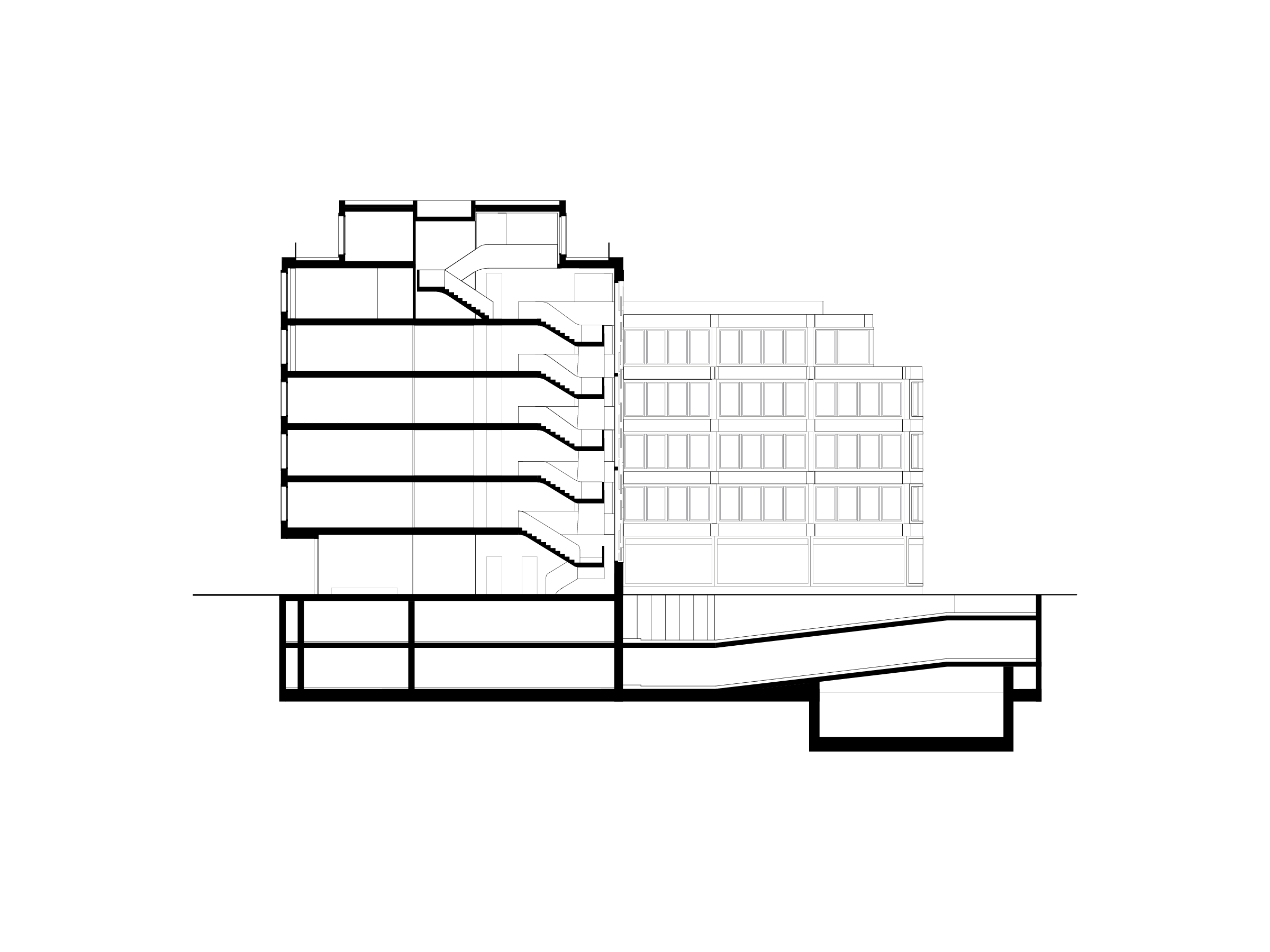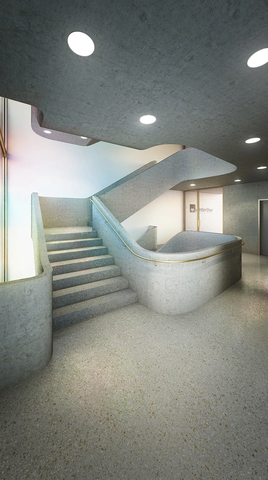 A representative, softly curved concrete staircase connects all floors, offering views through the building’s vertical depth right up to the set back fifth floor level, enhancing spatial experience and connectivity within the structure.