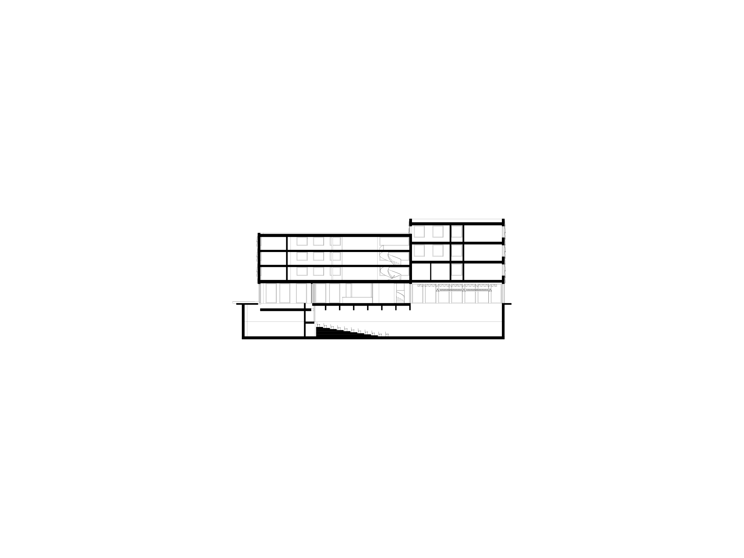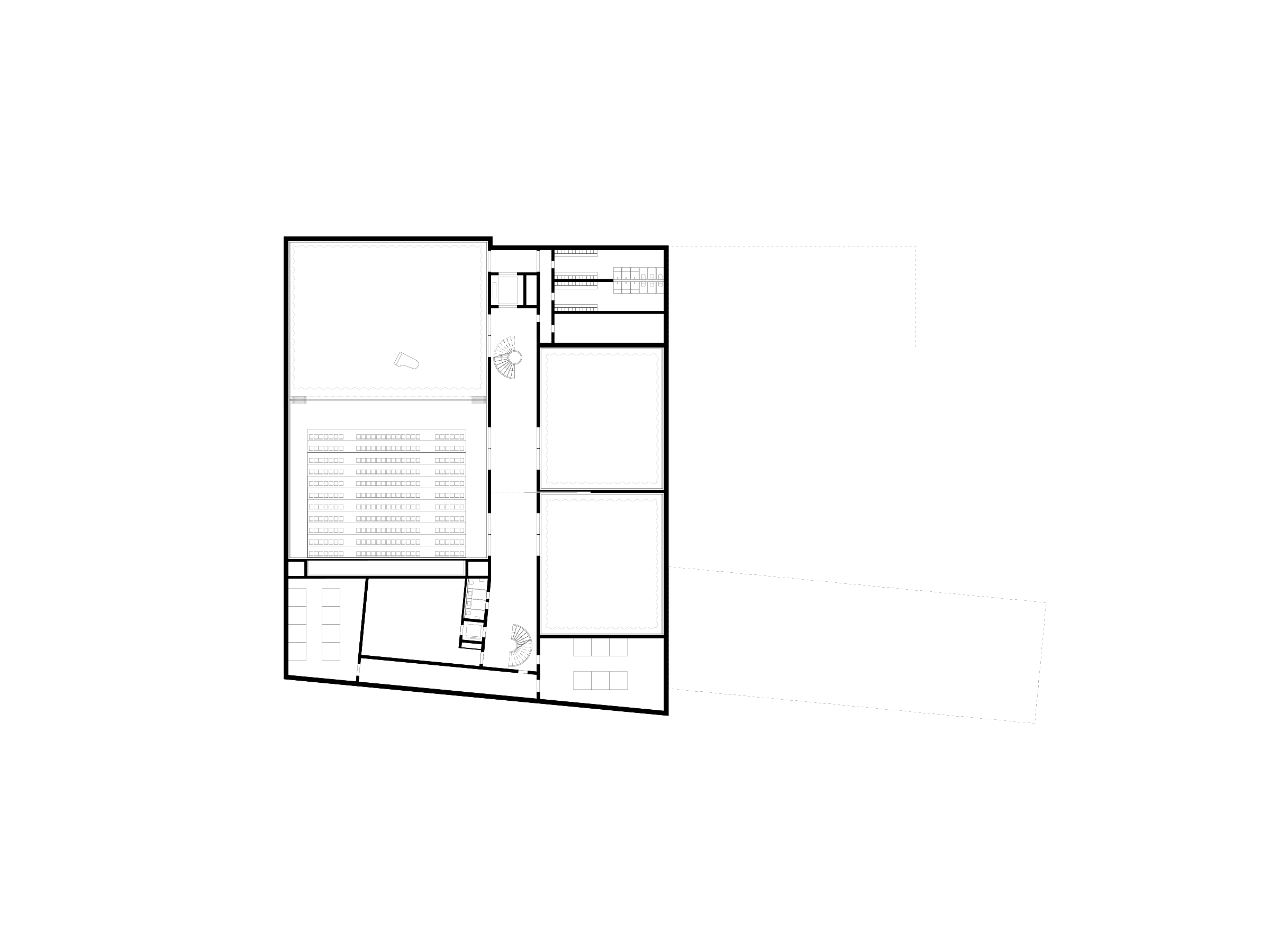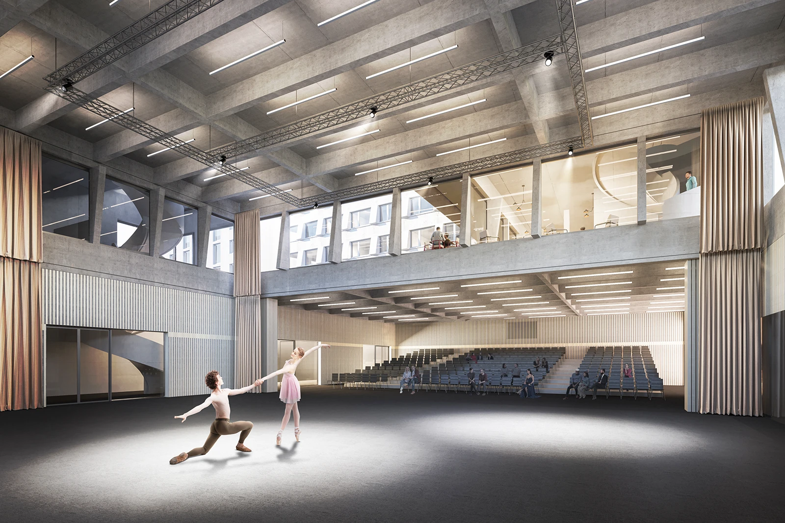 Halls A and B are logically organized into the lower basement and connected via a spacious underground, two-story tall foyer. With the two integrated staircase systems connecting to the foyer and illuminating the space with daylight, the separation between the audience and dancers is ensured. A cafeteria spans the two spaces, acting as a focal point, with Hall C on a slightly lower level than the large Hall A. The courtyard space offers a consistent conclusion to the composition and offers a covered outdoor area.