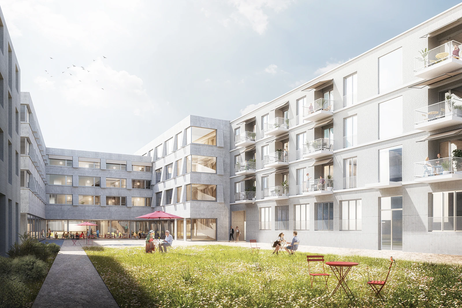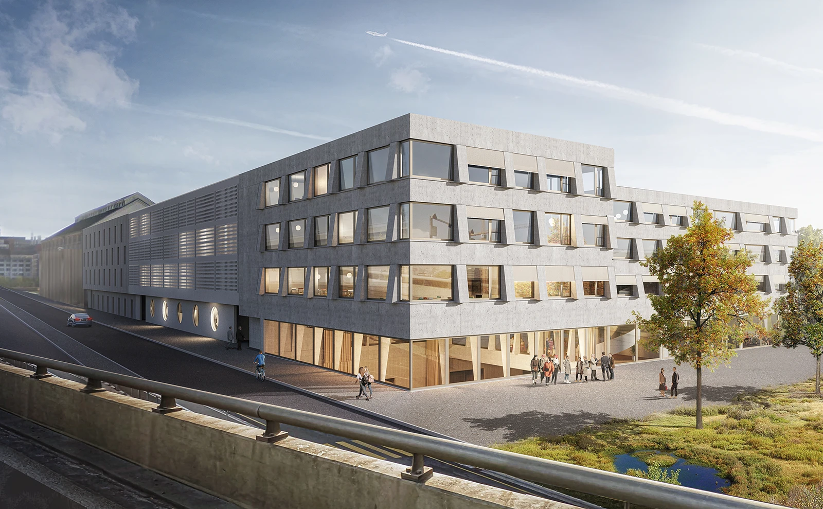 Located in the northeastern end of the Erlenmatt district, the robust and slightly elevated building block redefines the area, impacting the city, as well as its traffic and landscape spaces. The composition of this building block densifies and organizes the courtyard space between Erlenmatt Campus and the slender residential building to the south.