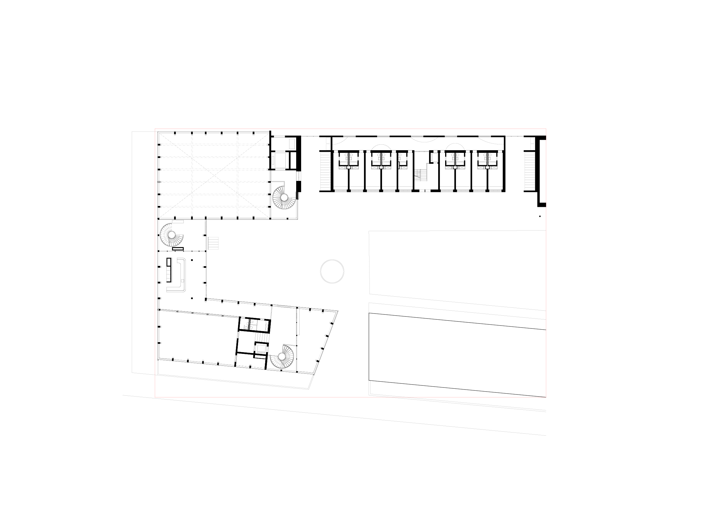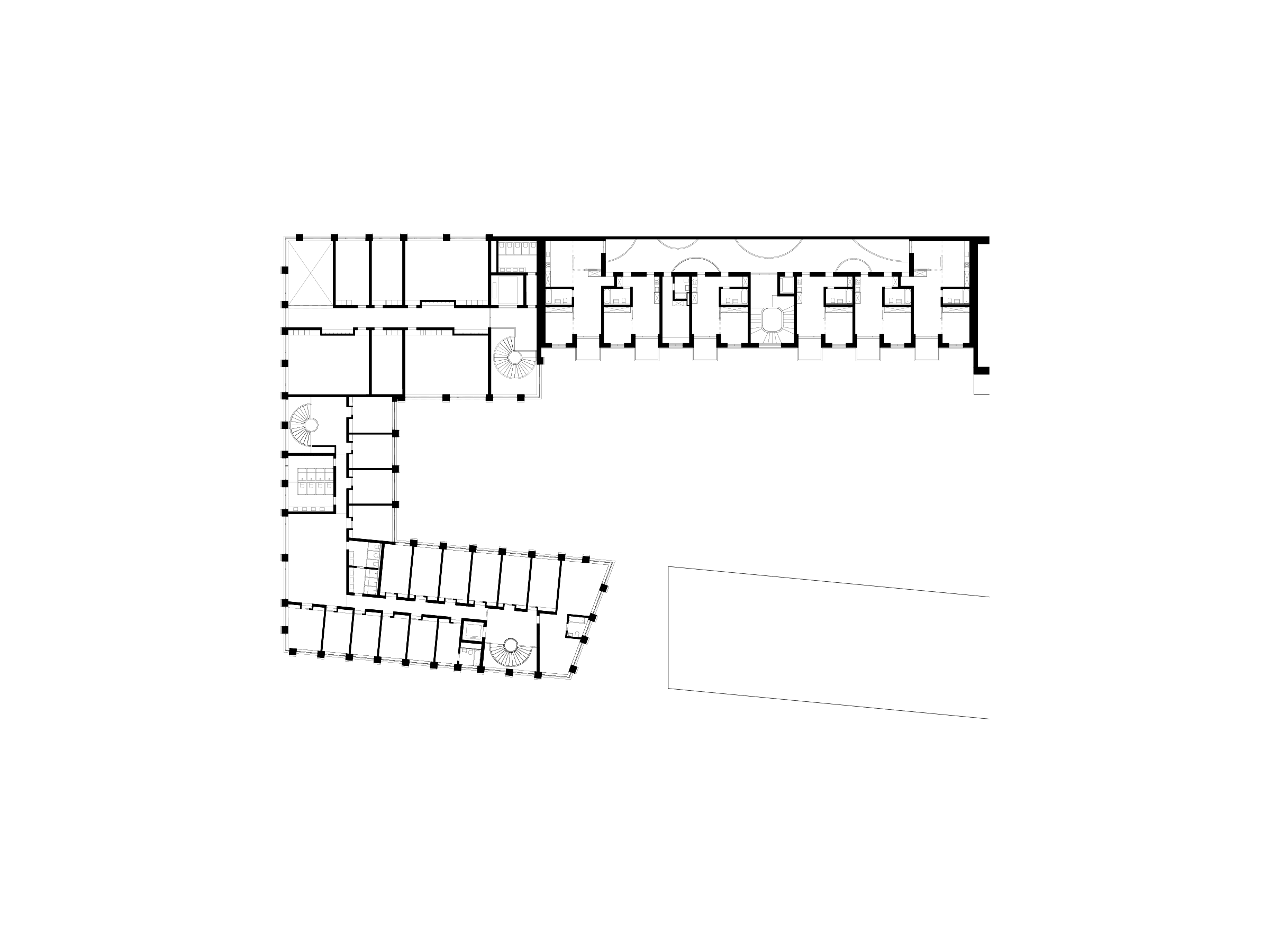 Situated in the northern part of the building and spanning the three upper floors, the dance school can be accessed via two separate entrances. The first floor of the school can also be entered through a centrally located staircase situated in the cafeteria area. This staircase also serves as a passageway to each residential floor. The individual units of the three residential floors extend along a corridor between the second and third staircase systems. All shared spaces can be internally separated, but are also connected through public areas or corridors.