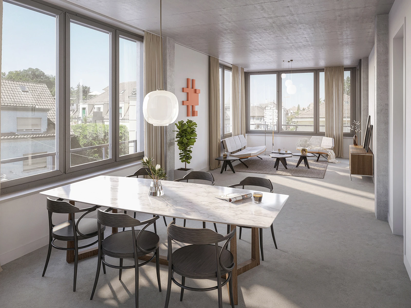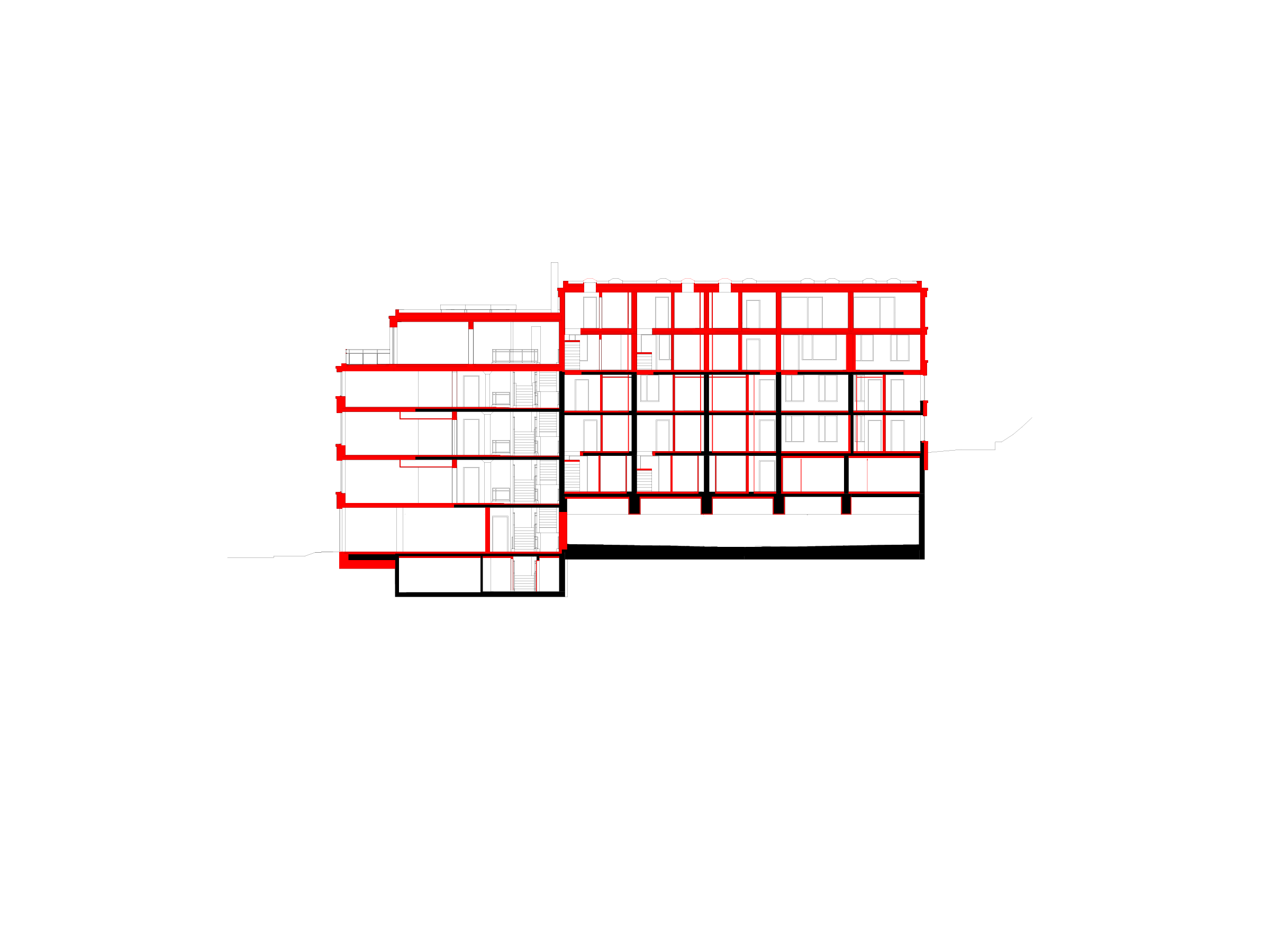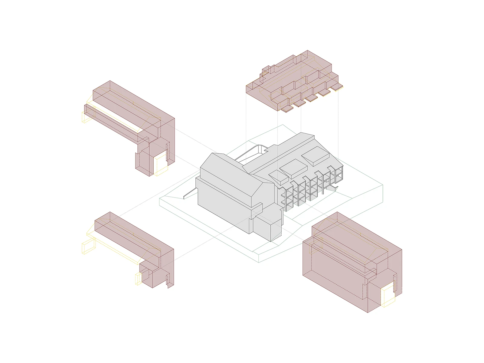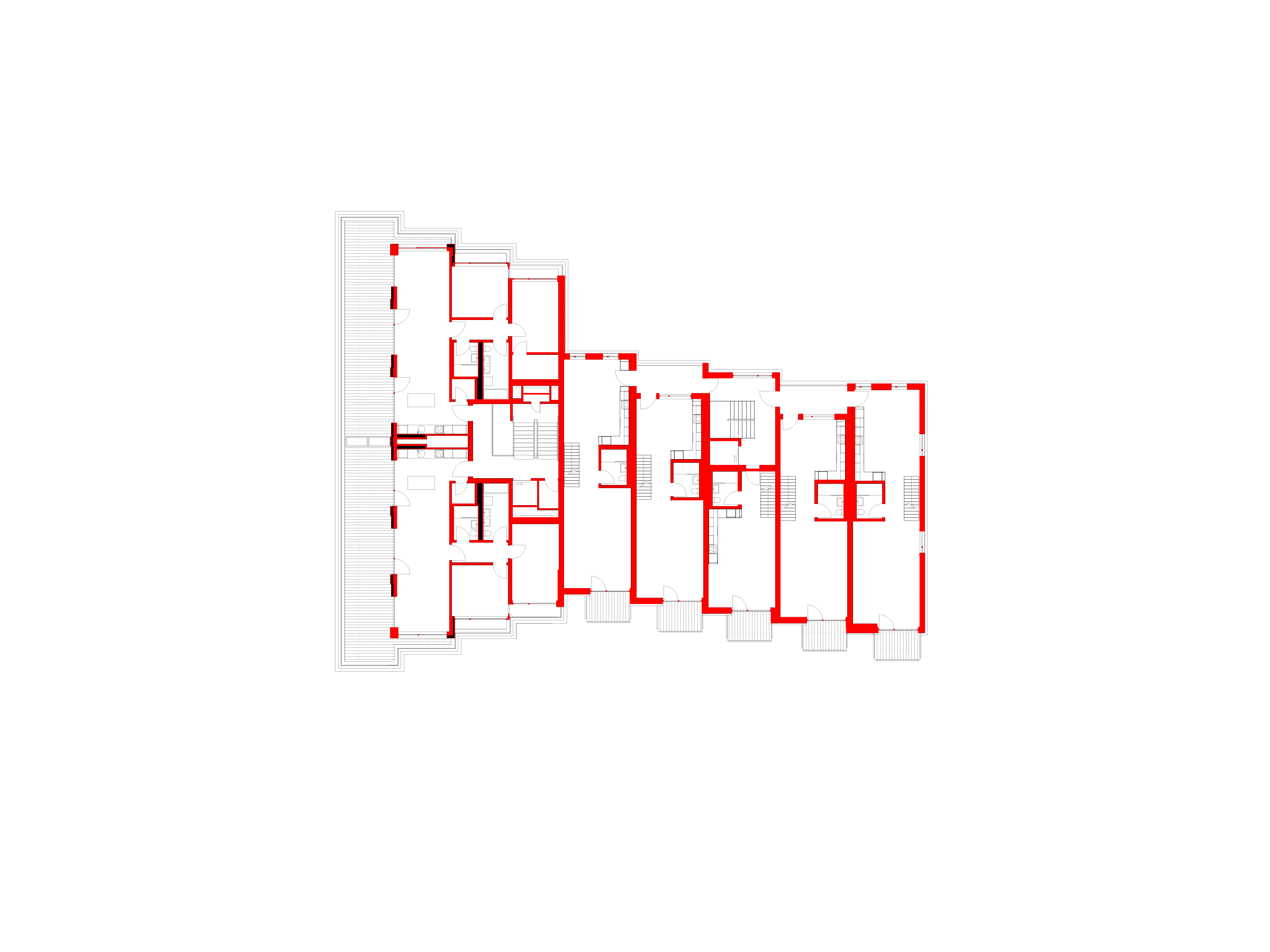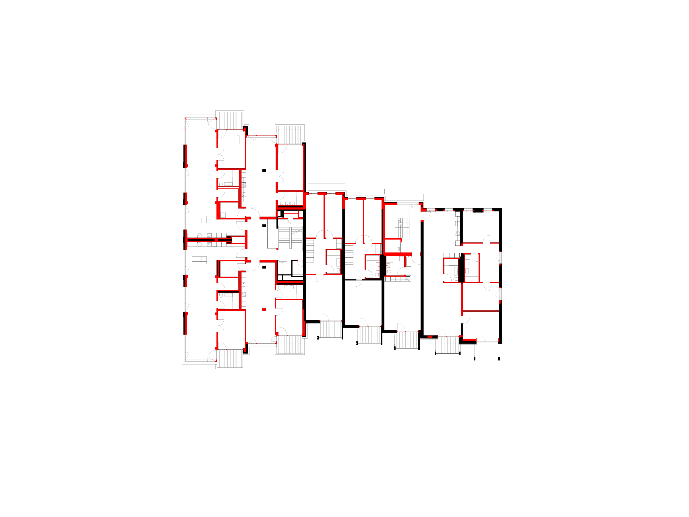 The buildings' former industrial identity is emphasized in this transformation by introducing loft-style apartments and using heavy-duty materials. Access is provided via the pre-existing staircase. Dwellings in the recessed portion of the building are spacious family residences designed as standard apartments and maisonettes. Combined with studio accommodations, they offer a diverse and appealing assortment of housing options.