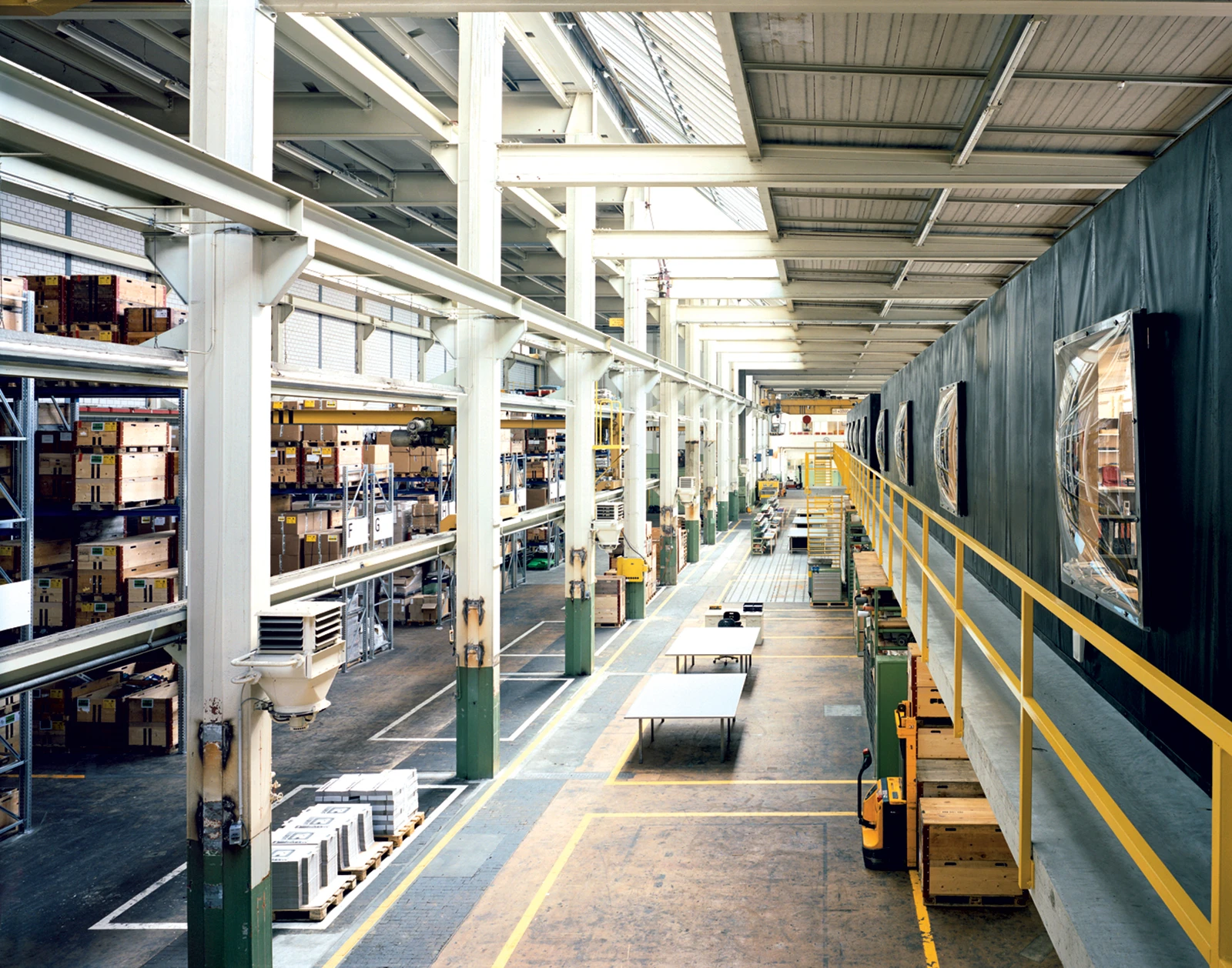 Zusätzlicher Platz wird für kleine Ausstellungen, Nebenräume für das Personal und vor allem für Büroräume benötigt. Der neu eingebaute Büroraum befindet sich in erhöhter Lage innerhalb der weitgespannten Produktionshalle und bietet Platz für vierzig Arbeitsplätze. Aus funktionalen Gründen lehnt er sich an die existierende Industriefassade an. Die Arbeitsplätze für den Zuschnitt und die Montage der Planen befinden sich direkt unter diesem neuen Büroraum. V-förmige Stützen tragen die monolithische Bodenplatte.