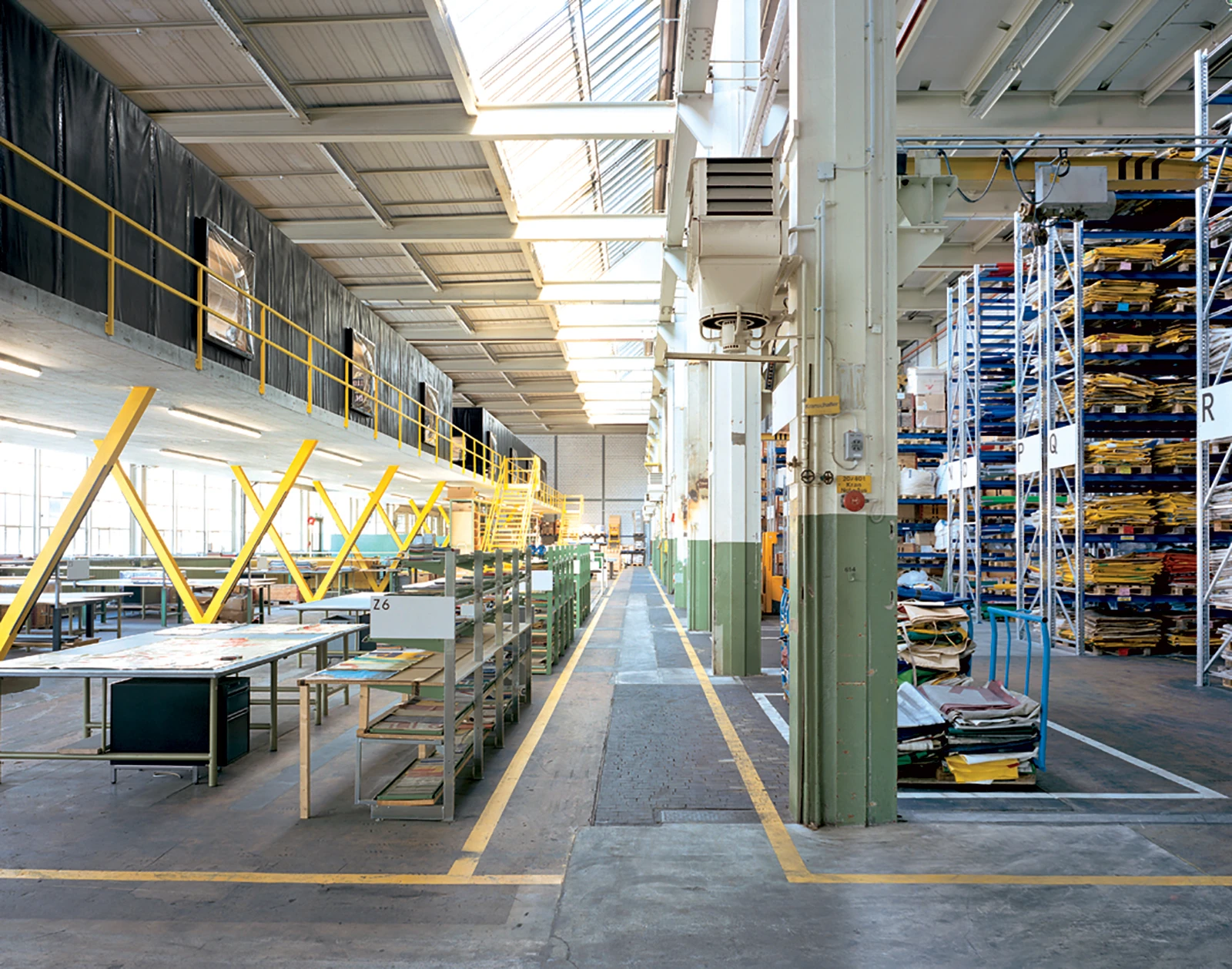 Exceeding those production needs, additional areas are reserved for small exhibitions, staff rooms, and office spaces, newly integrated within the vast production hall, which accommodates forty workstations. Functionally aligned with the original industrial facade, the workstations designated for cutting and assembling the tarps are arranged directly below this new office space, all reinforced by V-shaped pillars maintaining the monolithic floor slab.