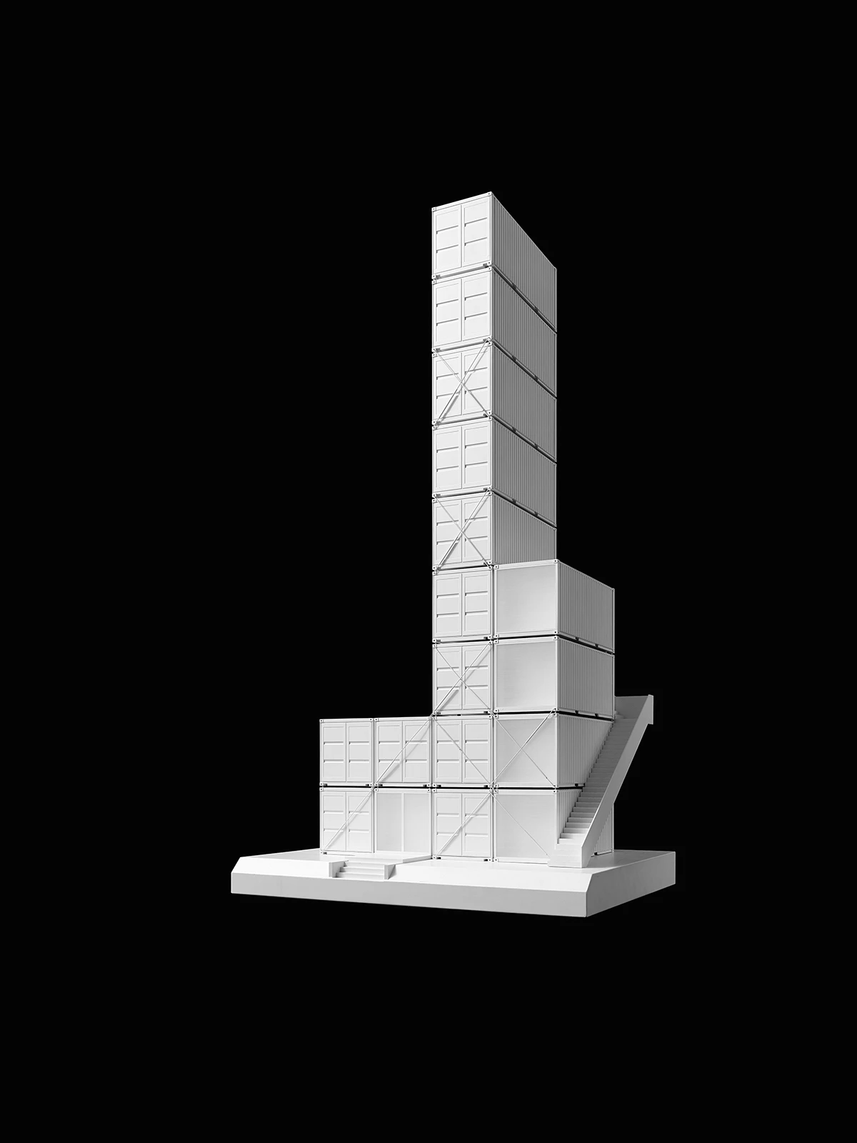The standardised 20-foot shipping container is transformed into a building block for an architectural intervention. A stepped tower rises 9 units up from a 4 x 2-unit base.