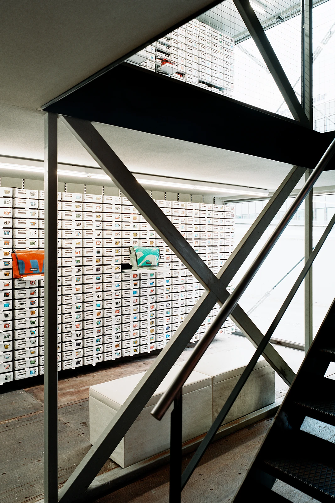 Large window openings illuminate the sales area and provide views in and out. A path leads through the range of products including more than 1,500 bags and ends in a viewing platform at a height of approximately 25 metres. The base serves as a shop, while the tower acts as a platform with a panoramic view of the mountains, the lake, the transport arteries, the railway tracks and the building where the concept for the bags was born. An interpretive panel by Yves Netzhammer on the highest container tells the story of this cycle.