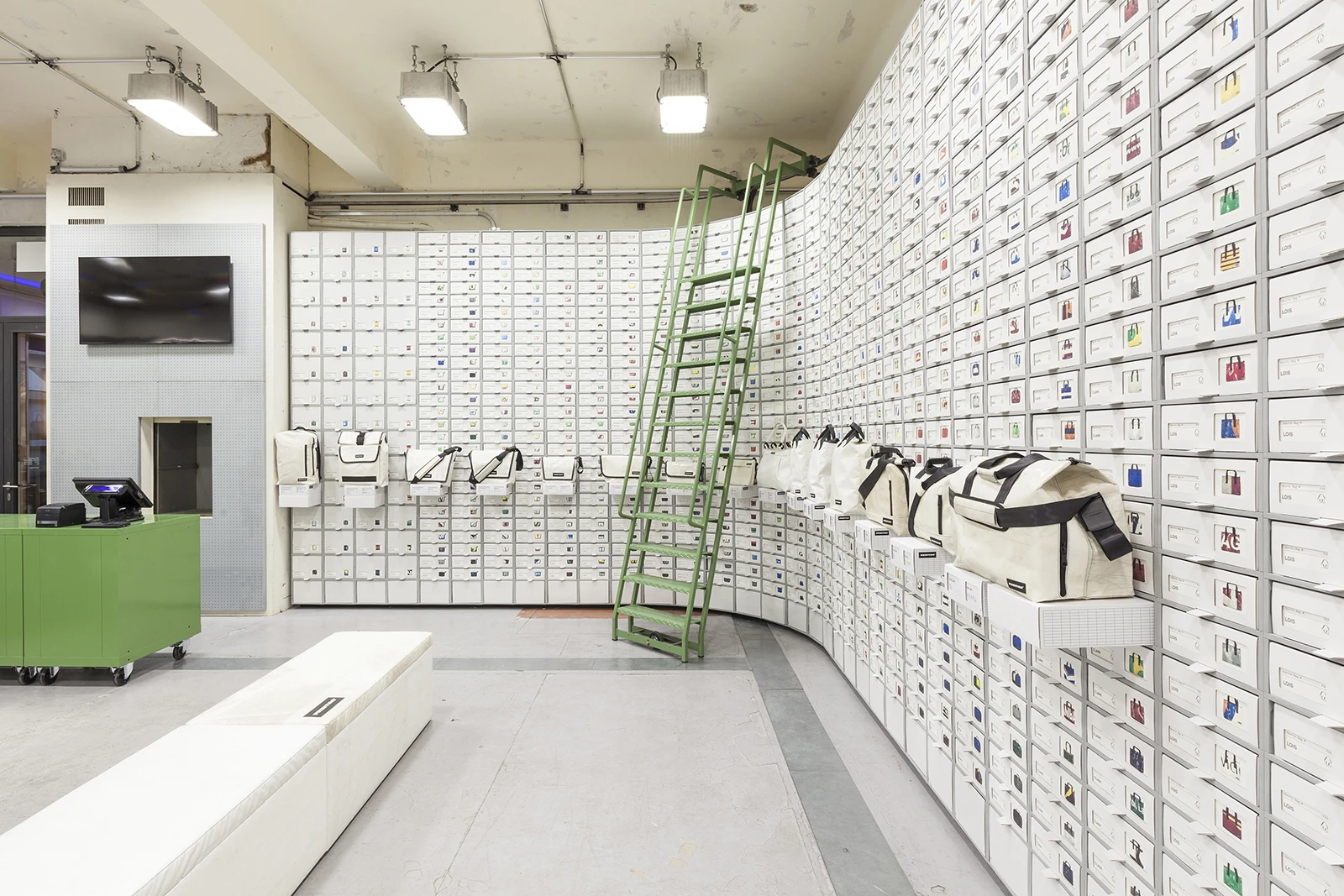 The Freitag Store in Basel is located on Grünpfahlgasse in the old town of Basel. The idea of community and collaboration was key in the concept for the store. The permeable border between the store and the adjacent coffee house is defined by writing desks and work stations in keeping with the tradition of the Mitte development.