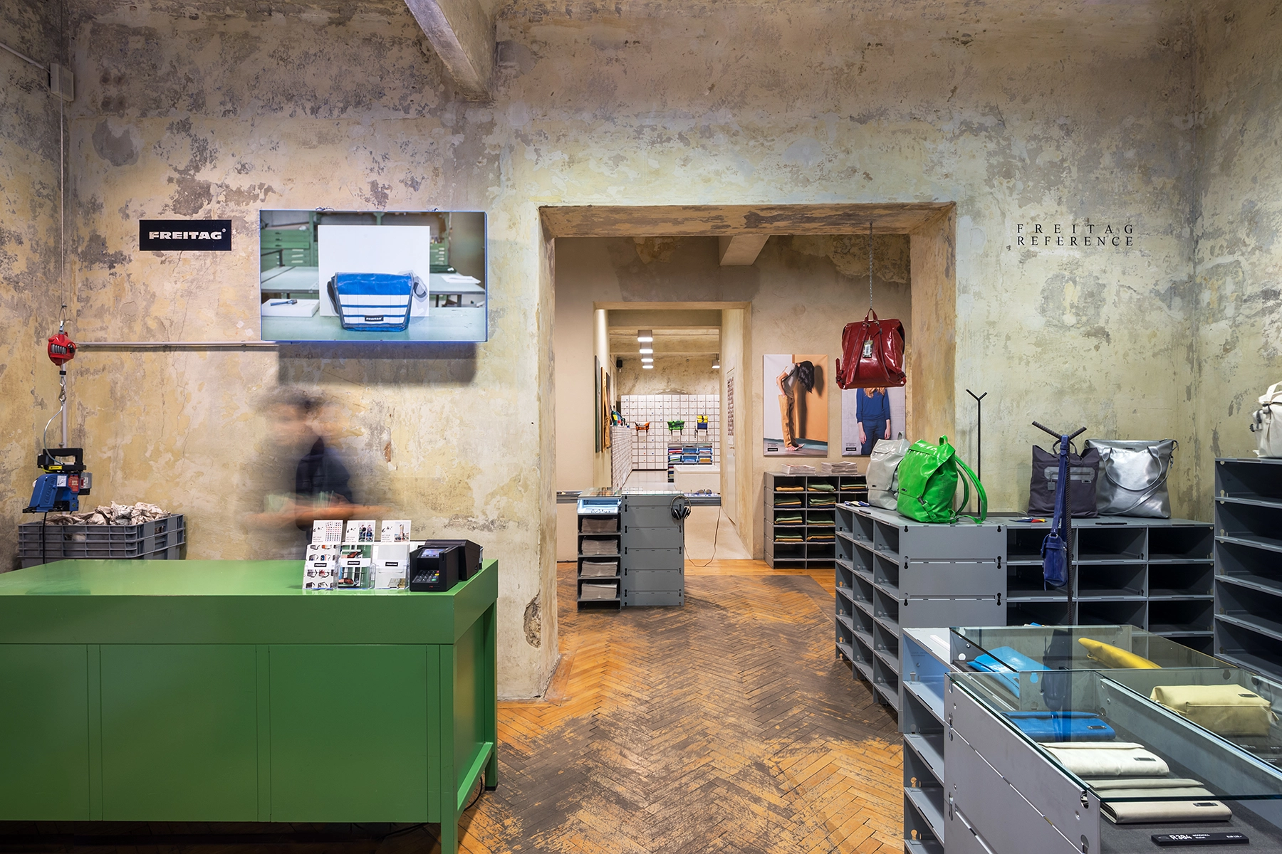 Much like the iconic Freitag bags, the shelving is crafted from repurposed materials, underscoring sustainability and re-use, which is accentuated by spillmann echsle's architectural intervention.