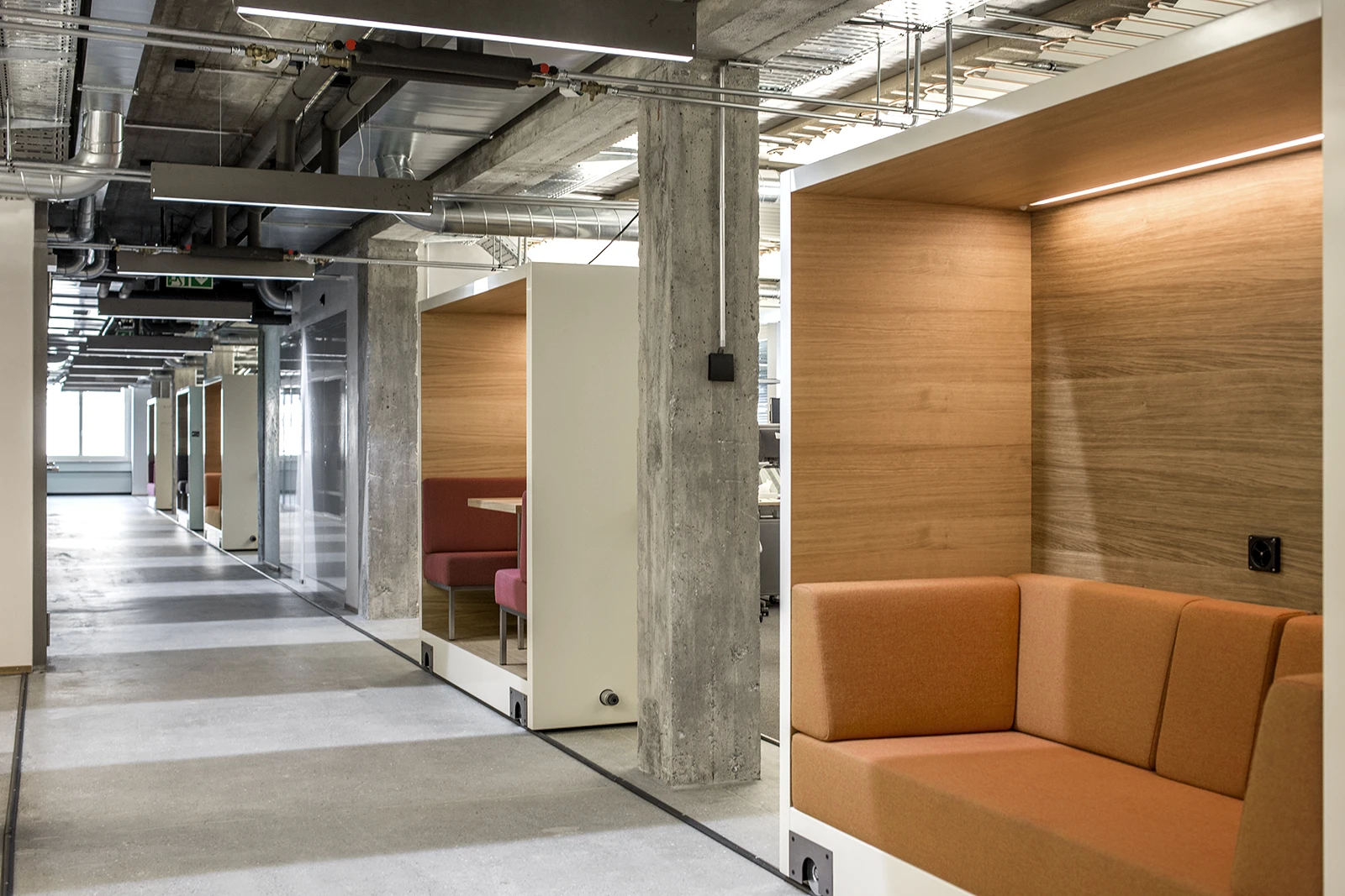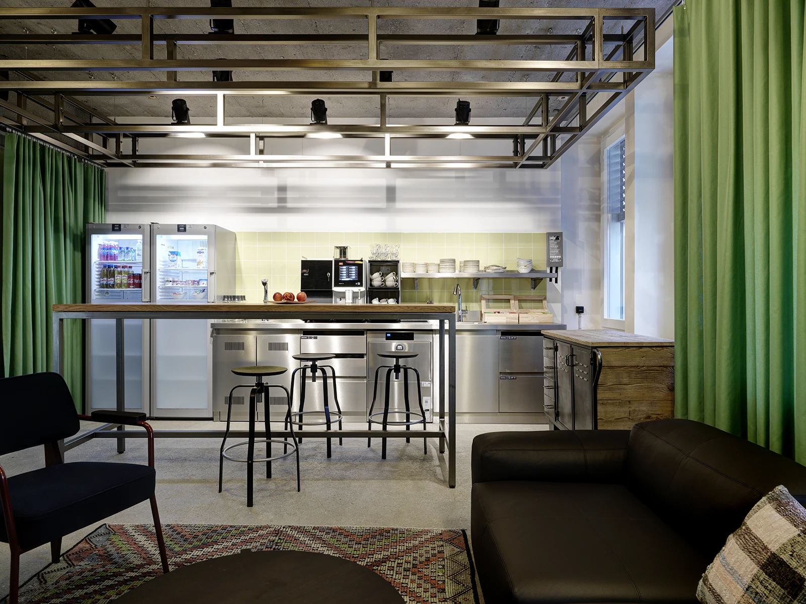 To offer employees a workspace that is unique and inspiring, priority was given to a functional and flexible spatial concept expressed with simple industrial materials. Sandblasting unveiled the existing reinforced concrete structure of the building, accentuating the distinct structure of the floors. The atmosphere of the office floors is characterized by the use of simple and raw materials, such as the installation of minimally treated metal and glass partitioning systems, the existing cement screed refined through sanding, and textiles used to shape the spatial layout. Monochrome fabric partitions offer privacy and darken the interiors as needed. This raw aesthetic is further reinforced by the carefully installed exposed building services.