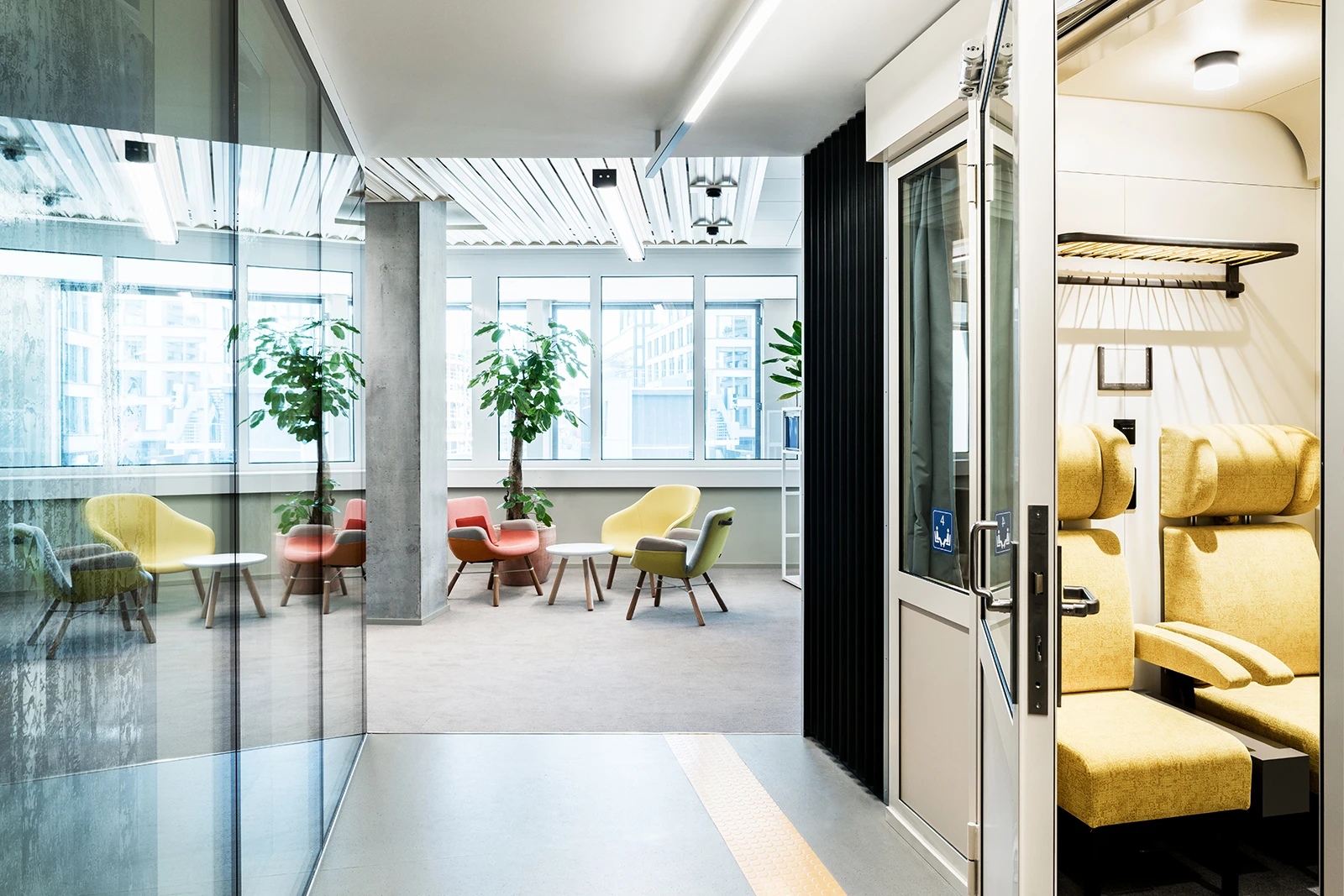Train compartments, some of which are spray-painted with graffiti analogous to train cars, create quiet zones of work separated from circulation zones, alluding to the state of being on a train ride between destinations. These metal, slender and space-dividing constructions contain copying zones, checkrooms, small restrooms, and micro-meeting rooms.