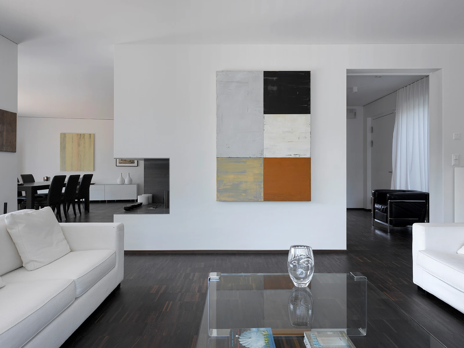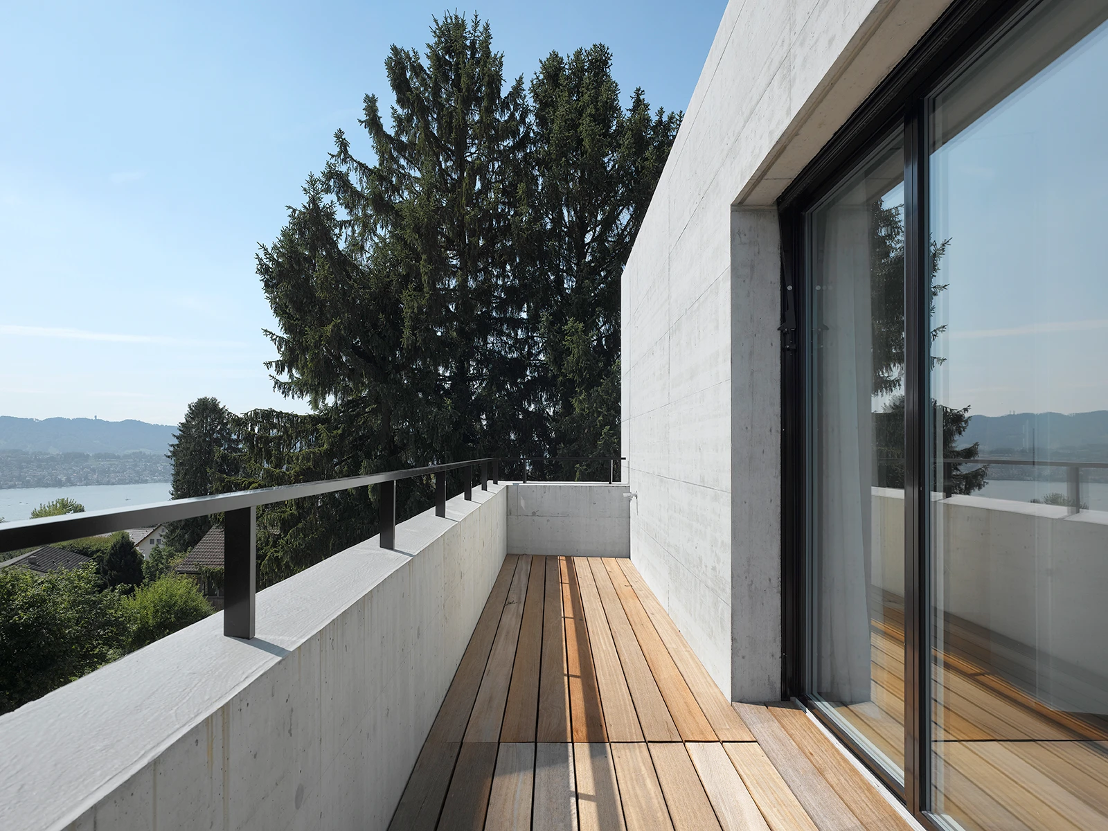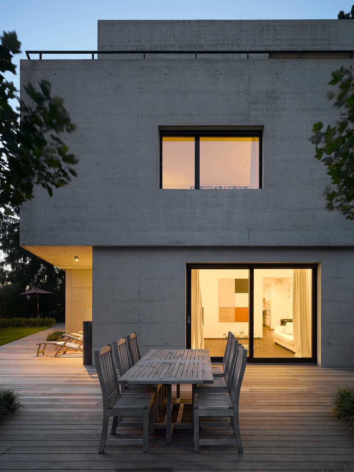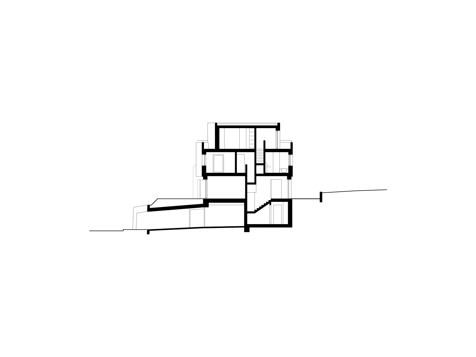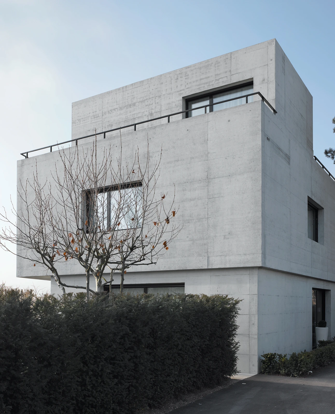 The new six room construction comprises of an attic level, two main floors and an underground garage. Its formal architectural vocabulary is clear, authentic and unadorned. The layered and in-situ concrete construction adds the necessary severity to the location and corresponds to the anonymous newer architecture of the neighborhood.