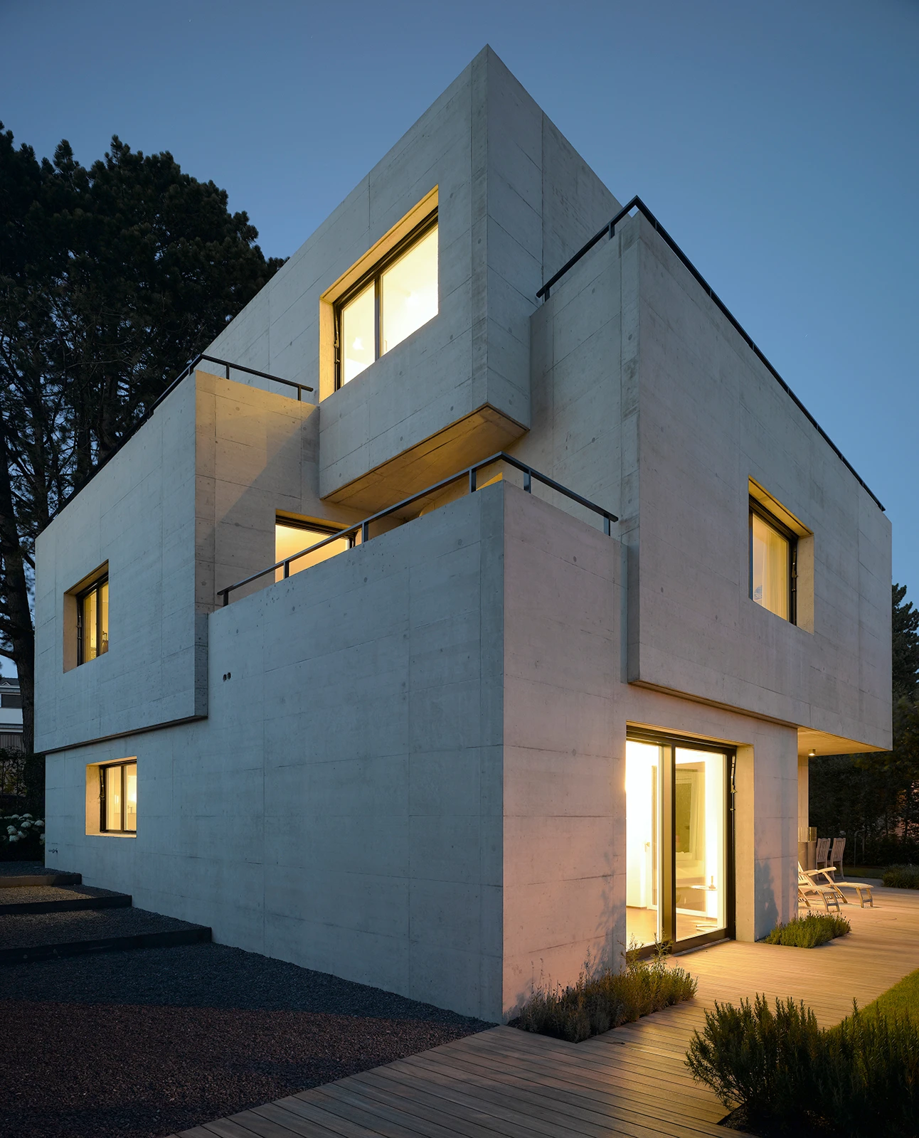 Floor by floor, the view to the outside unfolds while interior space is complemented by exterior areas. The staircase supports the building like a spine and supplies the levels with the necessary media. The building is framed by a minimalistic green space which provides a cosy intimacy.