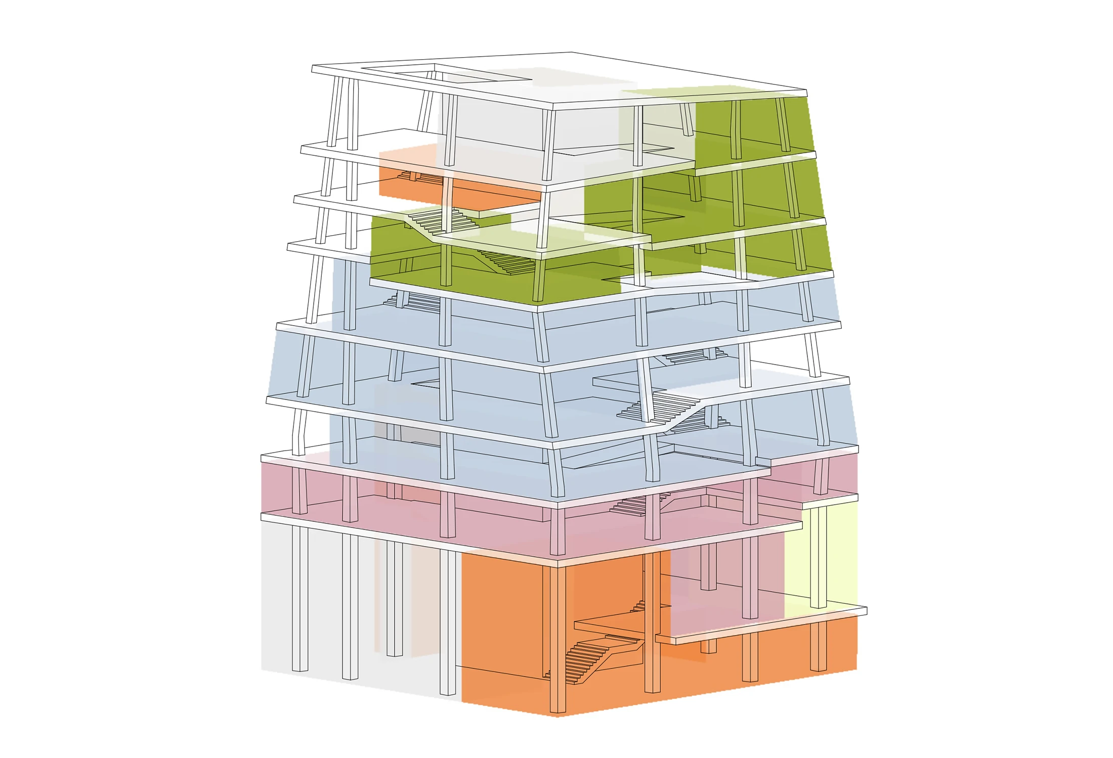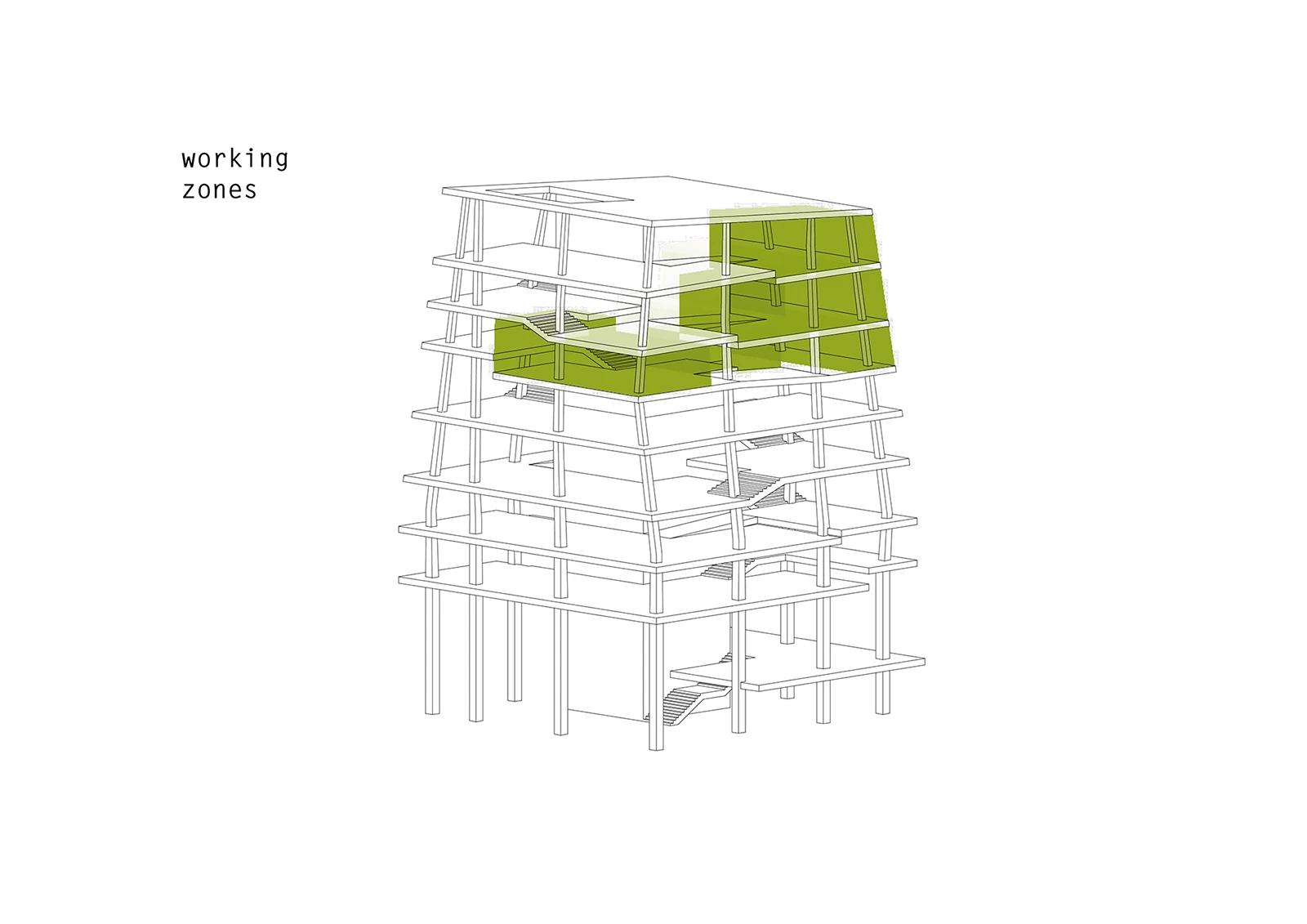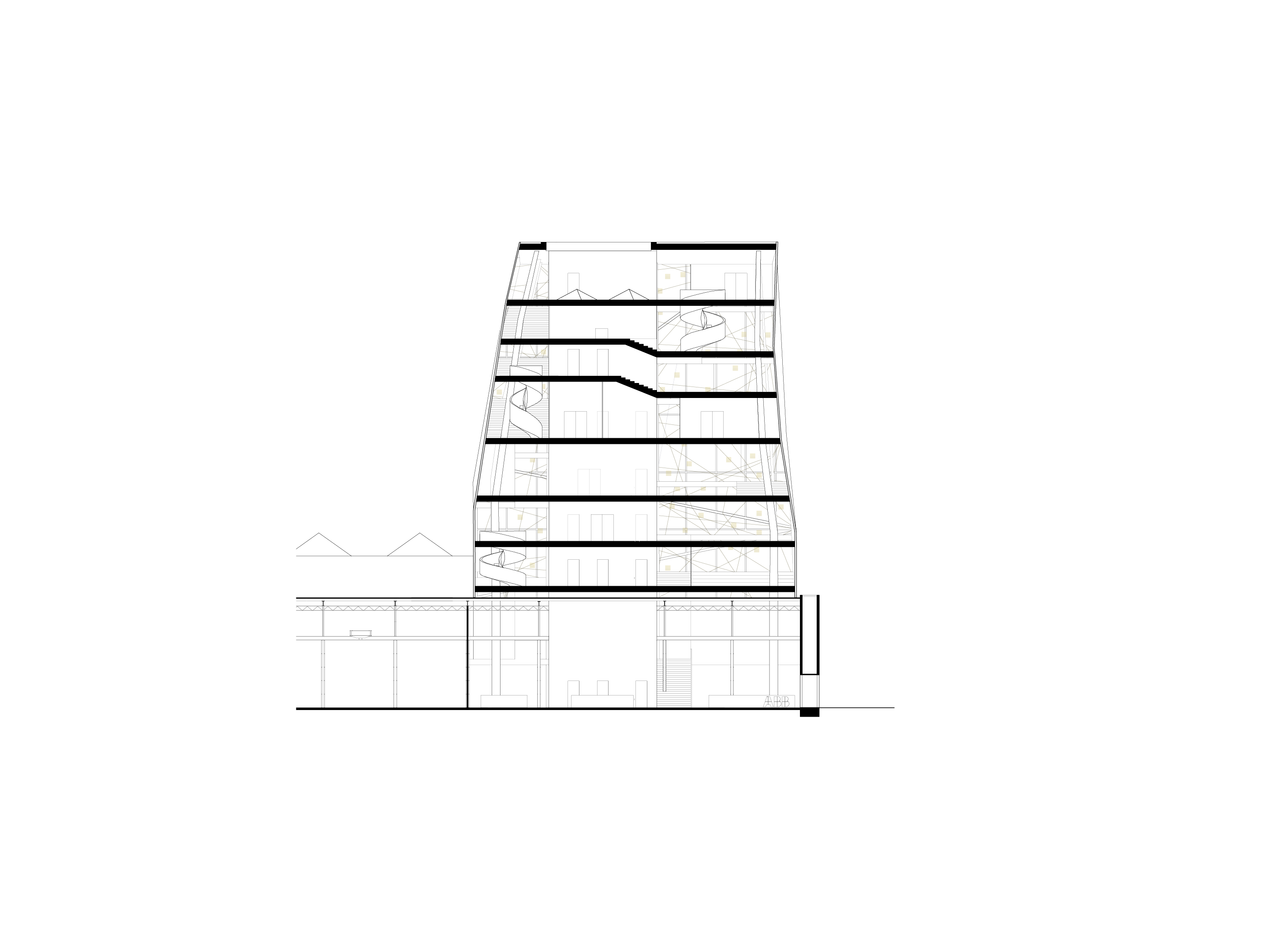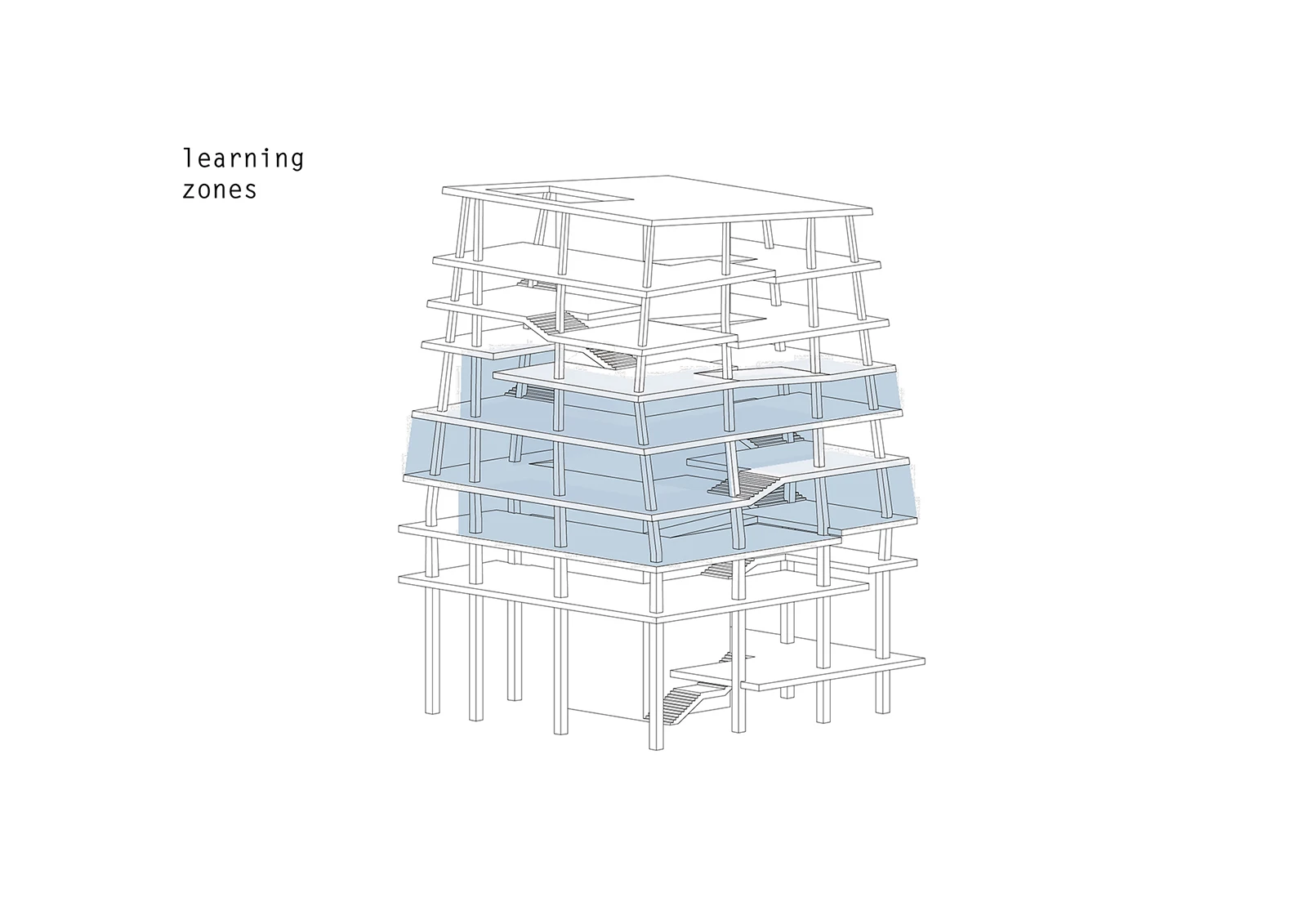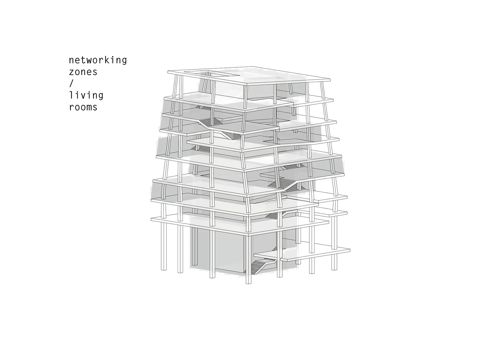 Over nine floors, spaces for learning and working are seamlessly linked within a highly flexible and adaptable landscape, where social spaces and living rooms allow guests from all over the world to feel welcome and form complex networks. Both the internal structure and the exterior convey the idea of interconnectedness.