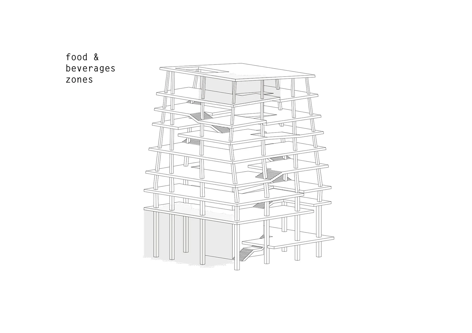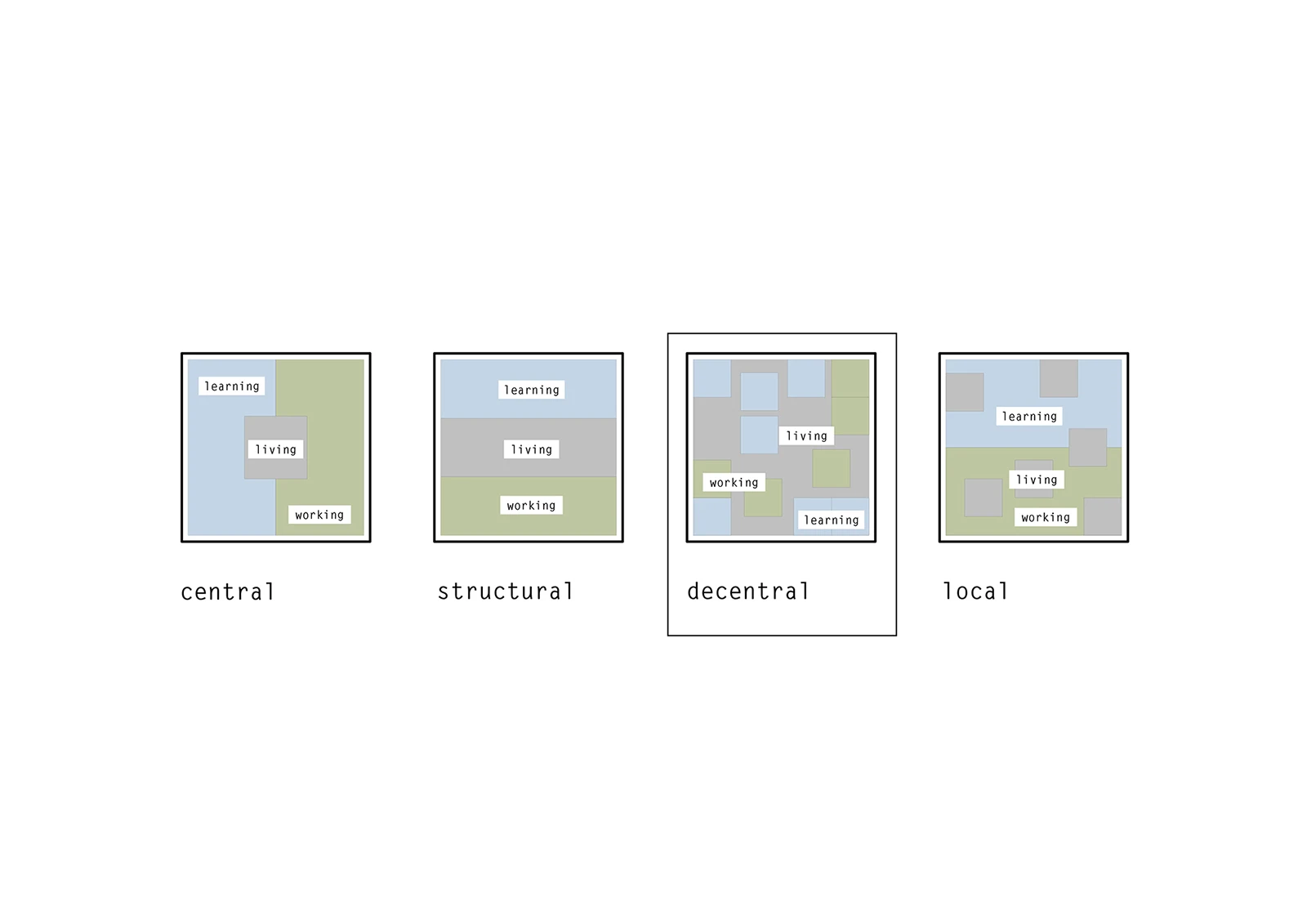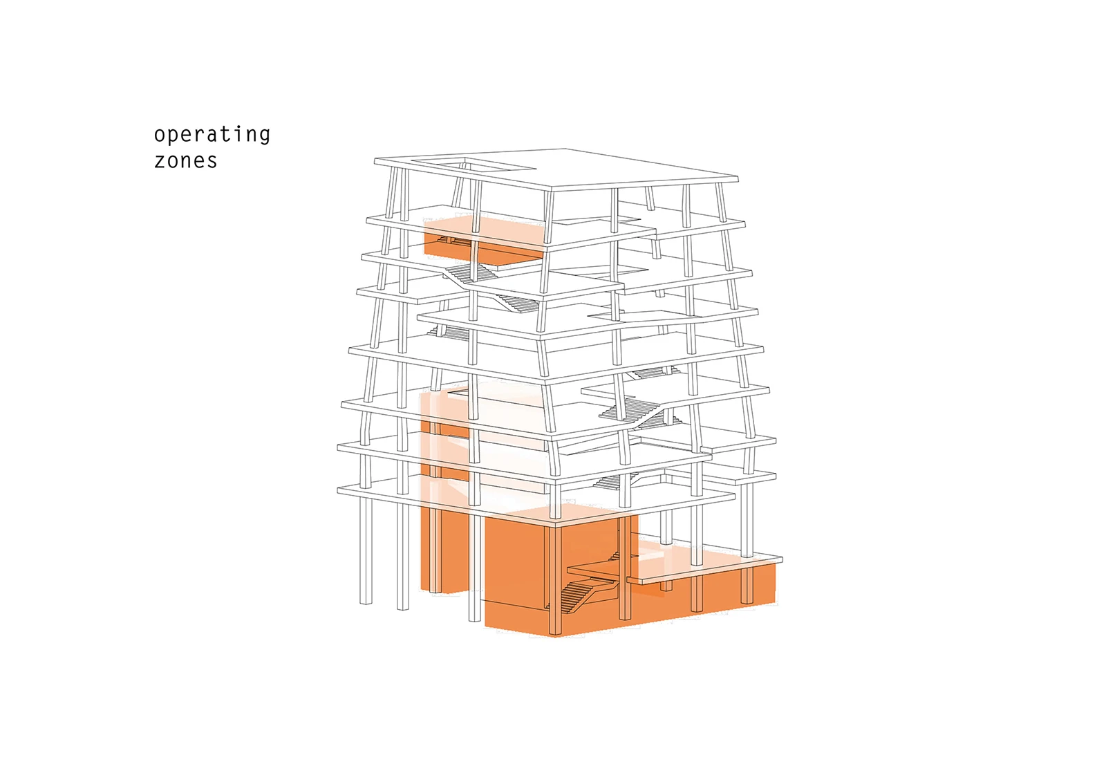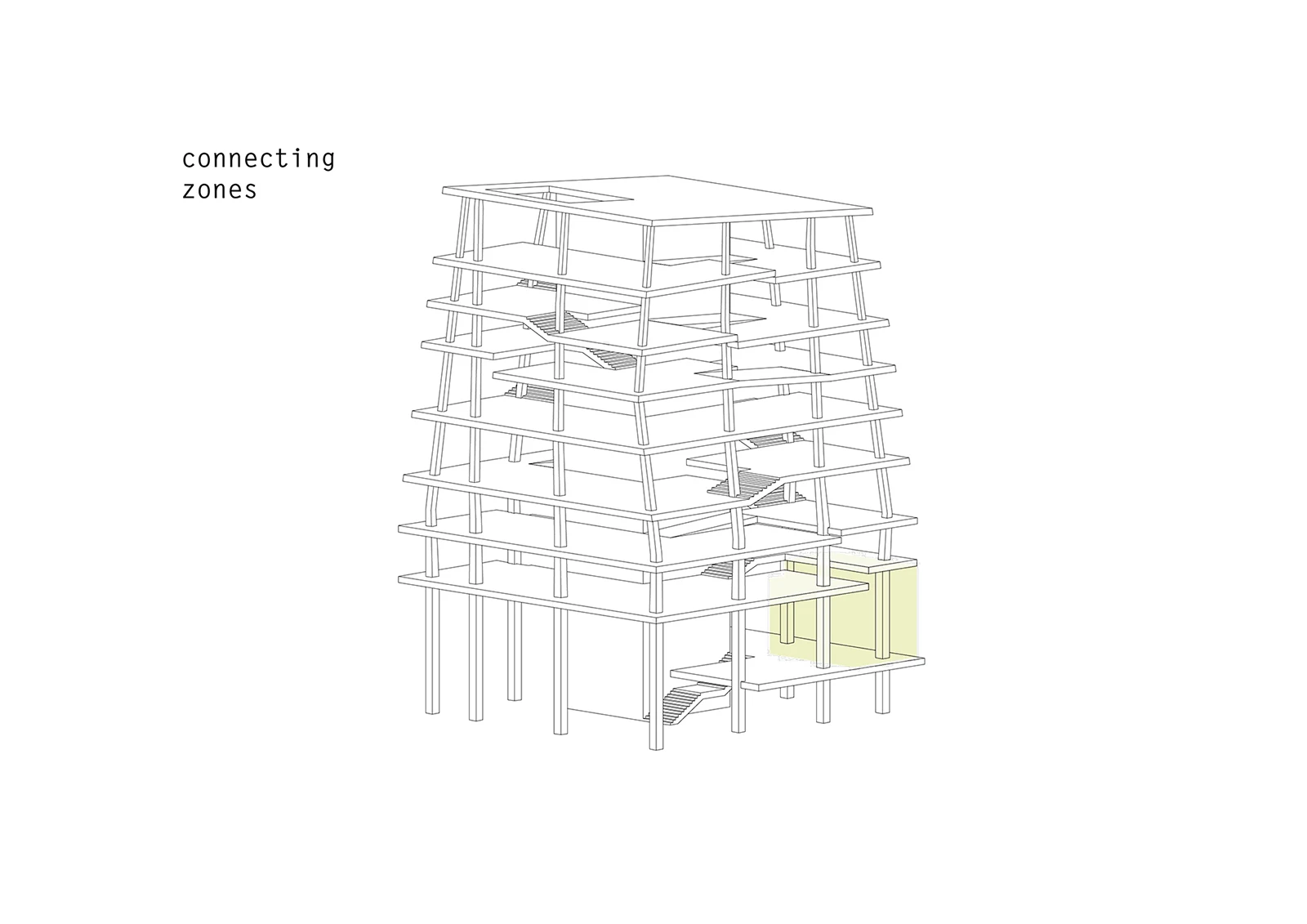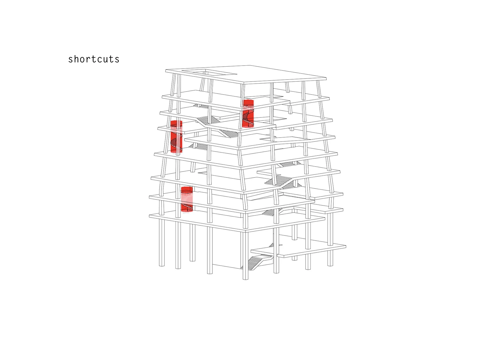 Over nine floors, spaces for learning and working are seamlessly linked within a highly flexible and adaptable landscape, where social spaces and living rooms allow guests from all over the world to feel welcome and form complex networks. Both the internal structure and the exterior convey the idea of interconnectedness.