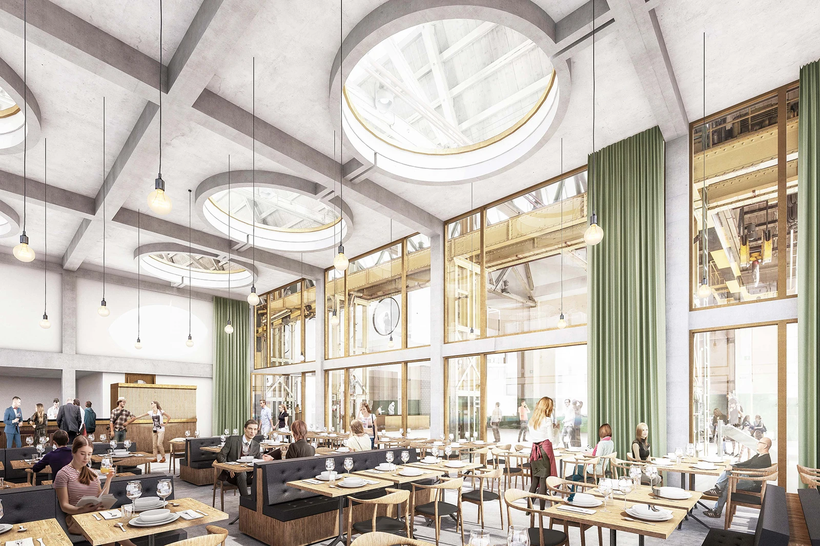 Das Restaurant im Südwesten orientiert sich zum Dialogplatz hin und schafft mit attraktiven Aussensitzplätzen einen Bezug zum öffentlichen Aussenraum des Gesamtareals. Im überhohen Raum, der geprägt ist von einer klaren Betonstruktur mit integrierten Glasoberlichtern, ist ein ortsspezifisch urbanes Gastronomie-Erlebnis möglich.