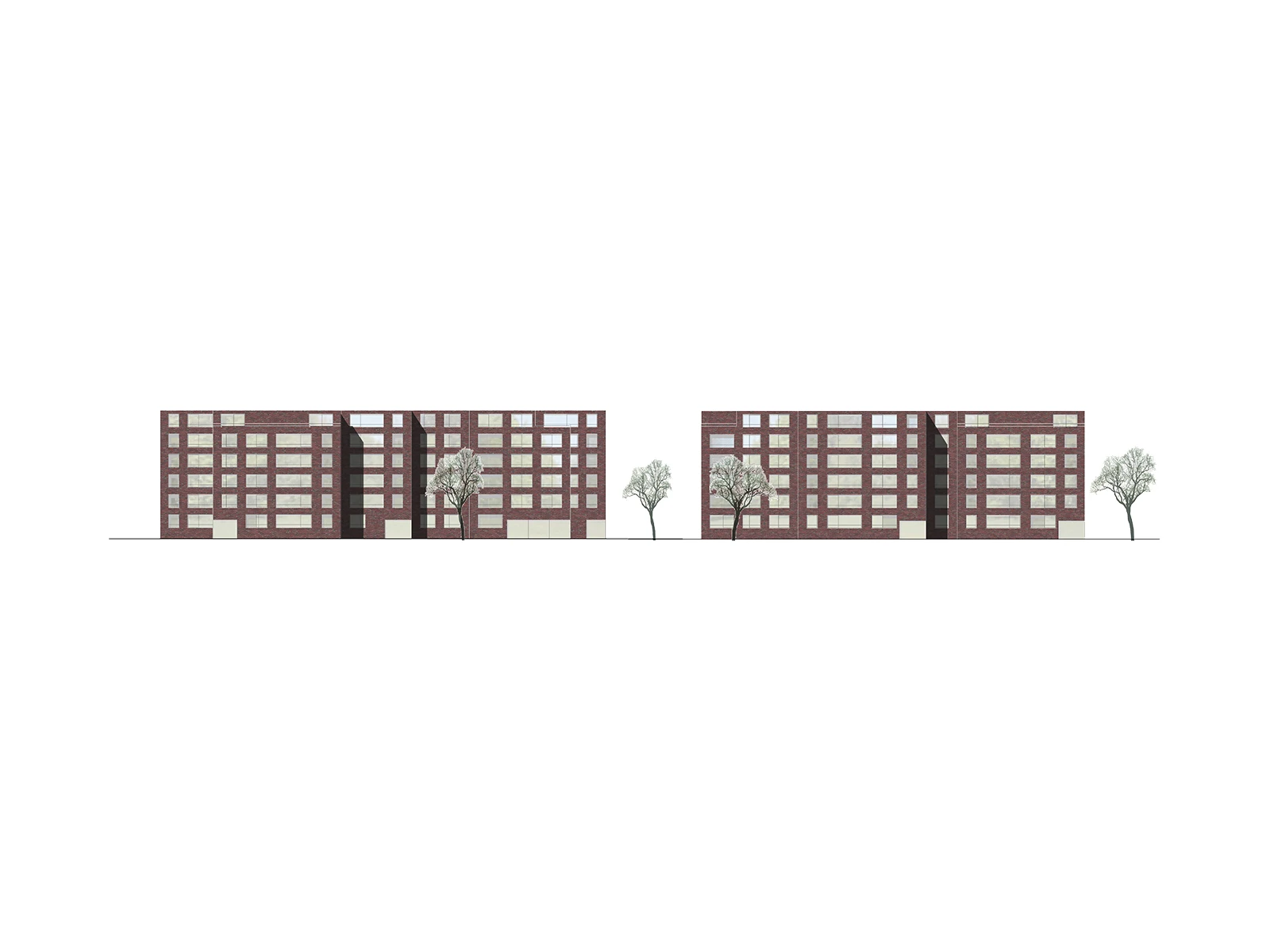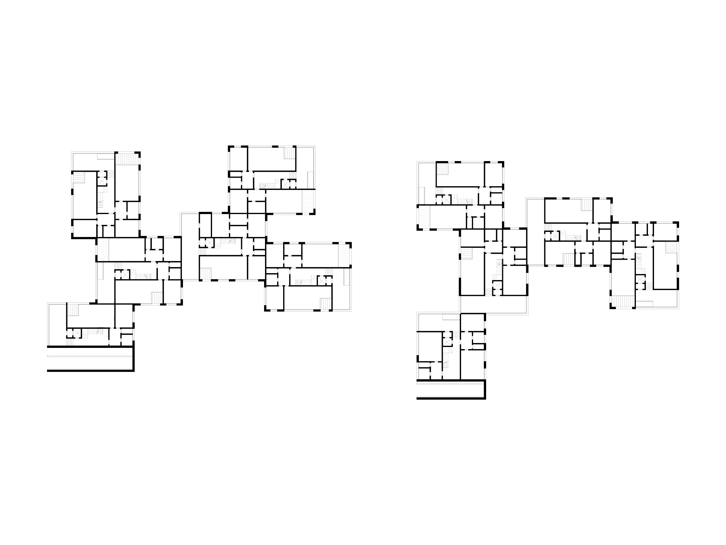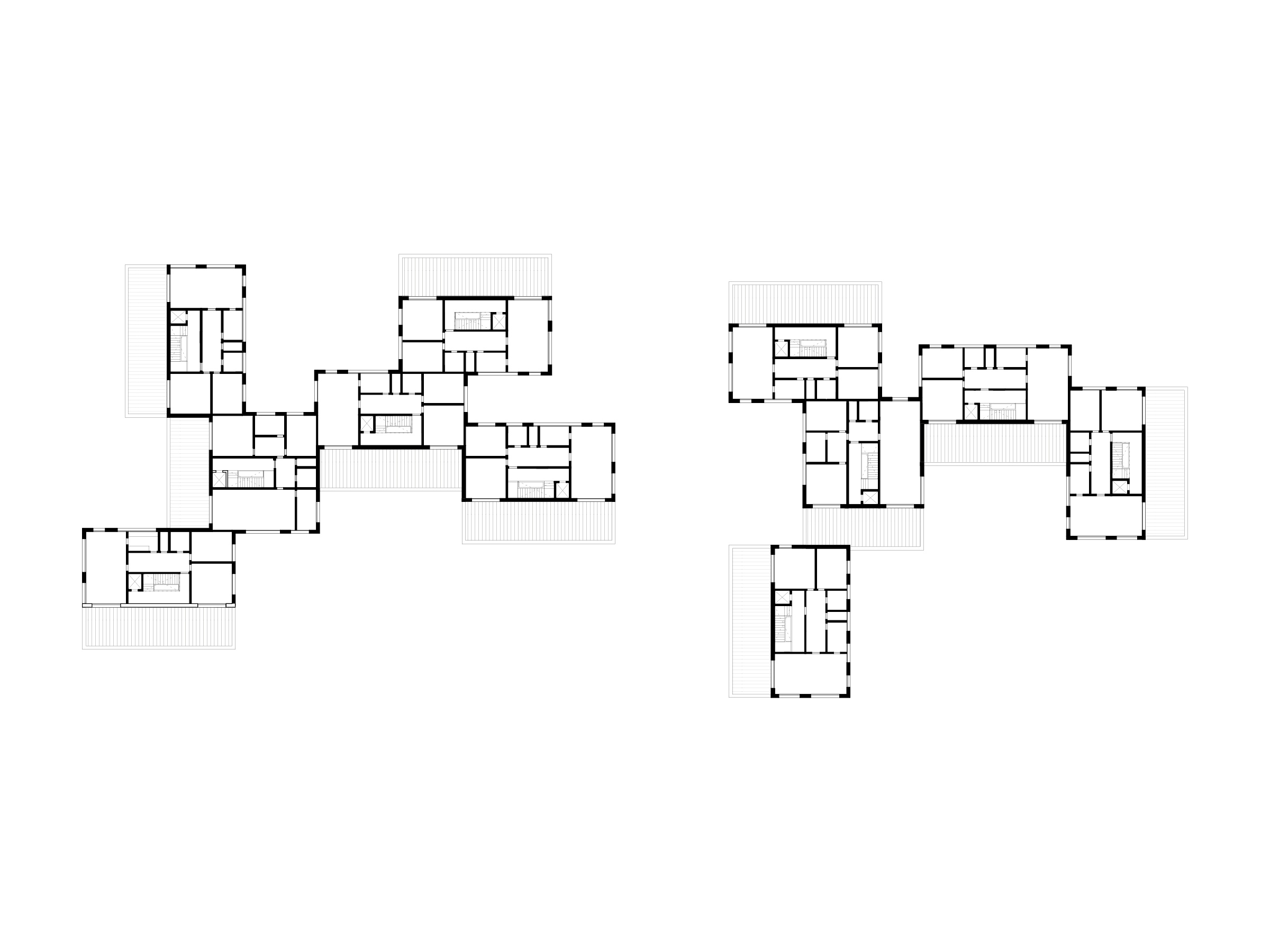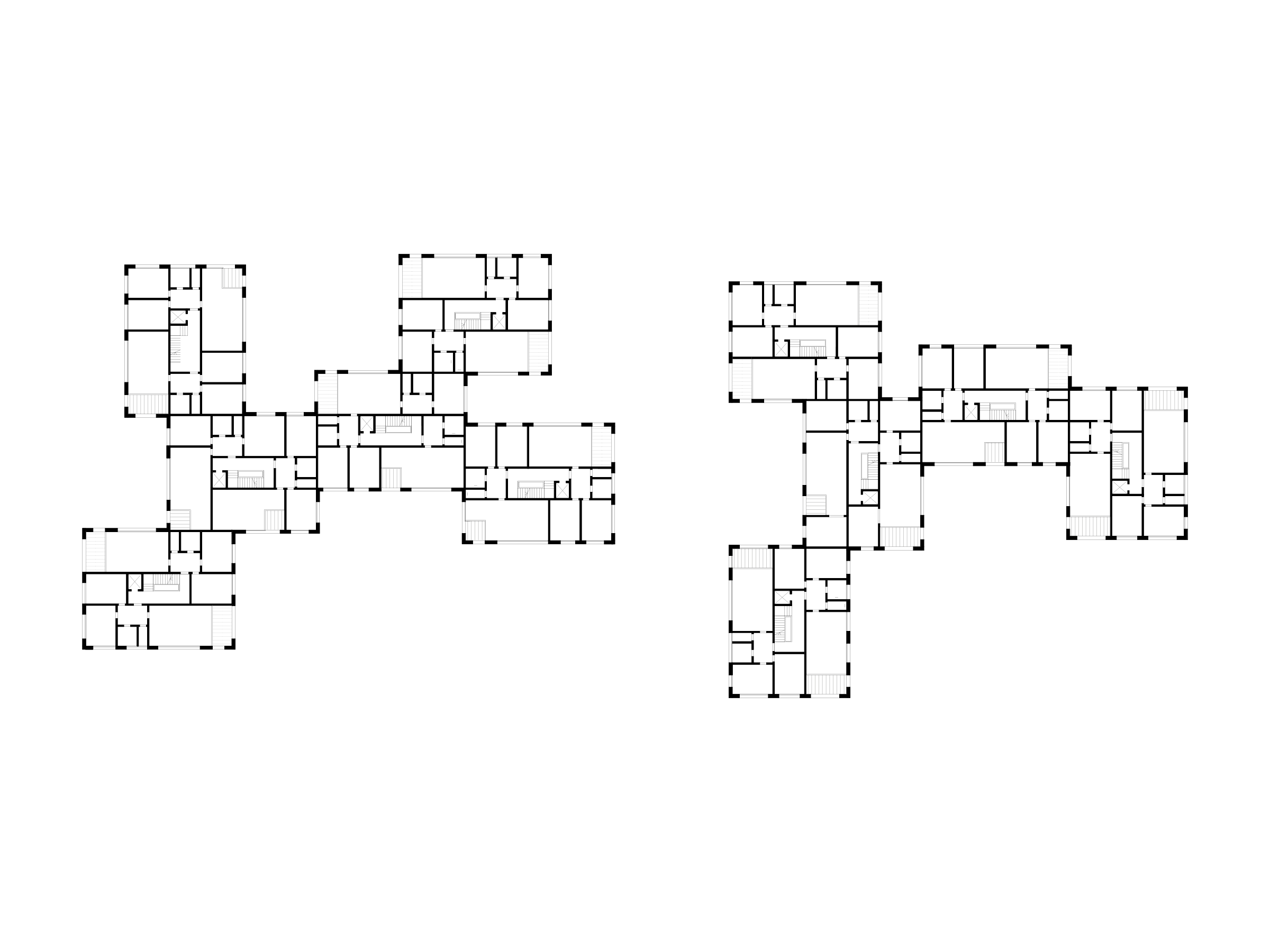 The specific morphological shape of the proposed buildings is primarily defined by a single "house" component, replicated at scale. Despite their size, each large-scale structure emphasizes its single "house" volume, as a distinct solitary shape in the green space. Each apartment, facing at least two directions, is accessible through their volume. Spacious, light-filled entrance areas lead to a park and direct residents toward the main staircase and elevator.