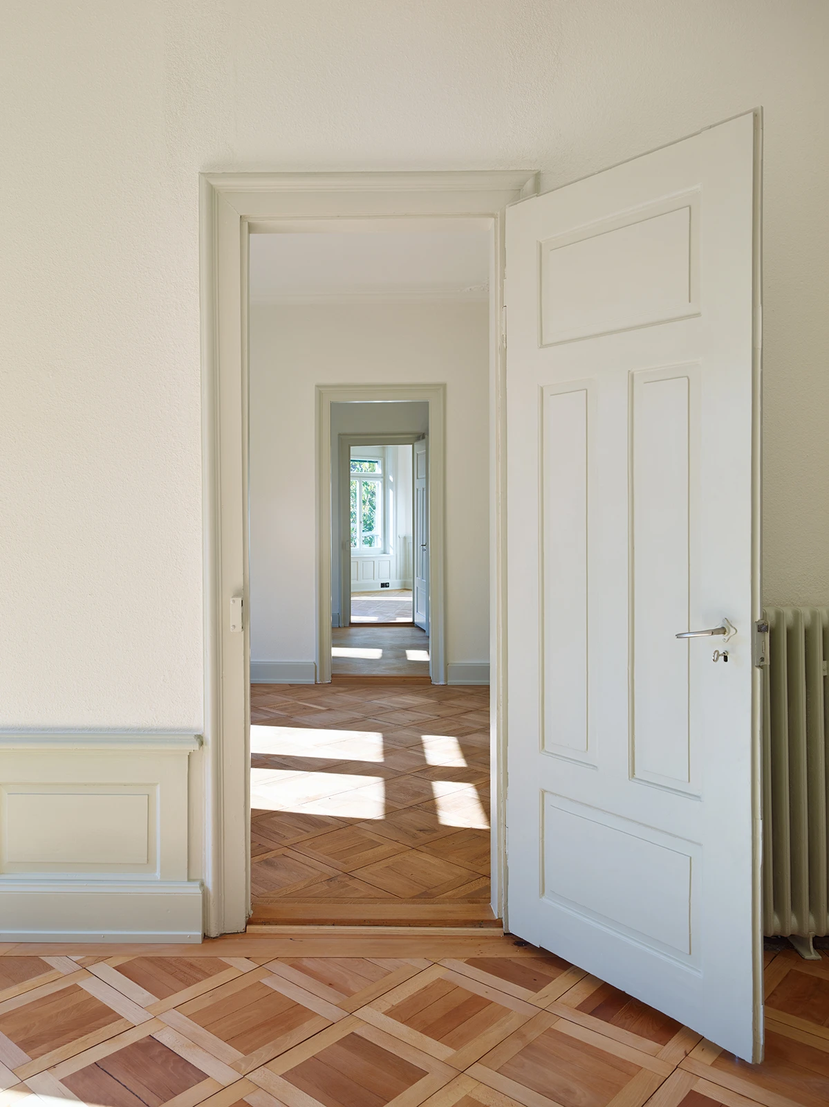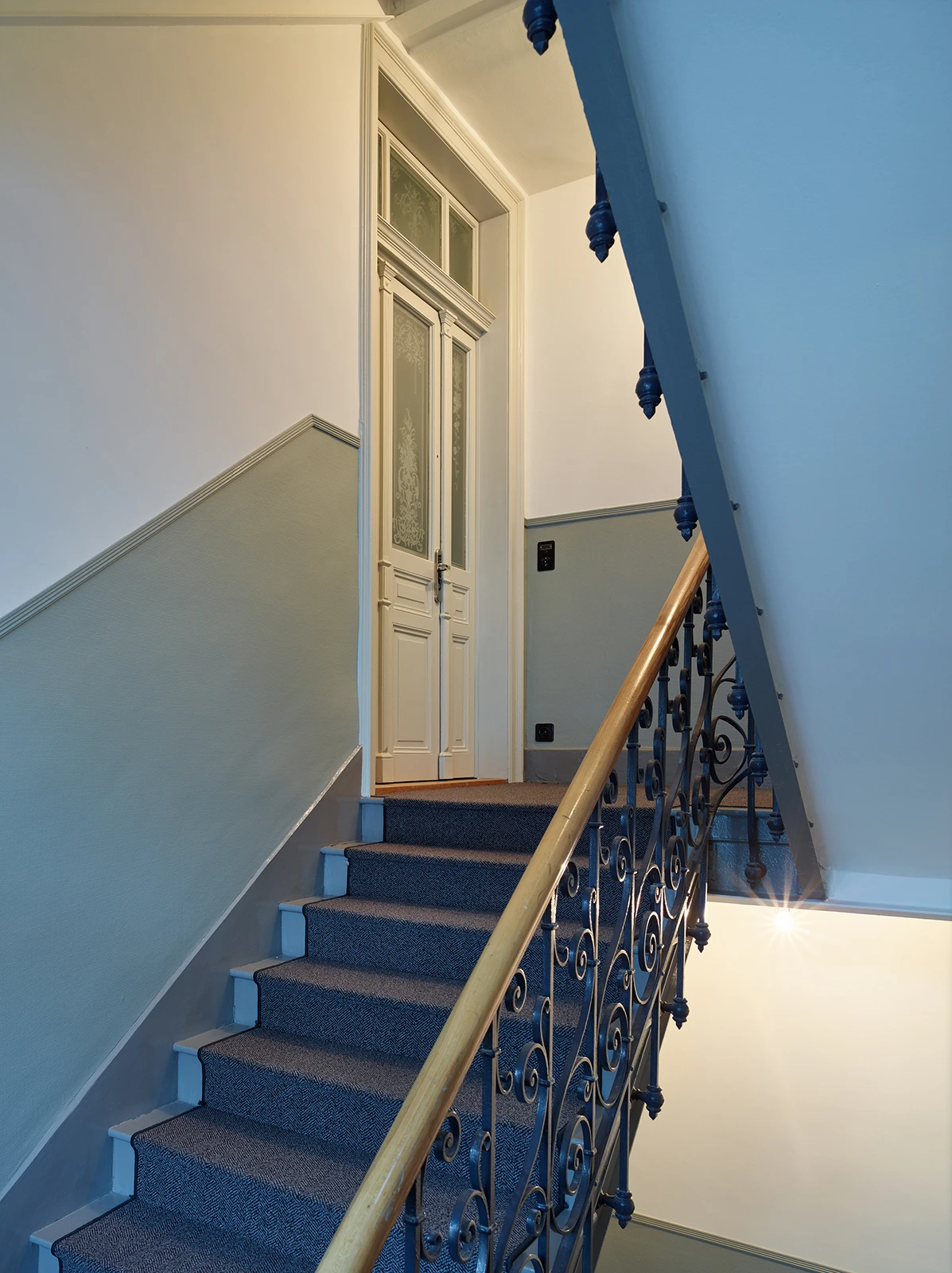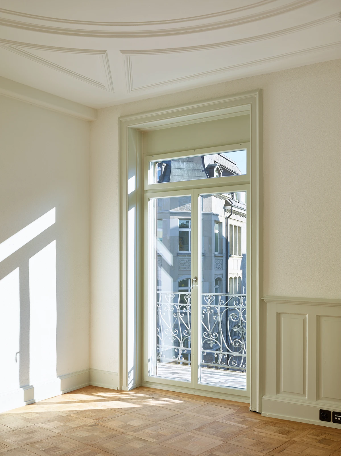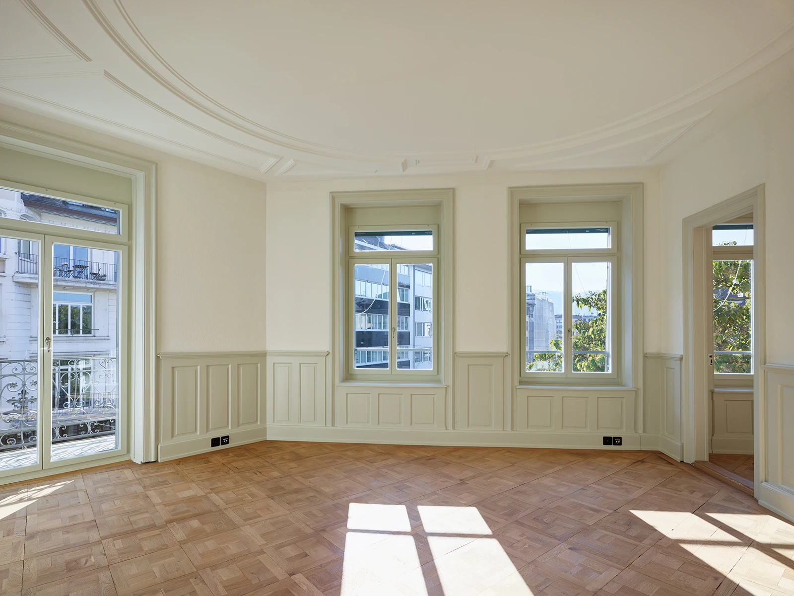 In der Renovierung des Mehrfamilienhauses wird die architektonische Essenz bewahrt. Die historische Bedeutung des Gebäudes wird nuanciert und respektvoll mit modernem Wohnen vereint.