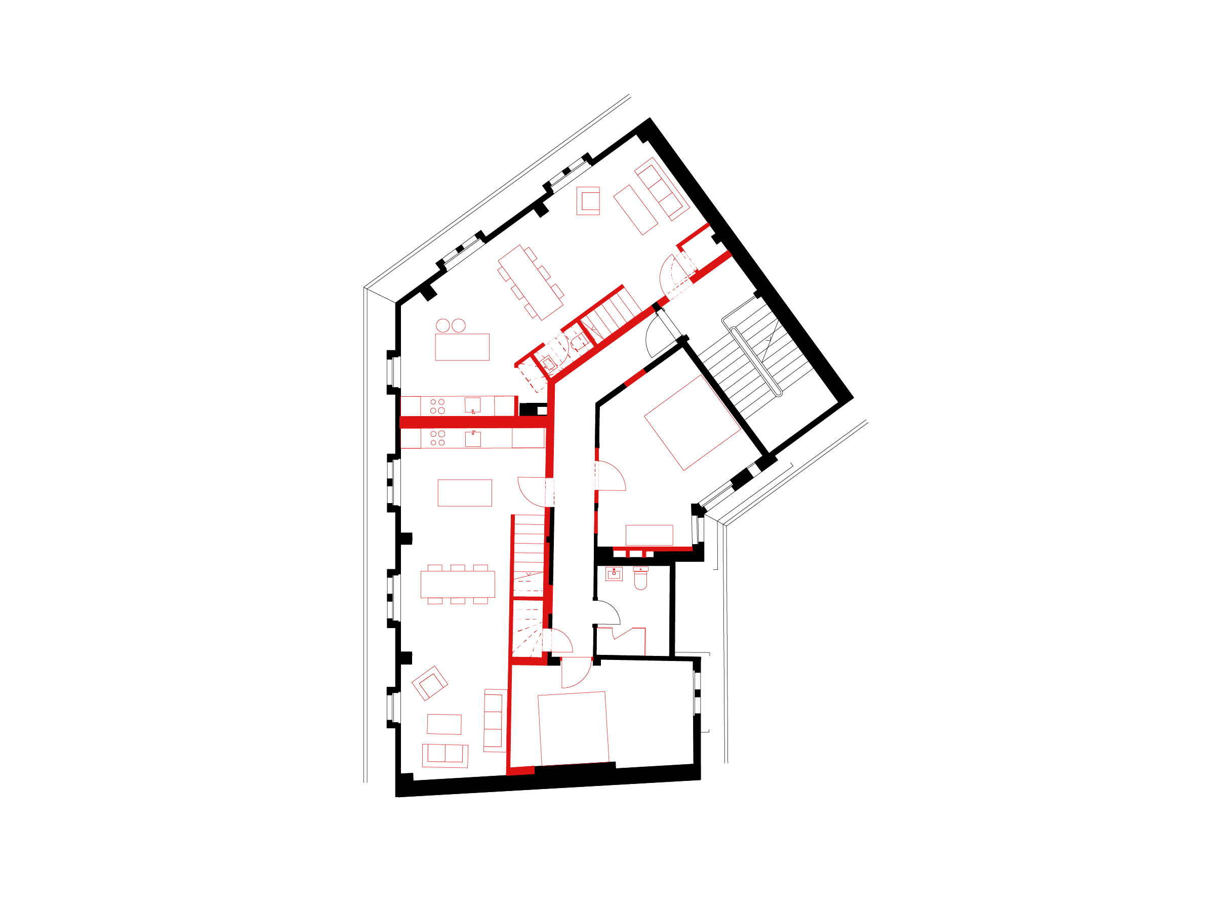 Mit Einbezug des Estrichs entstehen anhand Spillmann Echsle’s Renovierung aus einer Wohnung zwei neue Maisonette-Wohnungen. Die quartiertypische Dachzinne wird den beiden Maisonette-Wohnungen als private Aussenräume mit direkten Ausgängen zugeschlagen. Relevante Anlagen, wie auch Bäder und Küchen die nicht mehr heutigen Ansprüchen Genüge tragen, wurden durch die sanfte Sanierung hochqualitativ den heutigen Bedingungen entsprechend angepasst.