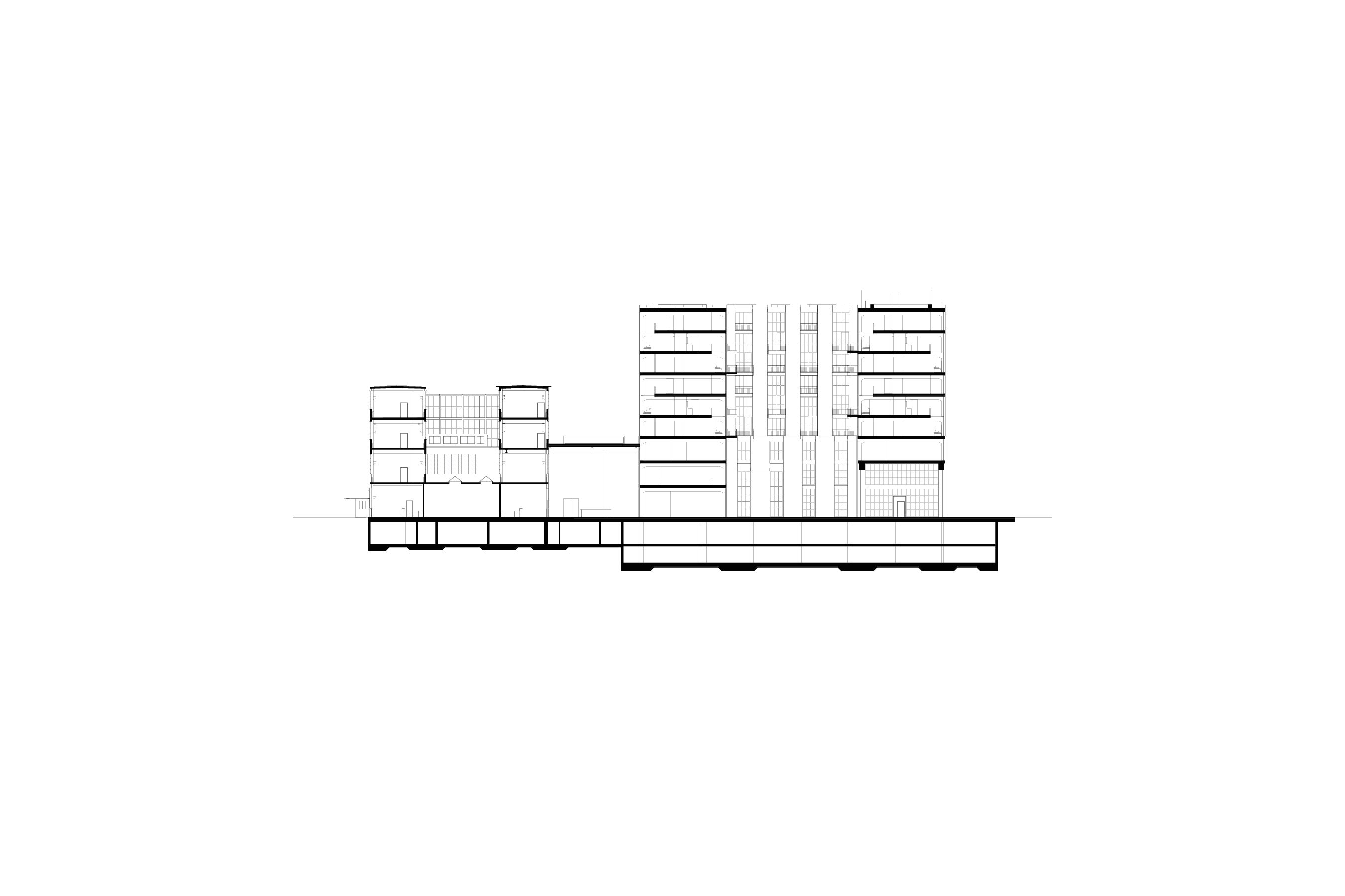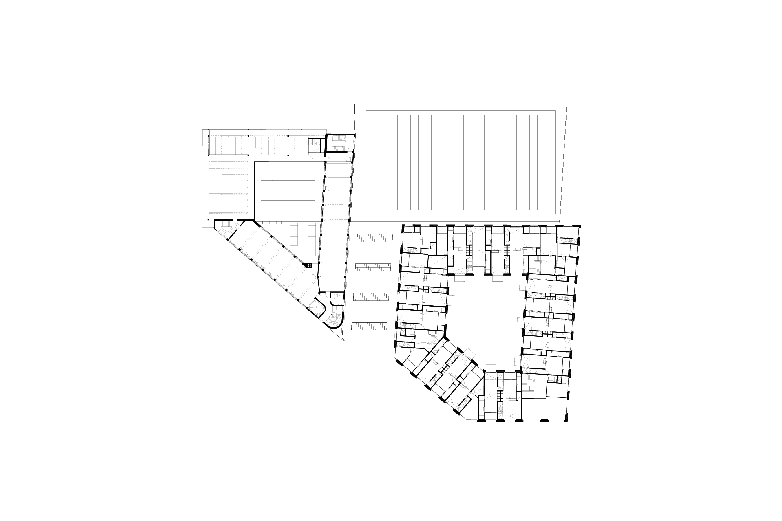 The structural design of the building incorporates an industrial aesthetic with doubled-up ribs, which provide rhythm and order to the façade while enabling flexibility in the interior layout. The spaces between these ribs contain either bathrooms or circulation cores, an organizational rigor reflected in the exterior design by the vertical banding of precast concrete elements. Bronze-colored glazing, loggias, and balconies are interspersed between these bands, forming a balanced and discrete exterior. Next to the new intervention, an extension to Building K will also feature a distinctly industrial aesthetic with ribbed floor slabs visible behind a glazed façade.