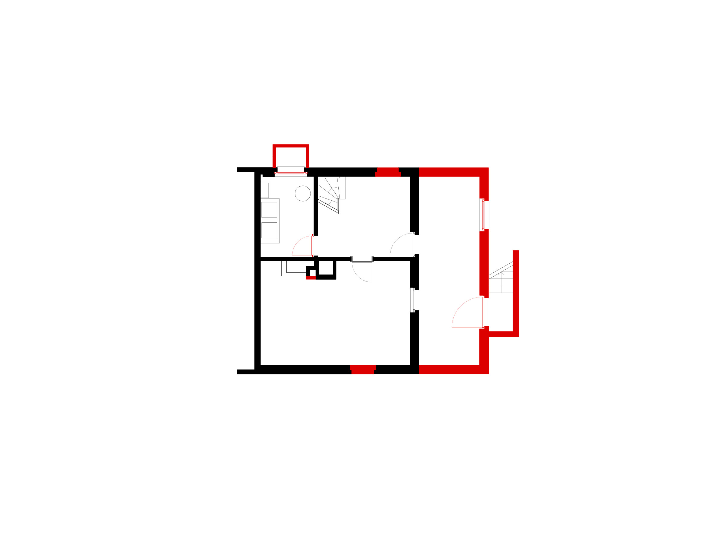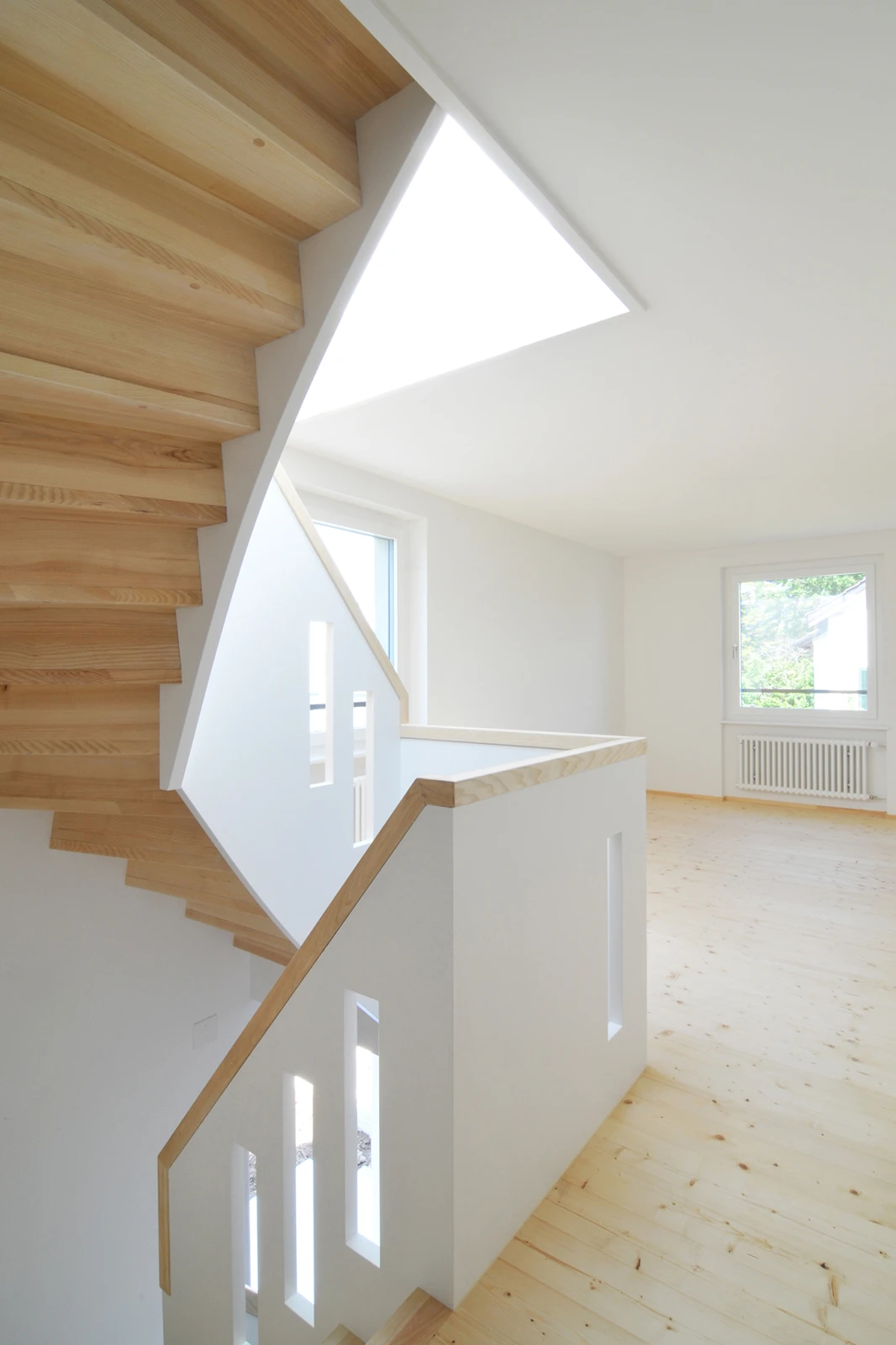 The ground floor now accommodates a spacious living and dining area with a kitchen. The newly acquired space upstairs is used for an additional children's room and a spacious informal room directly connected to an open stairway. The slightly elevated roof facilitates the transformation of the attic into an expansive primary bedroom with a separate bathroom. The new staircase, a new, central architectural element in the house, fluidly connects the various floors. Two large skylights infuse the interior with unexpected generosity and natural light, offering skyward views and a sense of spaciousness. The careful selection of materials used in the interior, such as the oiled spruce floors and custom-made solid doors, references the home's history.