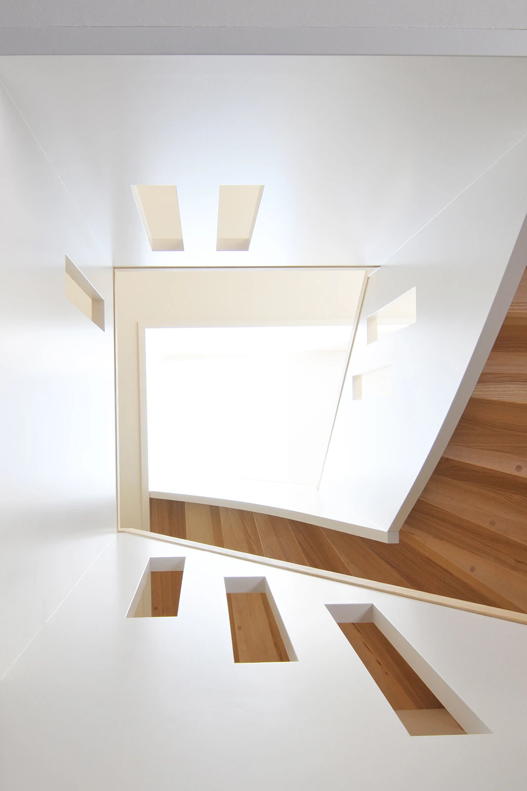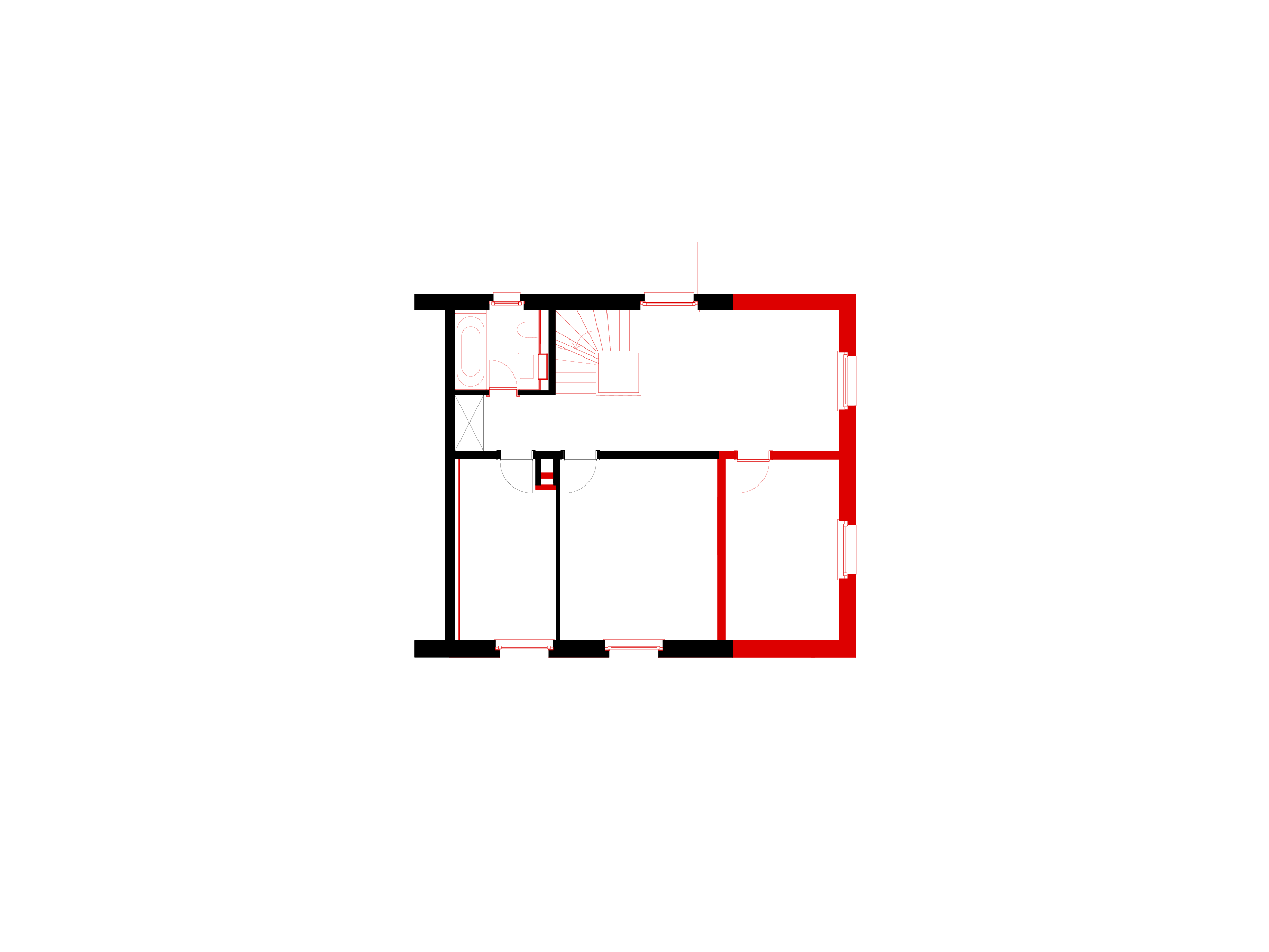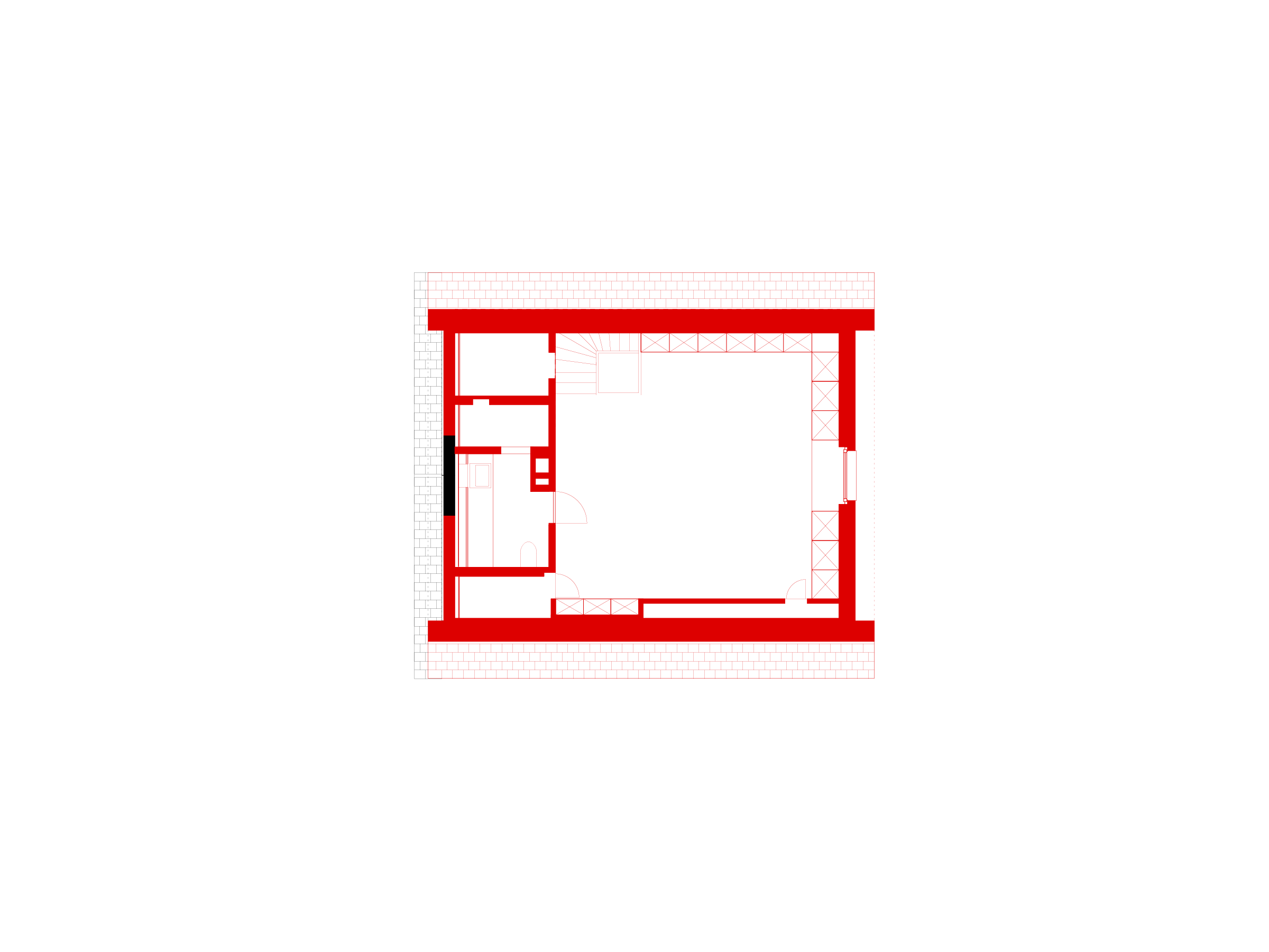 Large windows maintain an open, unrestricted view of the outside. Interventions on the facade interface with classical 1940s elements; shutters are alternately placed to the left or right of the windows, and subtle differences in granularity and color of the plasterwork draw attention to the distinctive features of the facade.ubtle differences in granularity and color of the plasterwork draw attention to the distinctive features of the facade.