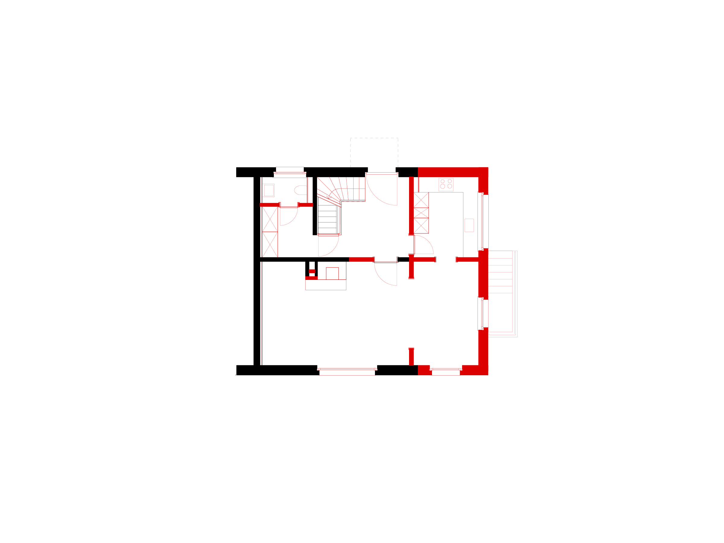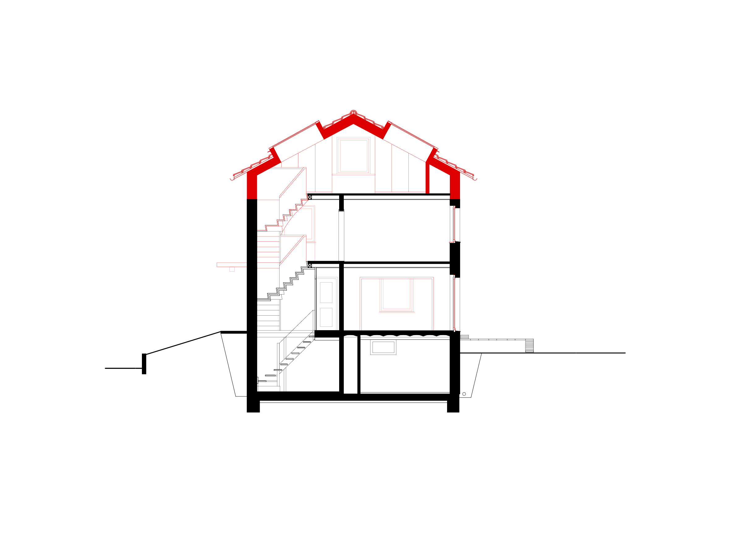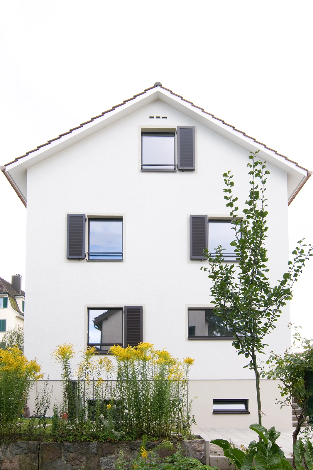 The existing detached single-family house, built in 1945, is set back from the street next to another property in a quiet residential area in Kilchberg, Zurich. To adapt the small house to meet the current needs of a young family, the building volume is increased to the full extent allowed under local zoning laws. By raising the roof and extending the width of the structure, the overall size was increased without altering its impact on its surroundings.