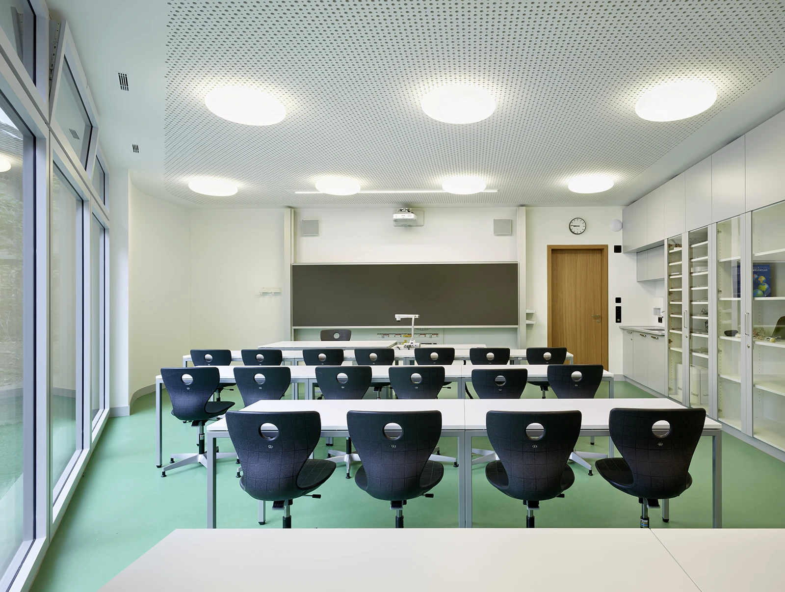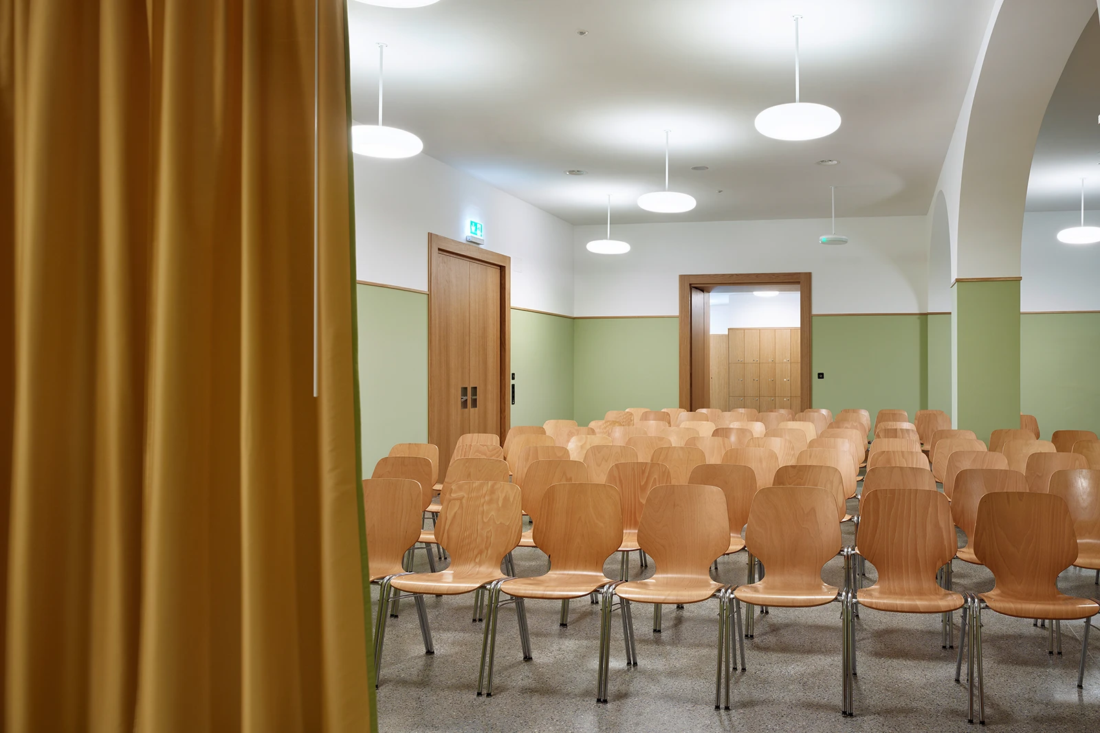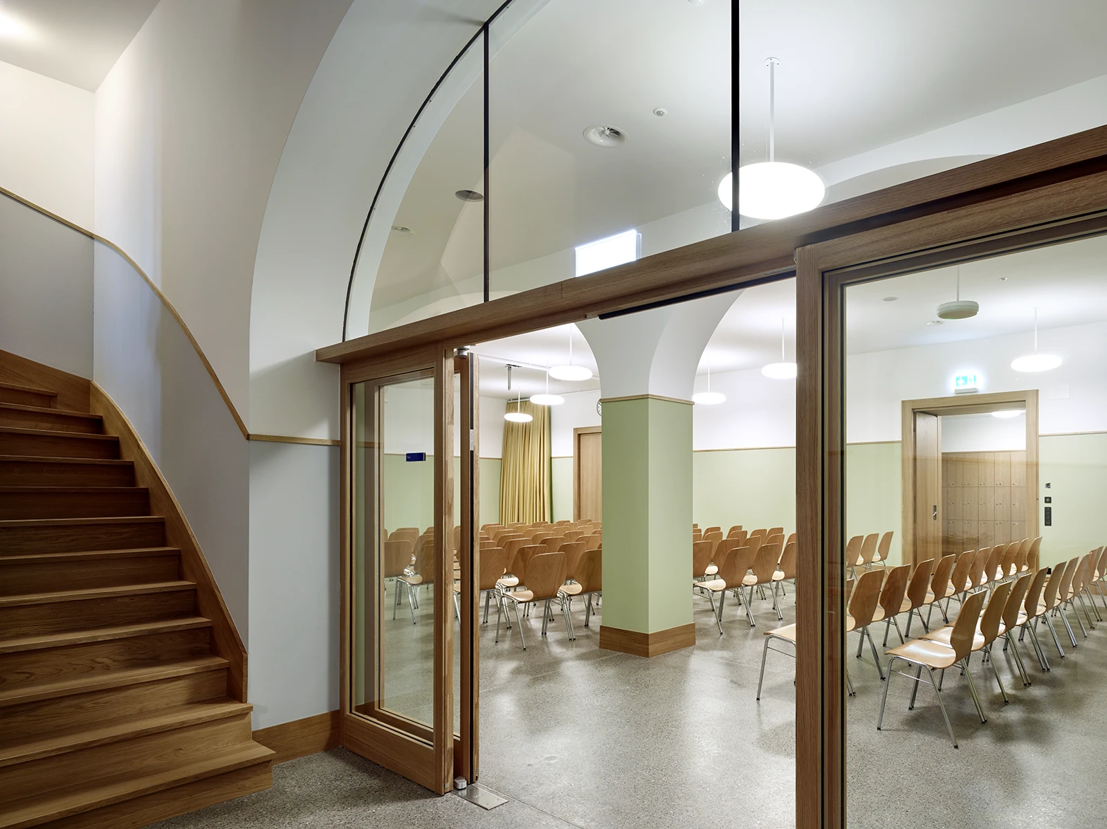 Correspondingly, a plinth frames and encloses the older building, accessible through an extension of the existing staircase, as well as through a garden entry. The original connection linking the carriage house to the auditorium has been reopened through the historical, vaulted corridor, revealing its preserved stone framework and elevating the assembly hall as the focal point. Precisely placed openings in the historic outer wall create an intricate interplay between the auditorium and its subterranean extension. Classrooms, amorphously curved, are juxtaposed between communal rooms and private offices. A landscaped garden flourishes above this newly updated space on the roof of the new building.
