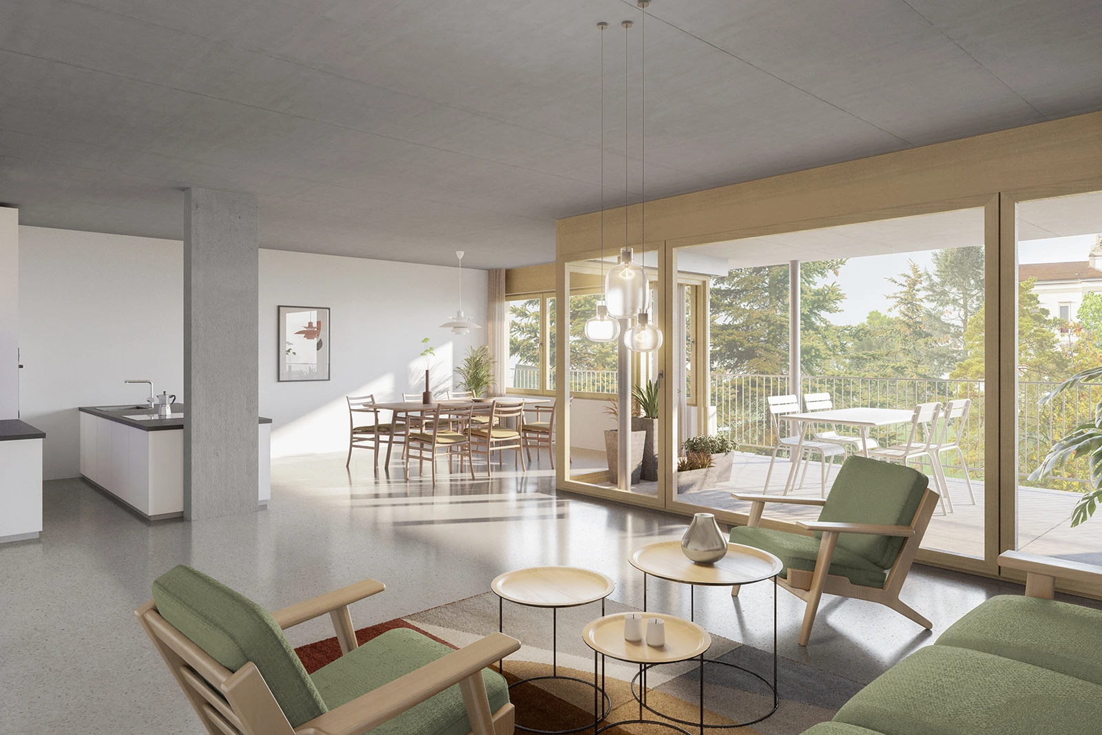 Interventions include adding one and two additional floors, respectively, and new balconies. Facades will undergo renovations to enhance energy efficiency. The proposal aims to offer a more defined architectural form and contemporary exterior spaces by extending the existing floor slabs in the living areas. The exterior walls will be insulated and adorned with rear-ventilated, pre-fabricated concrete panels, while the reddish wooden windows will warmly contrast the fiber-cement cladding.
