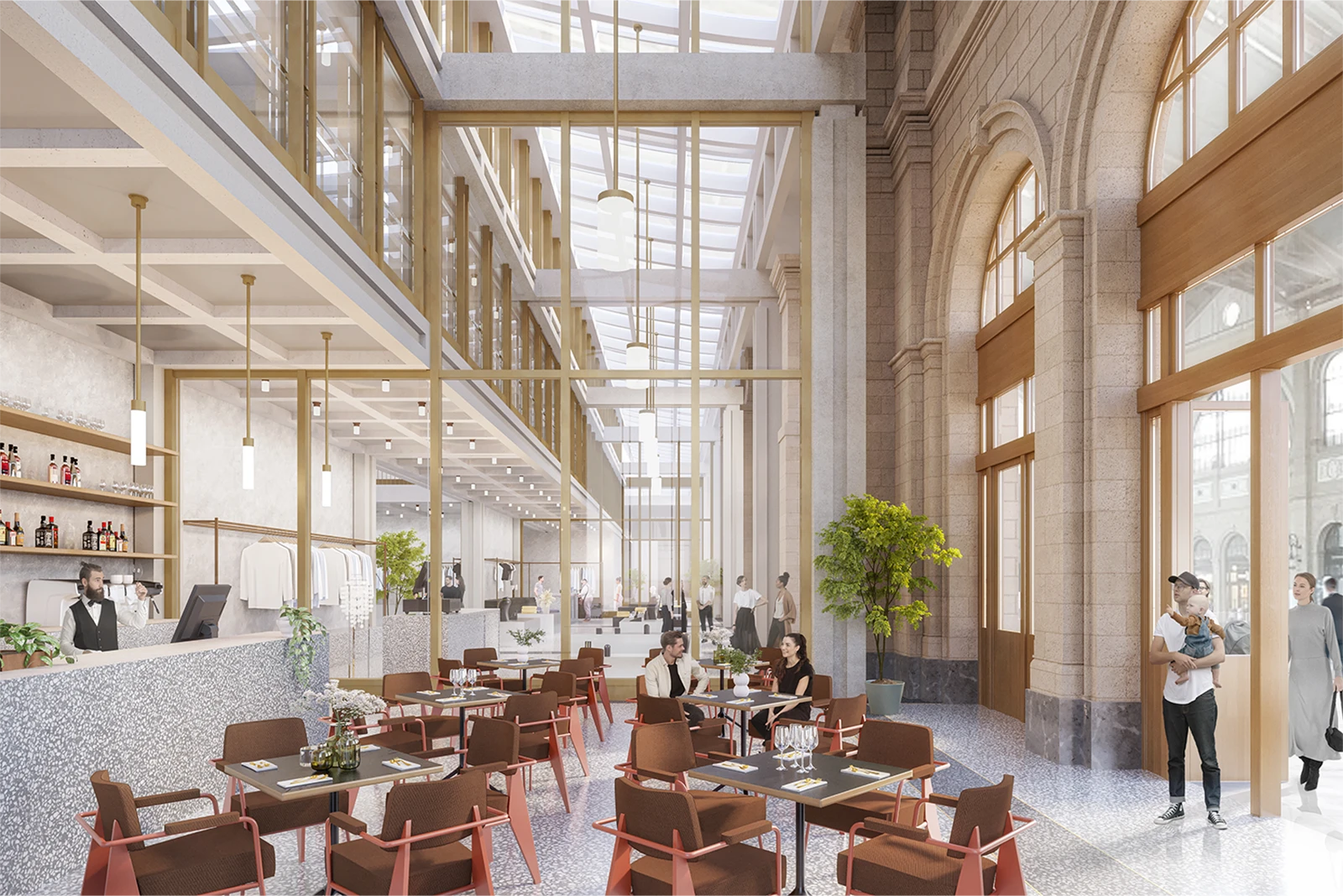 New retail spaces were made available in areas of the north wing of Zurich Main Station. An updated plan proposes the addition of a new food and retail area arranged around the existing atrium and allows for efficient circulation via a central staircase spanning two floors.