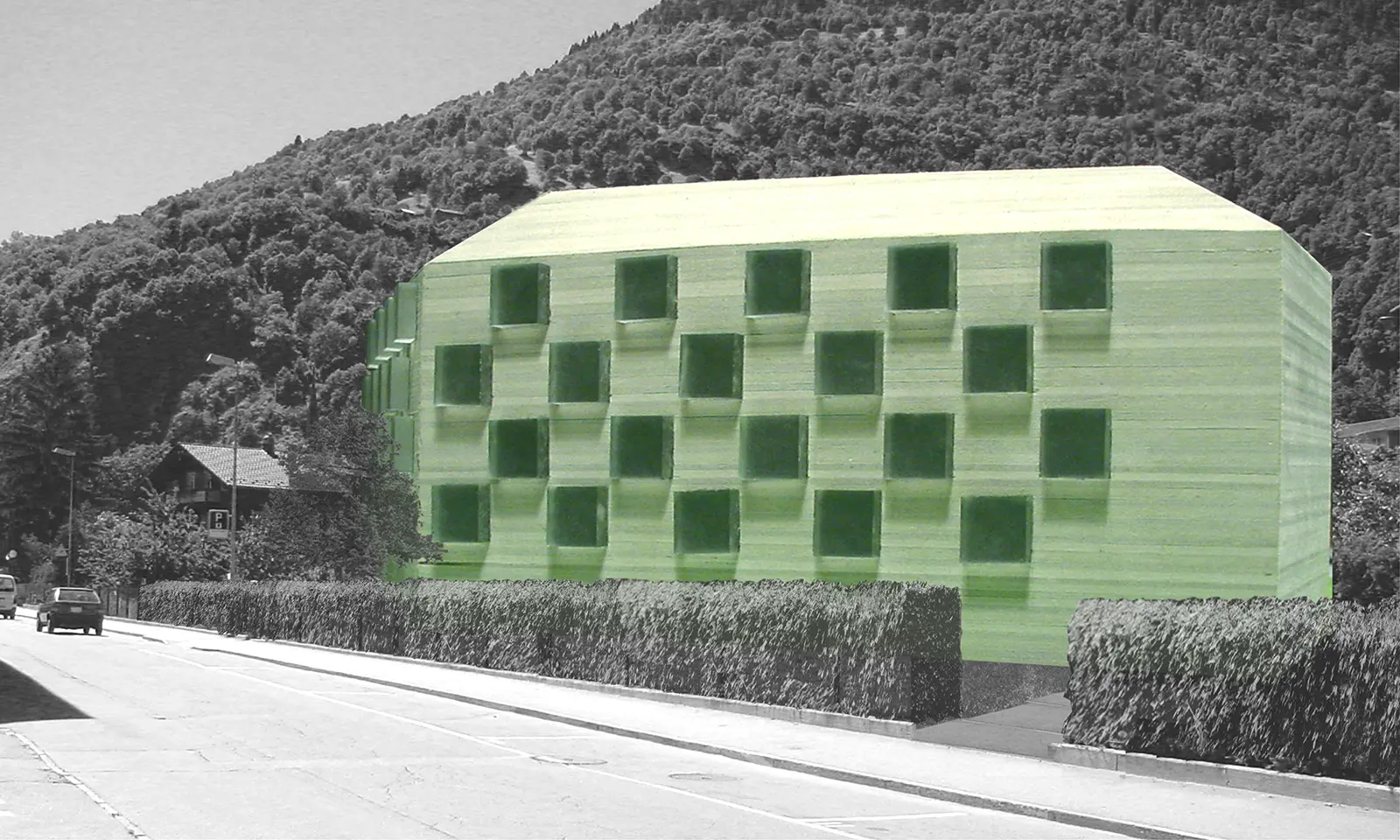 The elongated, curved structure, leaning towards the slope, refers in form and scale to an existing senior residence.