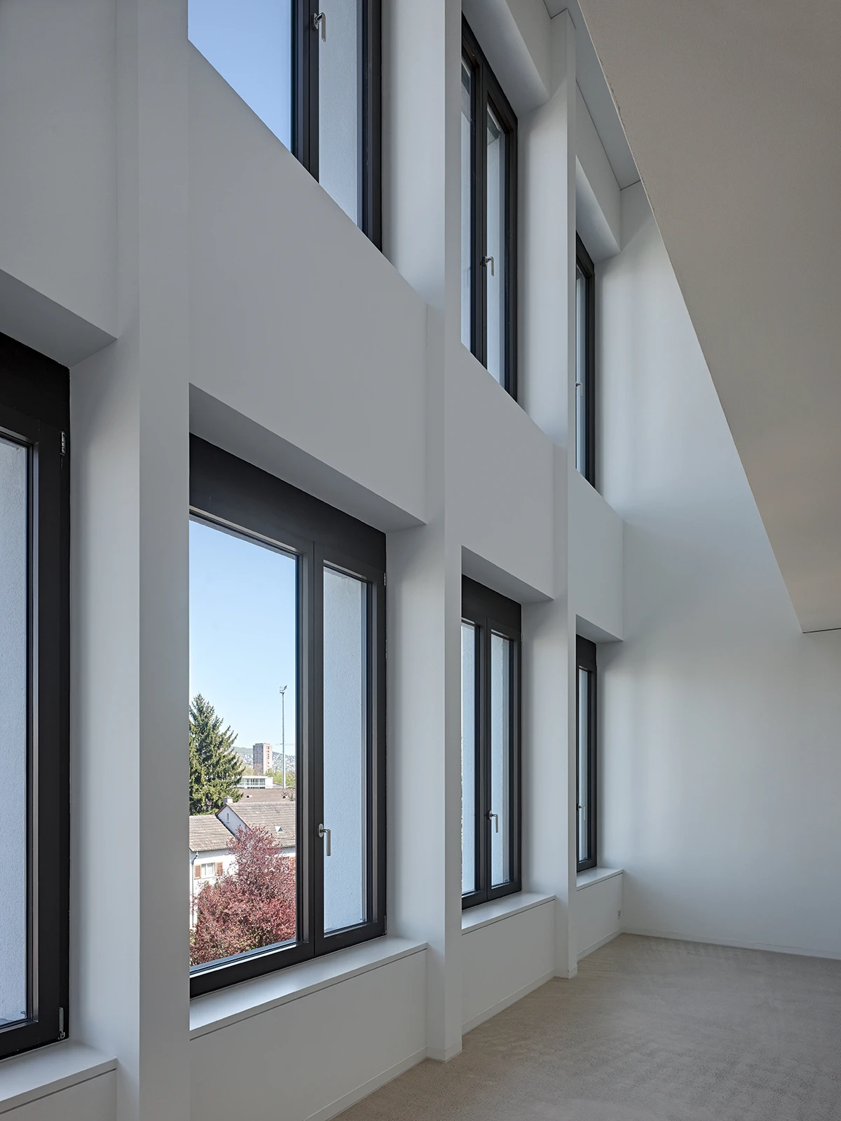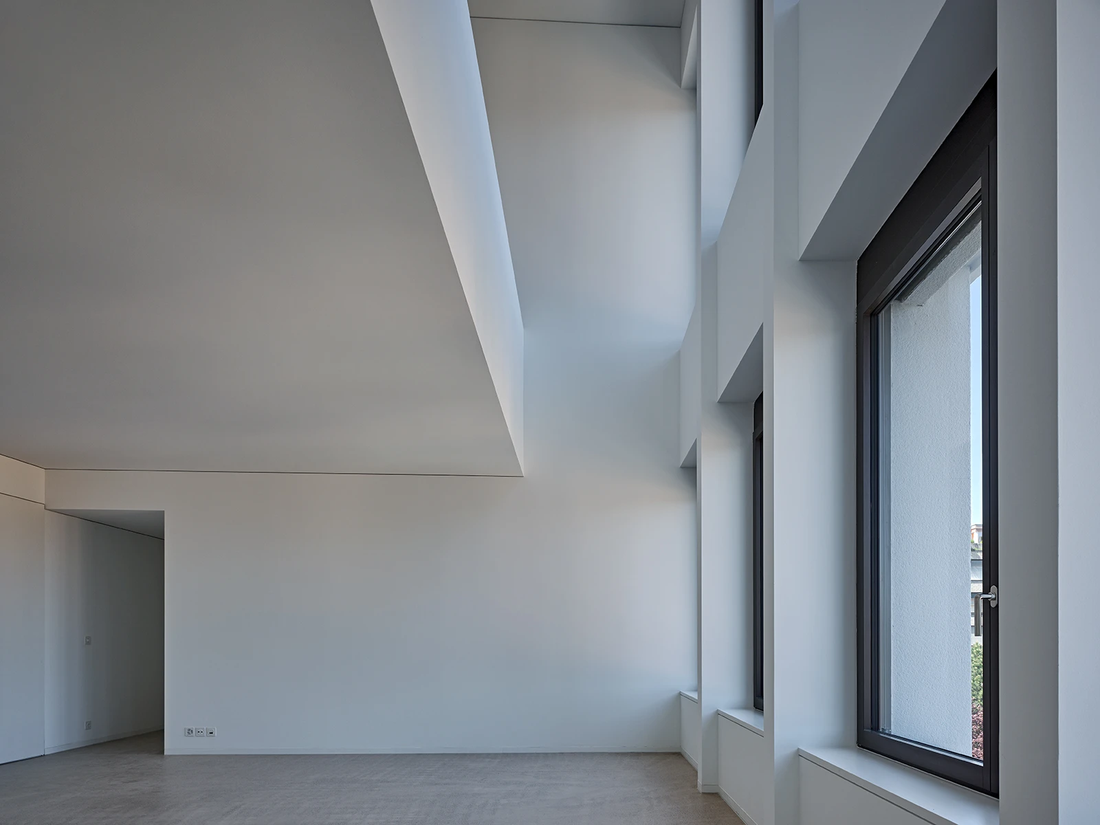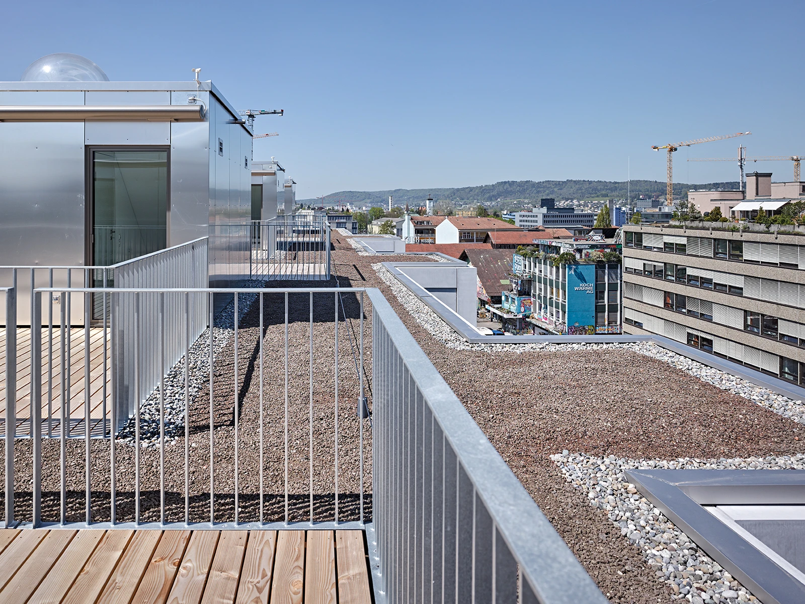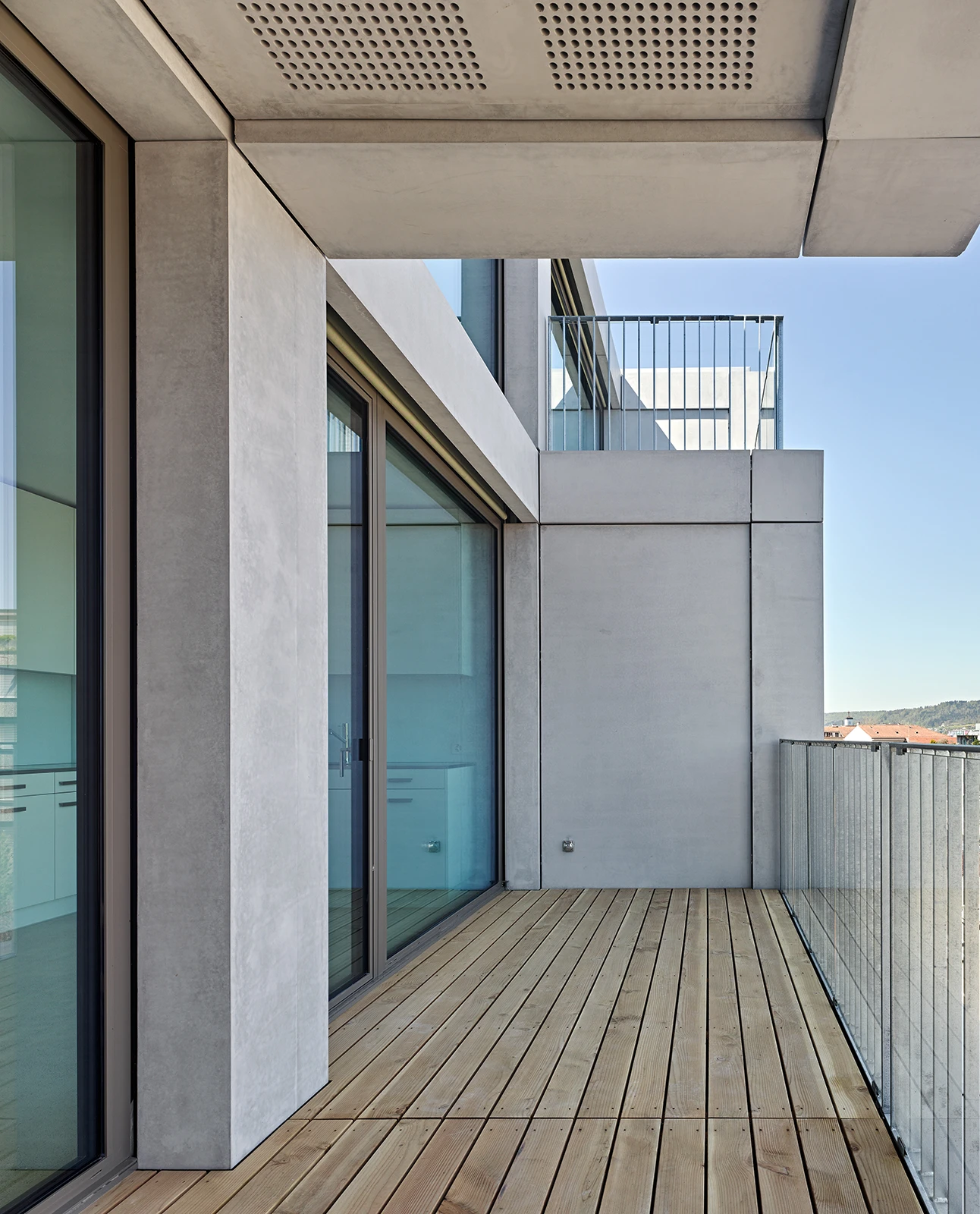 Although the extension’s structure appears simple and clear at first glance, the individual duplex flats are intricately interwoven. In addition to the spatial variation of the two basic types, this also allows the 17 apartments to be orientated towards the building’s calmer rear side. The spacious living and sleeping rooms extend outside as terraces. The unit’s vertical organisation inside offers the spaciousness of a small townhouse: depending on the type of apartment, the internal staircase leads down one storey to the converted building structure on the 3rd floor or up to the new 5th floor. All units are accessed from the 4th floor by a single internal corridor, a rue intérieure, which is illuminated centrally via vertical shafts, referred to as light cannons. The façade appears urban and reflects the extension’s internal organisation. The low-detail cast fibre-cement panels are durable and create a link back to the foundation’s solid structure.